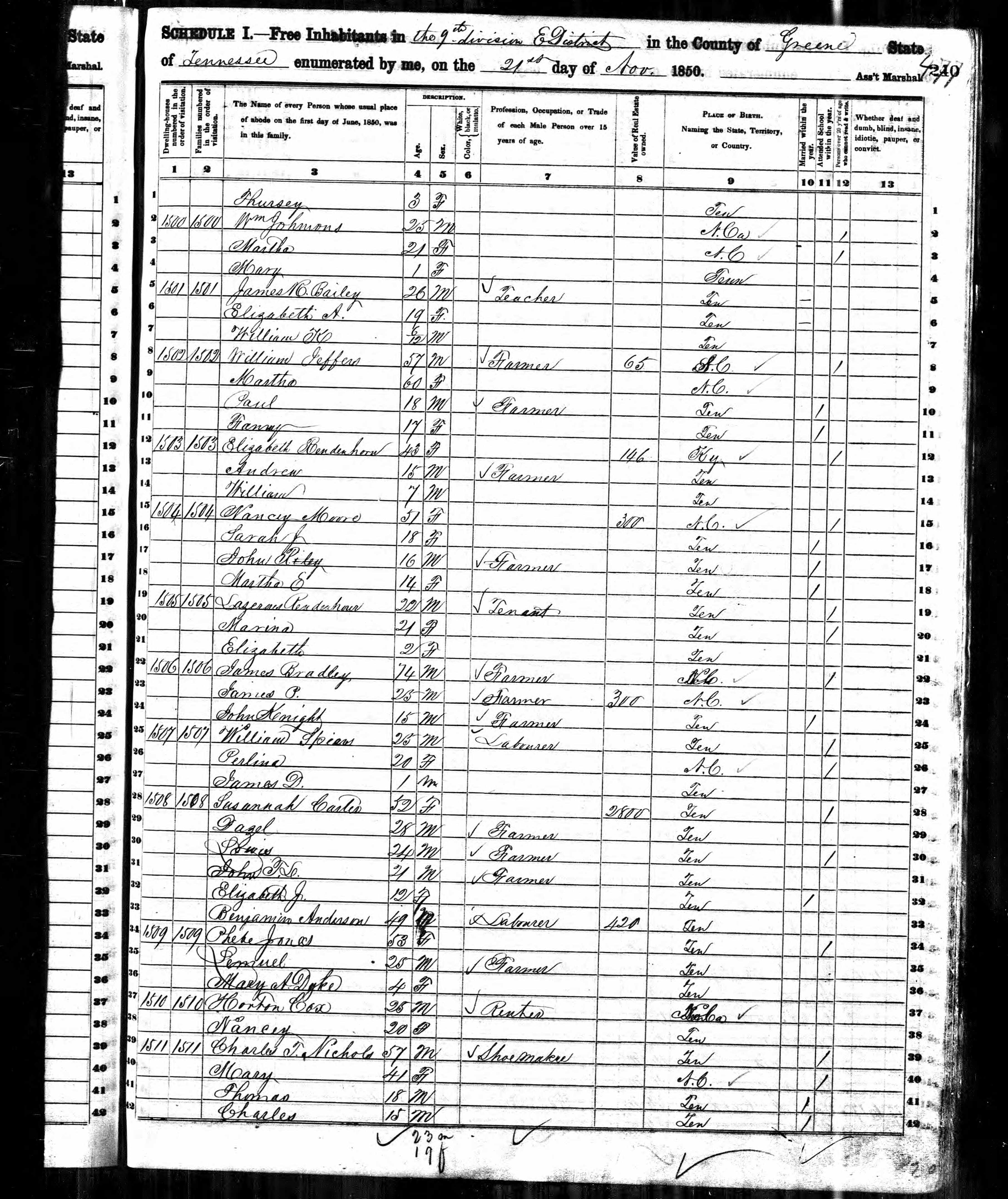 9th Division Eastern District, Greene County, Tennessee, 20 Nov 1850