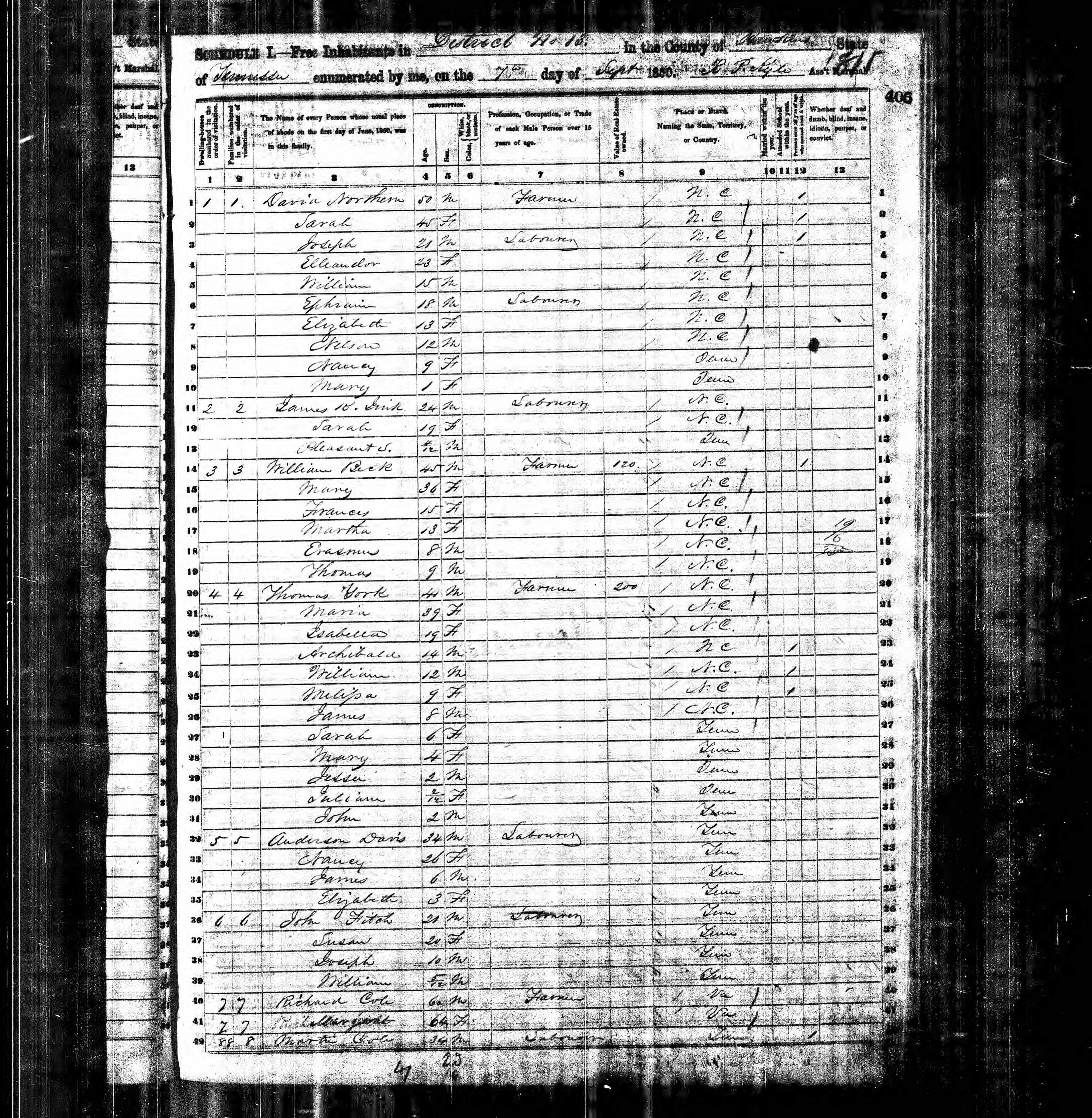 Dist.15, Hawkins County, Tennessee, 26 Sep 1850