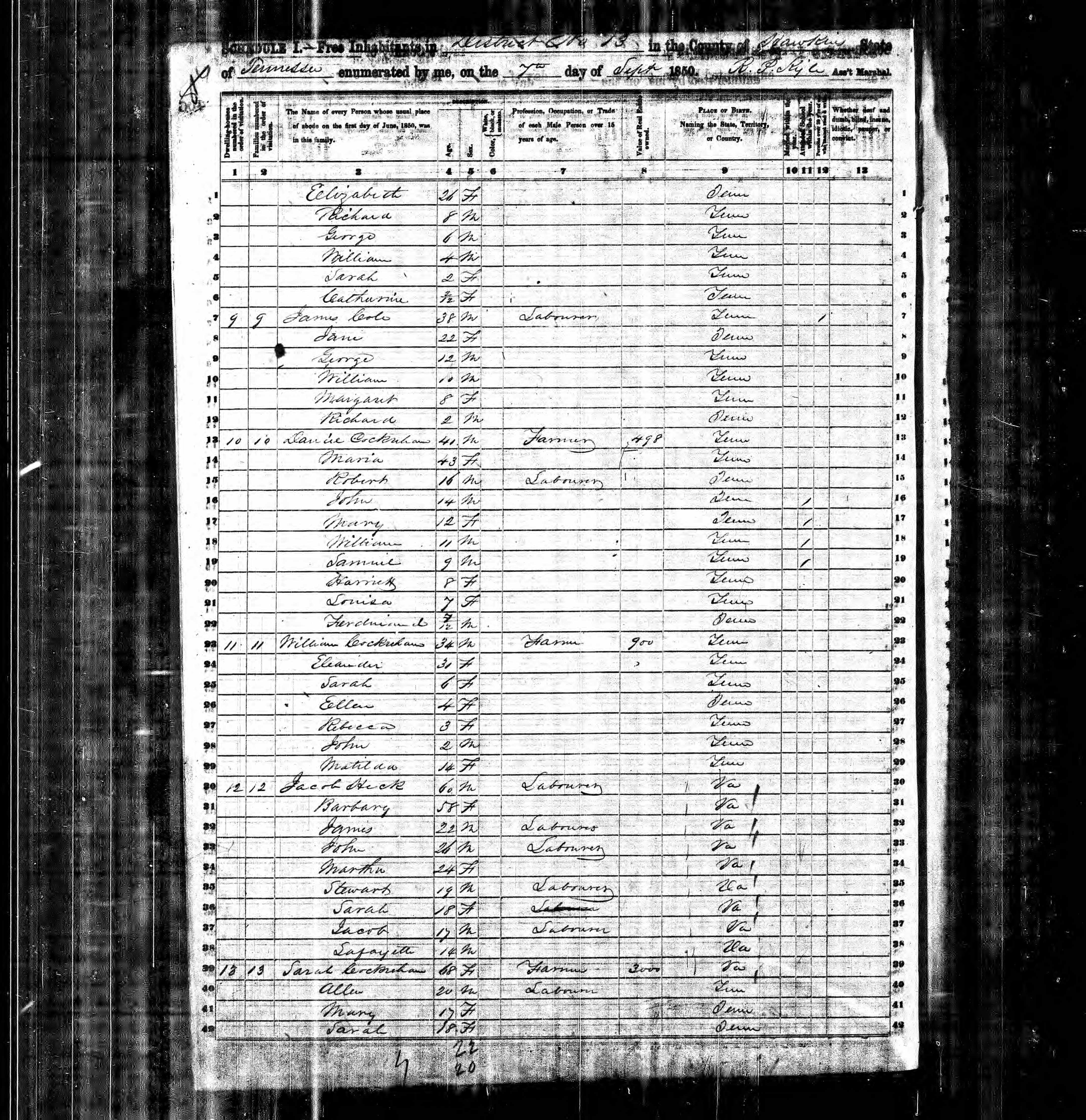 Dist.12, Hawkins County, Tennessee, 3 Sep 1850