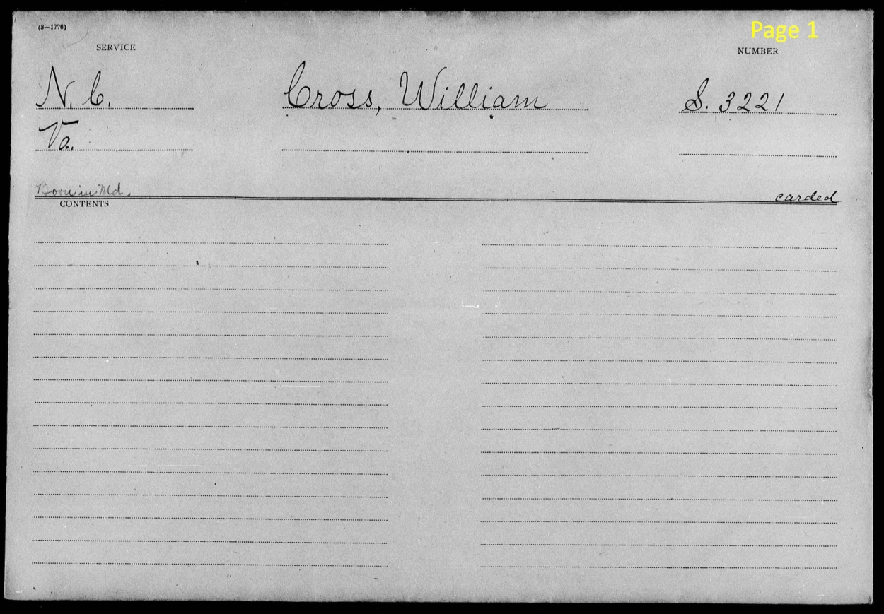 Notes on p.1: His service was listed as having been in North Carolina and Virginia, and there is a place on the form for that information. His North Carolina service was in modern day Tennessee. The note about him having been born in Maryland was added as a marginal note as there is no place for that information on the form. I do not know what "carded" means in this context. |