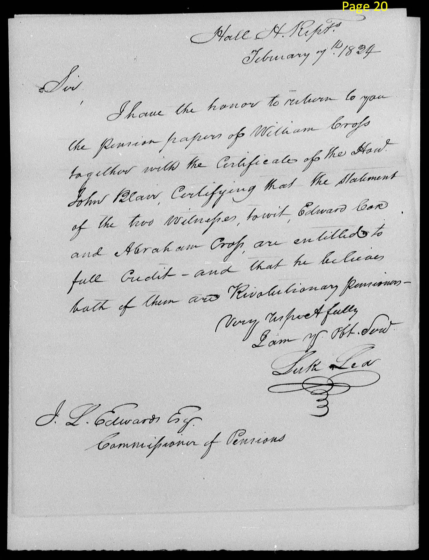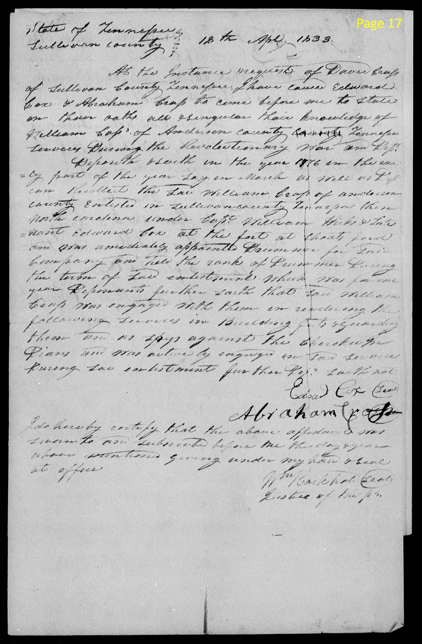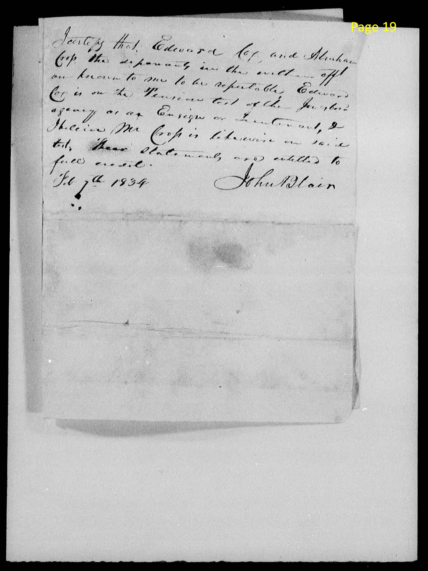 page 19 (handwritten) I certify that Edward Cox and Abraham Cross the deponents in the within affd. are known to me to be respectable. Edward Cox on the Pension roll of the Jonesboro agency as an Ensign. I I believe Mr. Cross is likewise on said roll. Their statements are entitled to full credit. Feb 9, 1834 John Blair |