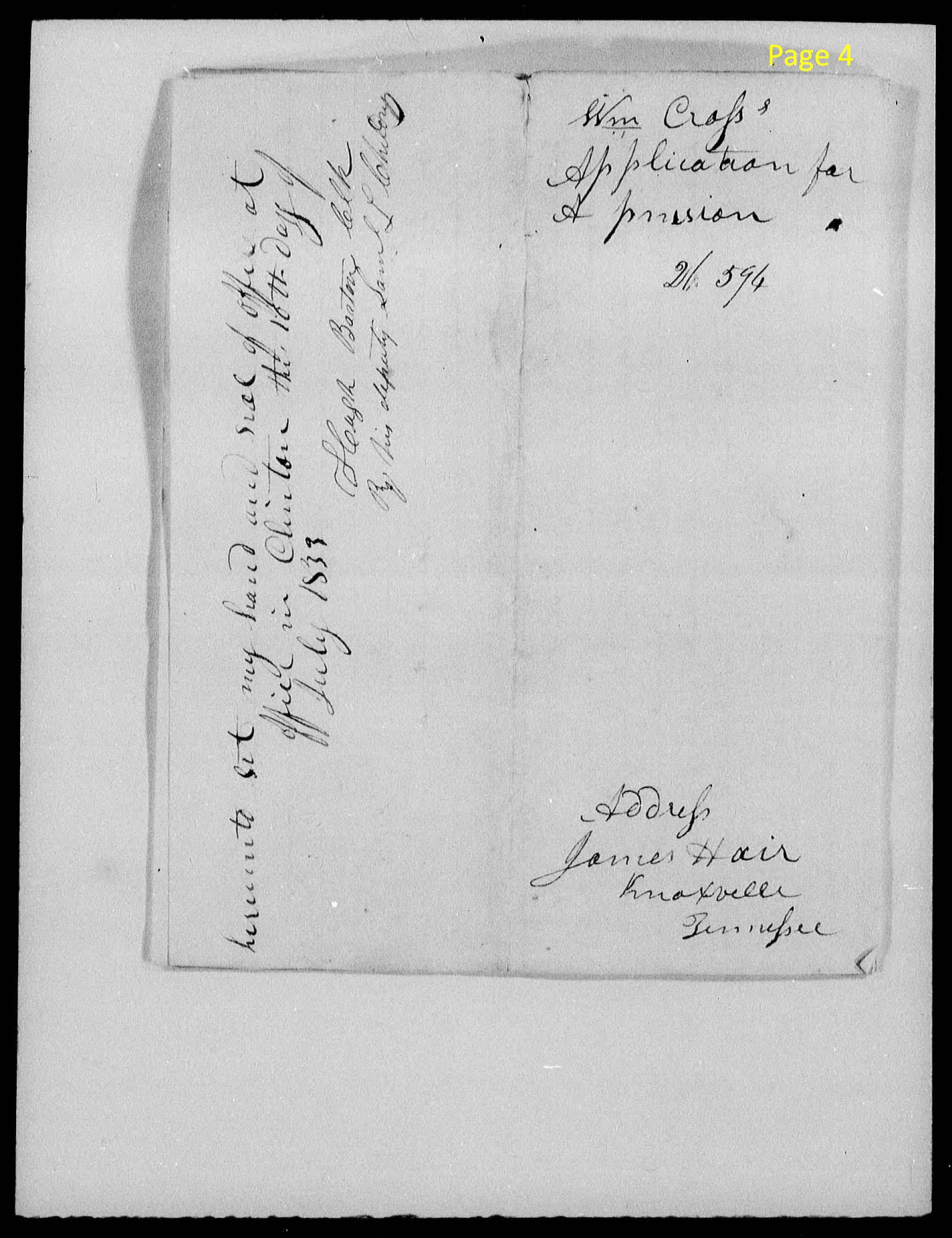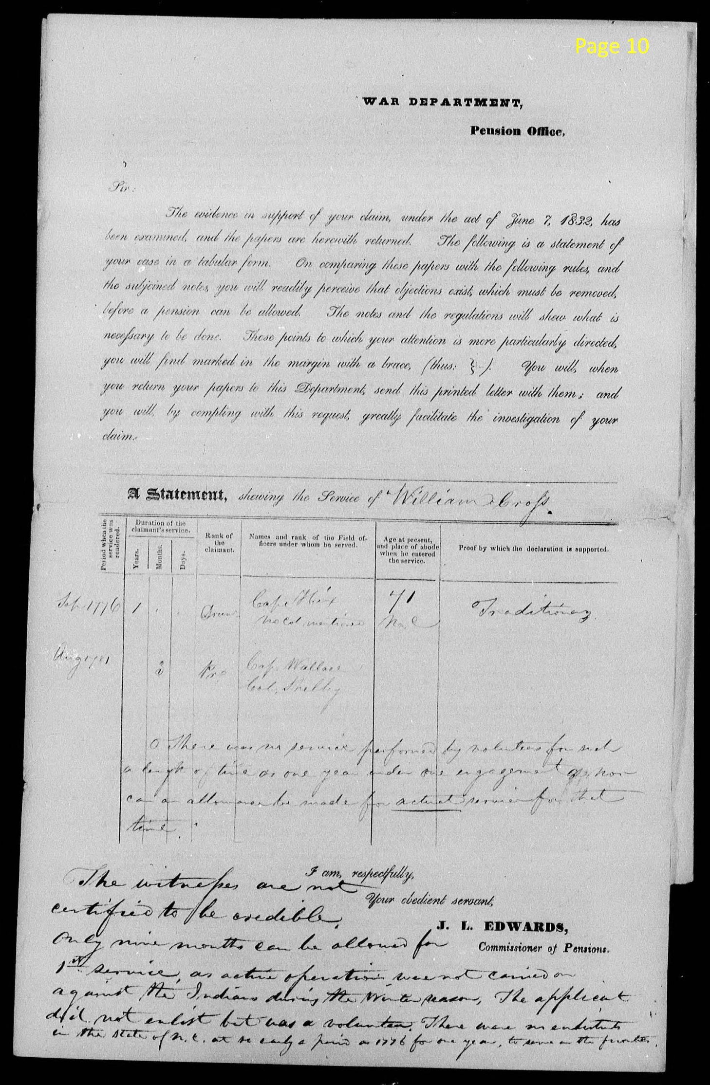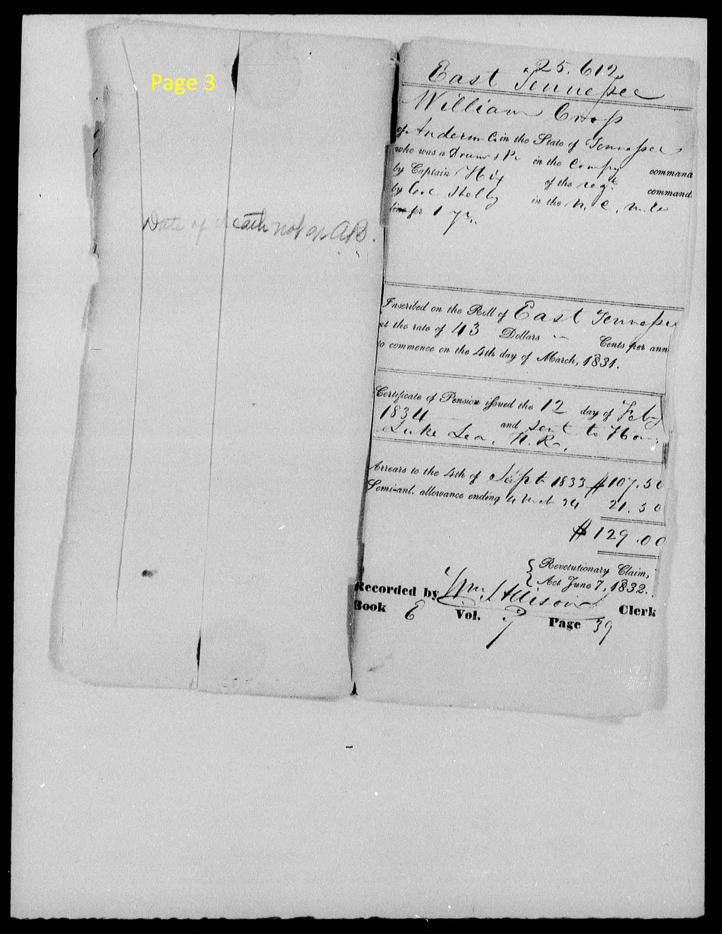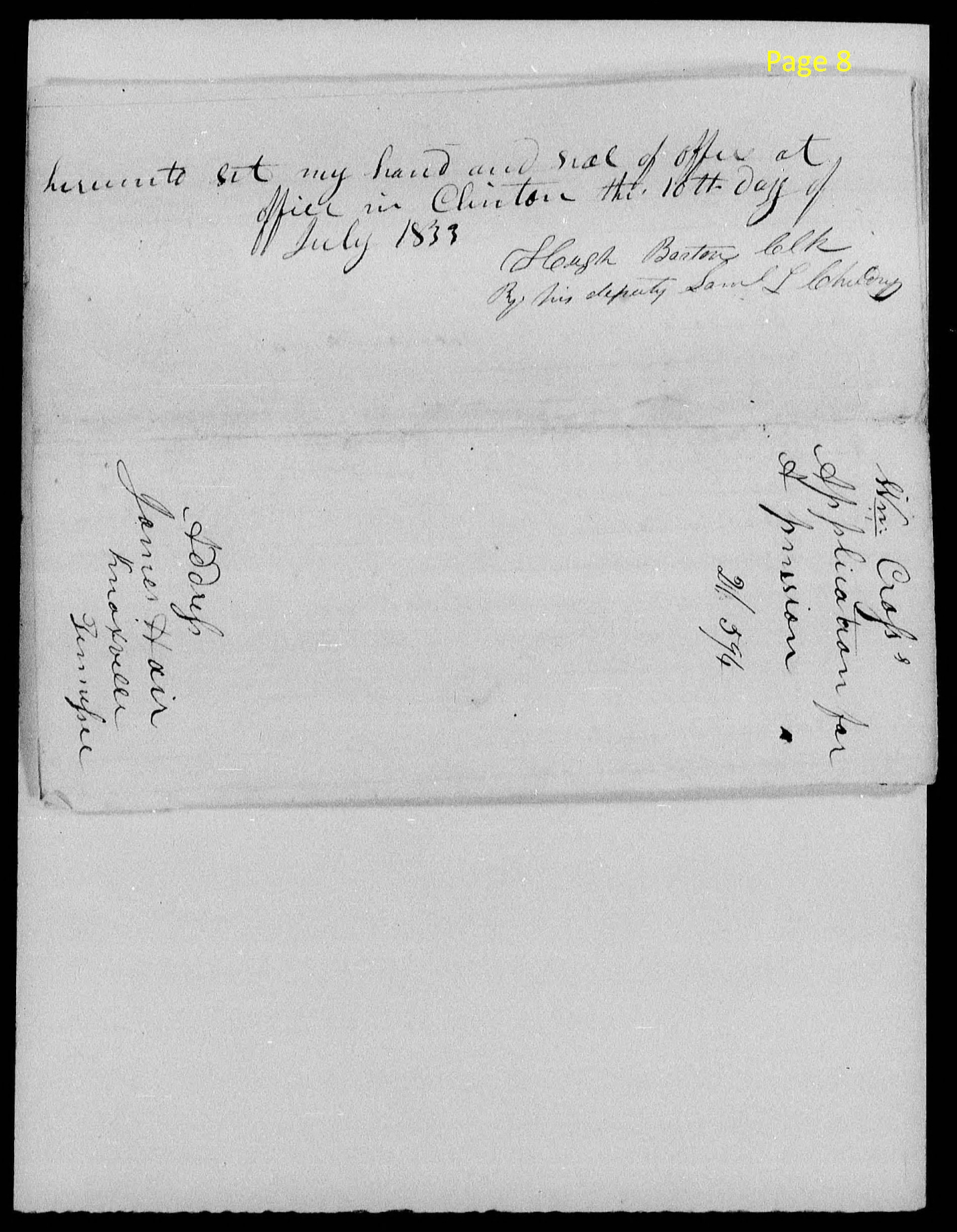page 19 (handwritten) I certify that Edward Cox and Abraham Cross the deponents in the within affd. are known to me to be respectable. Edward Cox on the Pension roll of the Jonesboro agency as an Ensign. I I believe Mr. Cross is likewise on said roll. Their statements are entitled to full credit. Feb 9, 1834 John Blair |