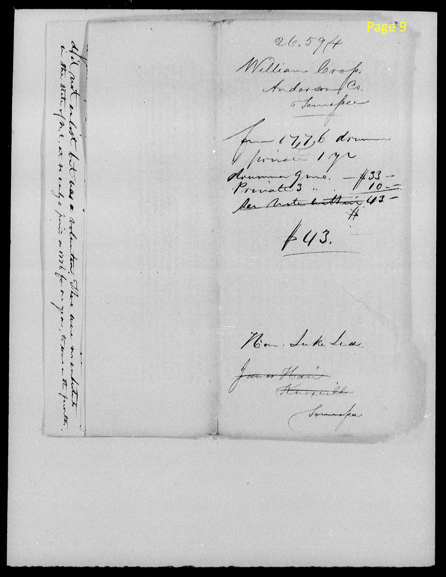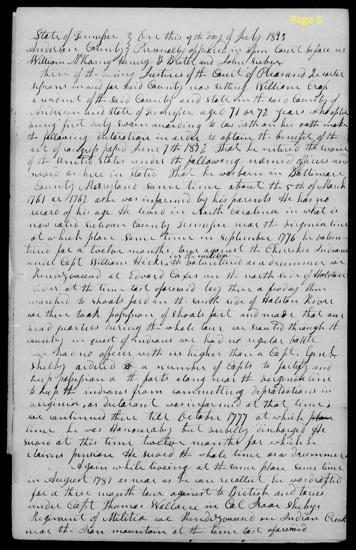 page 5 State of Tennessee ) On this 9th day of July 1833 Anderson County ) Personally appeared in open Court before us William McKamey, Henry B. Butler, and John Seiber three of the acting Justices of the Court of Pleas and Quarter before us in and for said County was sitting William Cross a resident of the Said County and state in the said County of Anderson State of Tennessee aged 71 or 72 years and after being first duly sworn according to law doth on his oath make the following declaration in order to obtain the benefit of the act of congress passed June 7th 1832. That he entered the service of the United States under the following named officers and served as here in stated. That he was born in Baltimore County, Maryland some time about the 5th of March 1761 or 1762 as he was informed by his parents. He has no record of his age. He lived in North Carolina in what is now caled (sic) Sulivan (sic) County someplace near the Virginia line at which place some time in September 1776 he volun- teered for a twelve month tour against the Cherokee Indians under Capt William Hicks in the militia. He volunteered as a drummer. We Rendezvoused at Edward Coxes in the north Side of Holston river at the time last aforesaid lay there a few day then switched to Shoats fort in the south side of Holston River. We then took possession of Shoats fort and made that our head quarters during the whole tour. We scouted through the country in quest of indians. We had no regular battle. We had no officer with us higher than a Capt. Genl. Shelby ordered a number of Capts to fortify and high position a the forts along near the Virginia line to keep the indians from committing deprivations in Virginia as dutarant (sic) was informed at that time. We continued there till October 1777 at which time he was Honorably but verbally discharged. He served at this time twelve months for which He claims pension. He served the whole time as a Drummer. Again while liveing (sic) at the same place some time in August 1781 as near as he can recall he was drafted for a three month tour against the British and tories under Capt. Thomas Wallace in Col. Isaac Shelby's Regiment of Militia. We Rendezvoused on Indian Creek near the Iron Mountain at the time last aforesaid |