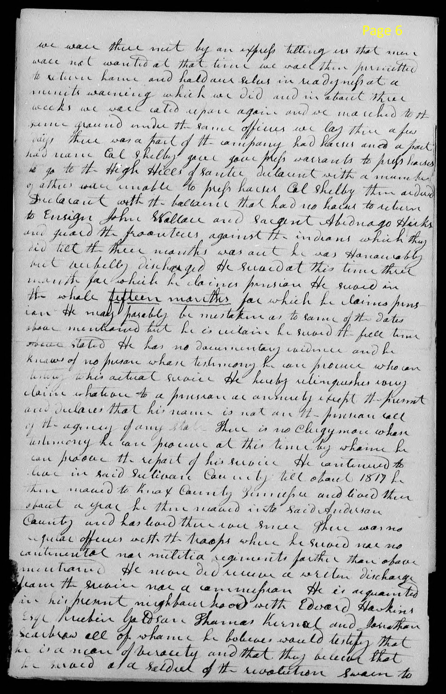 page 6 we were there met by an express telling us that men was not wanted at that time. we was then permitted to return here and hold our selves in readyness (sic) at a minits (sic) warning which we did and in about three weeks we were caled (sic) upon again and we marched to the same ground under the same officers. we lay there a few days. There was a part of company had horses and a part had none. Col. Shelby gave gave (sic) press warrants to press horses to go to the High Hills of Santee Dularent with a number of others were unable to press horses. Col. Shelby then ordered Declarant with the ballance (sic) that had no horses to return to Ensign John Wallace and Sargent Abidnago Hicks and guard the frontier against the indians which they did till the three months was out. he was Honorably and verbally discharged. He Served at this time three months for which he claims pension. He served in the whole fifteen months for which he claims pens- ion. He may probably be mistaken as to some of the dates above mentioned but he is certain he served the full time above stated. He has no documentary evidence and he knows of no person whose testimony he can provide who can testify in his actual service. He hereby relinquishes every claim whatever to a pension accordingly except the present one declare that his name is not in the pension roll of the agency of any state. There is no Clergyman whose testimony he can provide at this time by whence he can prove the report of his service. He continued to live in said Sulivan (sic) County till about 1817 he then moved to Knox County Tennessee and lived there about a year he then moved into said Anderson County and has lived there ever since. There was no regular officers with the troops where he served nor no continental nor militia regiment farther than above mentioned. He never did receive a written discharge from the service nor a commission. He is acquainted in his present neighborhood with Edward Hawkins Esq. Reubin Gadsen Thomas Kernal and Jonathan Scarbraw all of whom he believes would testify that he is a man of veracity and that they believe that he was a soldier of the Revolution sworn to |