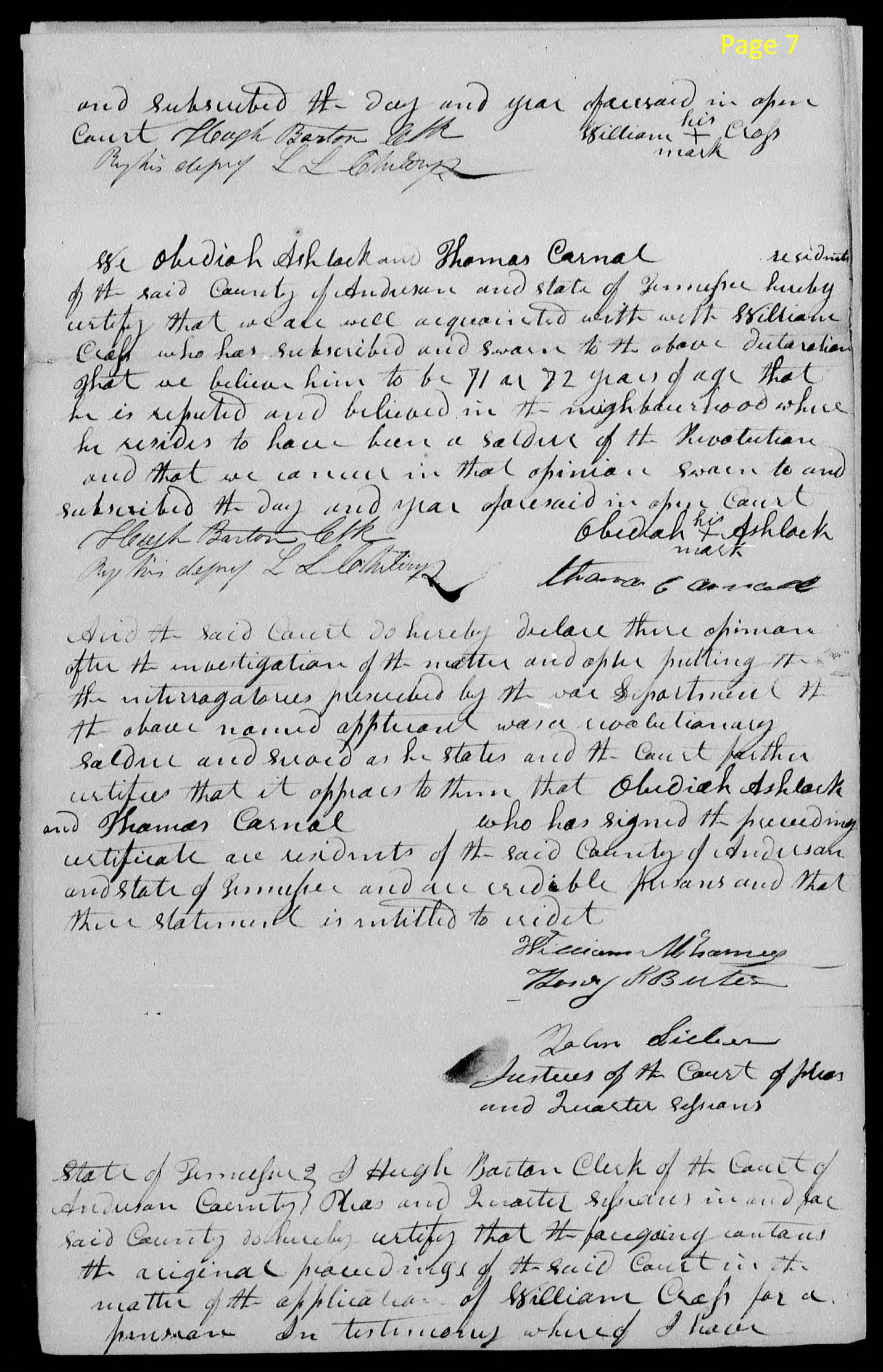 page 7 and subscribed the day and year aforesaid in open Court Hugh Barton Clk his By his deputy S.L. Chilton William x Cross mark We Obidiah Ashlock and Thomas Carnal residents of the said County of Anderson and State of Tennessee hereby certify that we are well acquainted with with (sic) William Cross who has subscribed and sworn to the above dictation? that we believe him to be 71 or 72 years of age that he is reputed and believed in the neighborhood where he resides to have been a Soldier of the Revolution and that we concur in that opinion. Sworn to and subscribed the day aforesaid in open Court Hugh Benton Clerk Obidiah Ashlock by his deputy S. L. Chilton Thomas G. Carnal And the said Court hereby declare there (sic) opinion after the investigation of the matter and after putting the interrogatories prescribed by the war Department the above named applicant was a Revolutionary Soldier and Served as he states and the Court further certifies that it appears to them that Obidiah Ashlock and Thomas Carnal who has signed the preceeding certificate are residents of the said County of Anderson and State of Tennessee and are credible persons and that their statement is subscribed to credit. William McKamey Henry L. Butler John Sieber Justices of the Court of Pleas and Quarter sessions State of Tennessee) I Hugh Barton Clerk of the Court of Anderson County ) Pleas and Quarter sessions in and for said County do hereby certify that the foregoing contained the original proved findings of the said Court in the matter of application of William Cross for a pension. In testimony whereof I have |