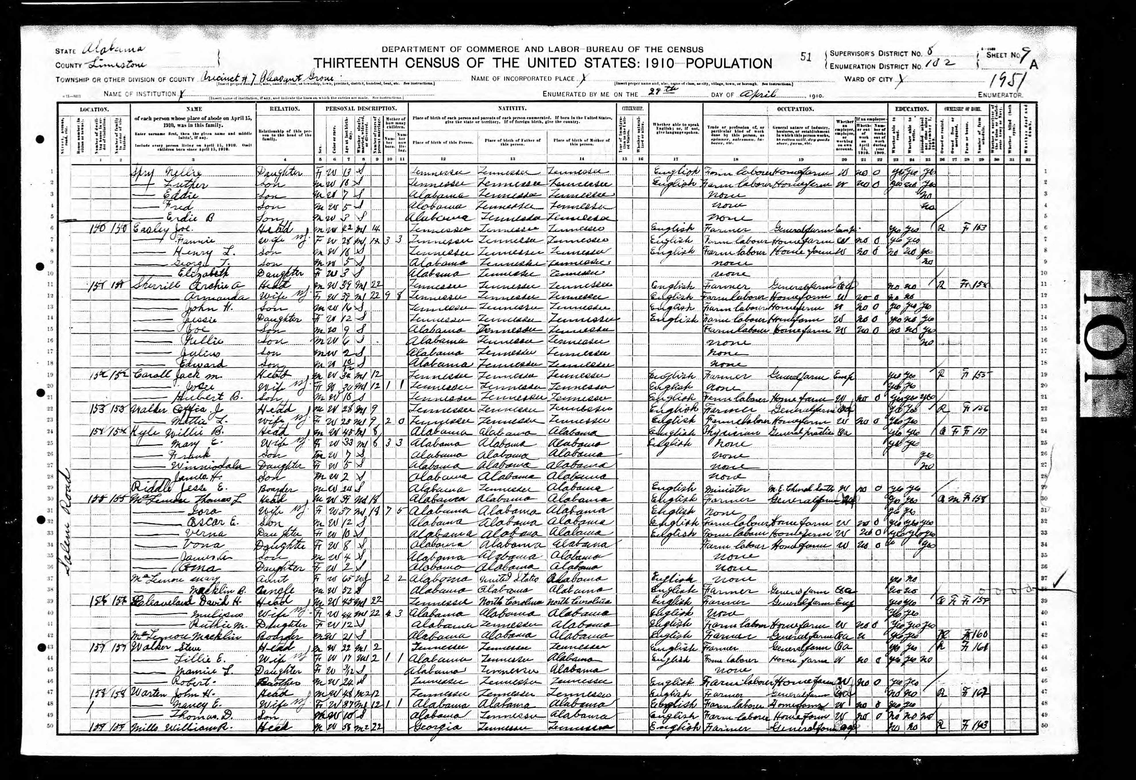 Precinct 7, Pleasant Grove, Limestone County, Alabama, 29 Apr 1910 page 51a, dwelling number 154, family number 154 Kyle Willie B. 48 head m m1-8 w physician, general practice AL AL AL Mary E. 33 wife f m1-8 w AL AL AL Frank 7 son m s w AL AL AL Winniodala 5 dau f s w AL AL AL James H. 2 son m s w AL AL AL Riddle Jesse E. 24 boarder m s w minister, M.E. Church South AL TN AL |