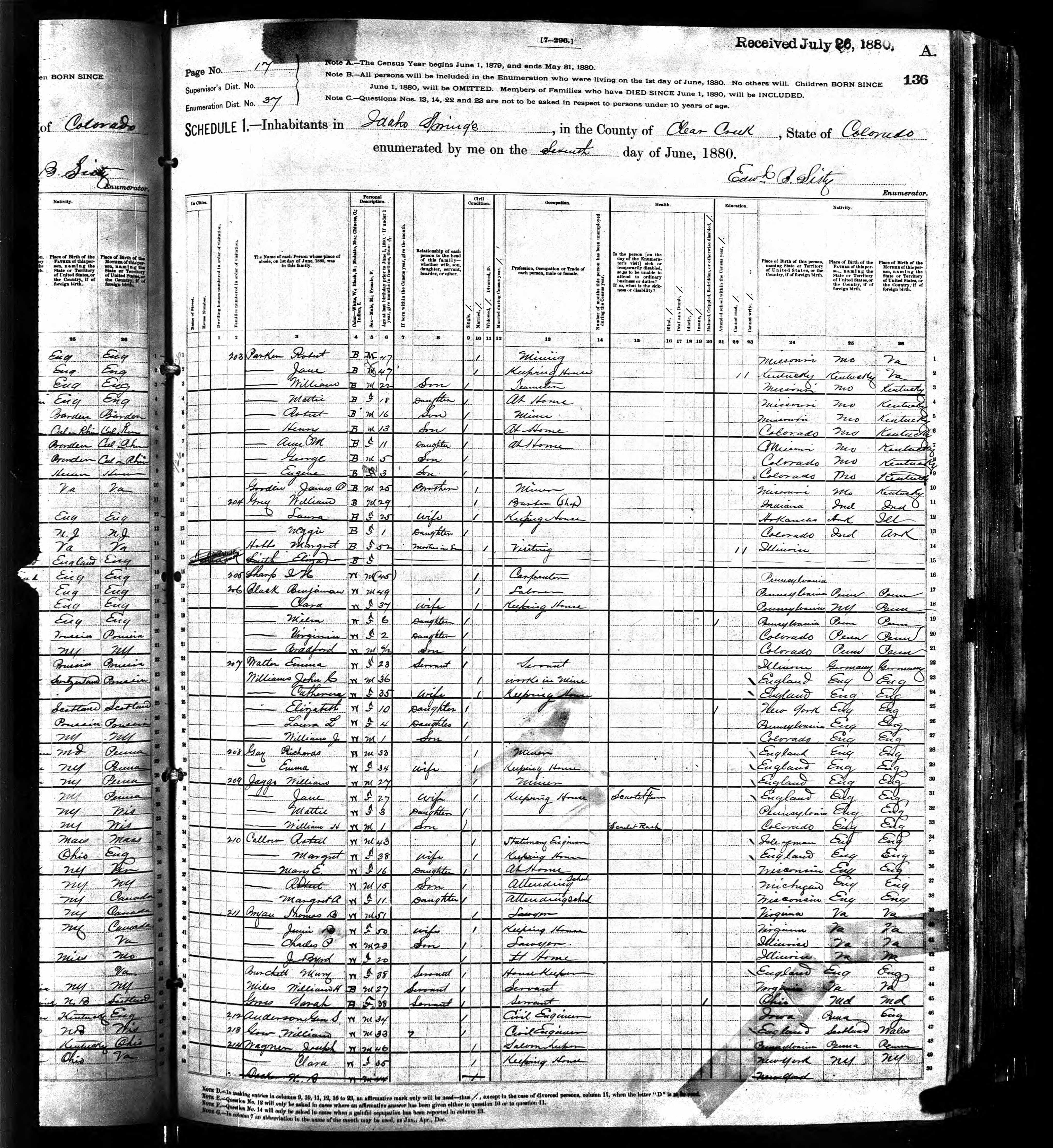1880 U.S. Census, Clear Creek County, ColoradoEnumeration District 37, Idaho Springs, page 136a |