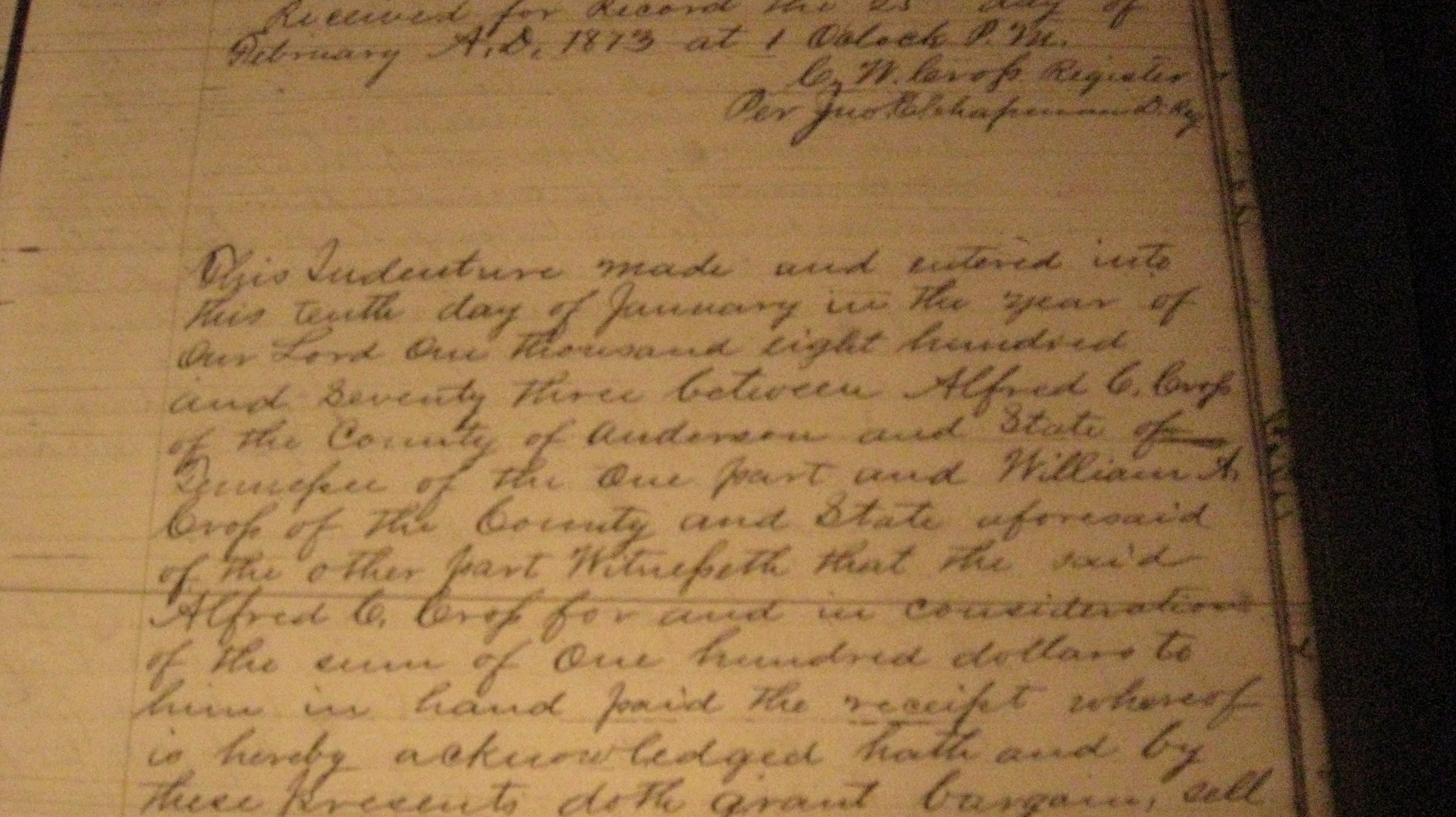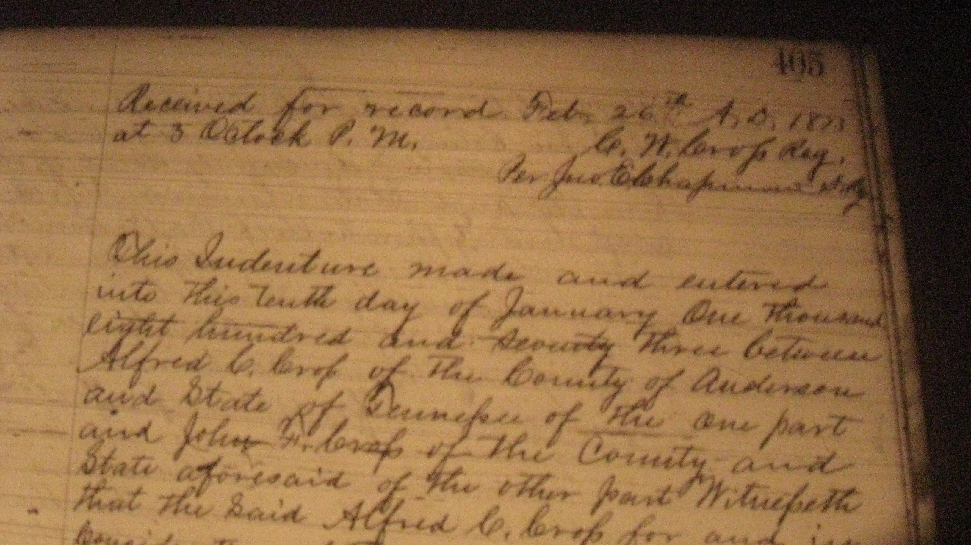 Deed Book X1, p.405 (image of p.405 in four parts: A, B, C), and D). Received for record Feby 26th A.D. 1873 at 3 Oclock p.m. C. W. Cross Reg. Per Jno. E. Chapman D. Reg. This Indenture made and entered into this tenth day of January One thousand eight hundred and seventy three between Alfred C. Cross of the County of Anderson and State of Tennessee of the one part and John F. Cross of the county and State aforesaid of the other part Witnesseth that the Said Alfred C. Cross for and in Consideration of the Server of One hundred dollars to him in hand paid the receipt whereof is hereby acknowledged hath and by these presents doth grant, bargain, sell, convey, and confirm unto the said John F. Cross his heirs and assigns forever a certain tract or parcel of land containing ten acres be the same more or less on the South side of the Chestnut ridge Beginning on a Chestnut thence North Sixty two east fifty seven poles to a Pine and Hickory South twenty eight east twenty eight and one half poles to a post Oak South Sixty two west fifty seven poles to two Hickorys thence north twenty eight west twenty eight and one half poles to the Beginning with all and singular the woods, waters, water courses, profits whatsoever to the Said tract of land belonging of him the Said Alfred C. Cross his heirs and assigns forever unto the said John F. Cross his heirs and assigns forever In Witness whereof the Said Alfred C. Cross hath hereunto set his hand and fixt (sic) his seal the day and year first above written, signed Sealed acknowledged | and delivered in presence of | Alfred C. Cross (seal) | Zipporah Cross (seal) J. W. Scarbrough | Thomas C. Scarbrough | |