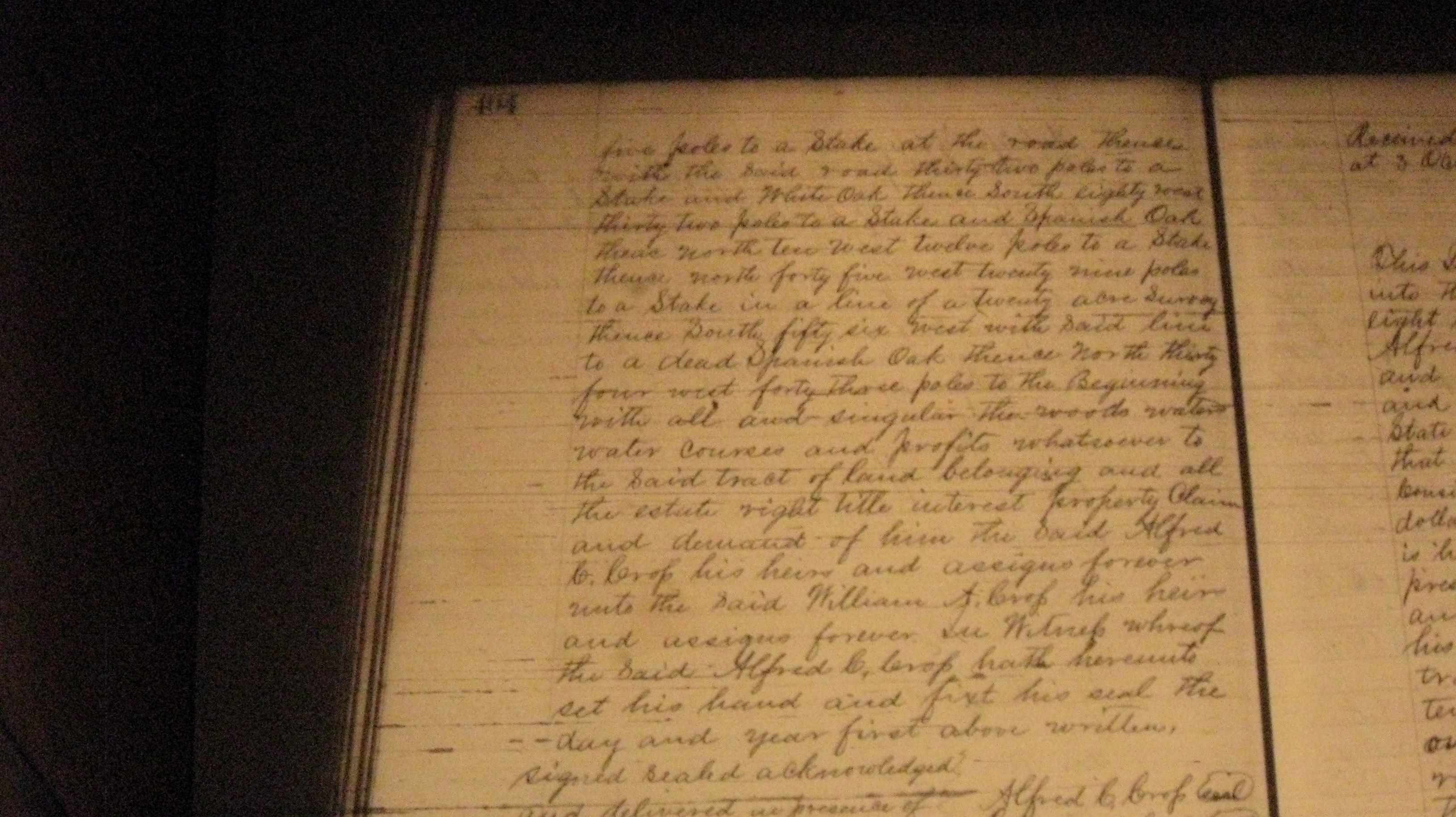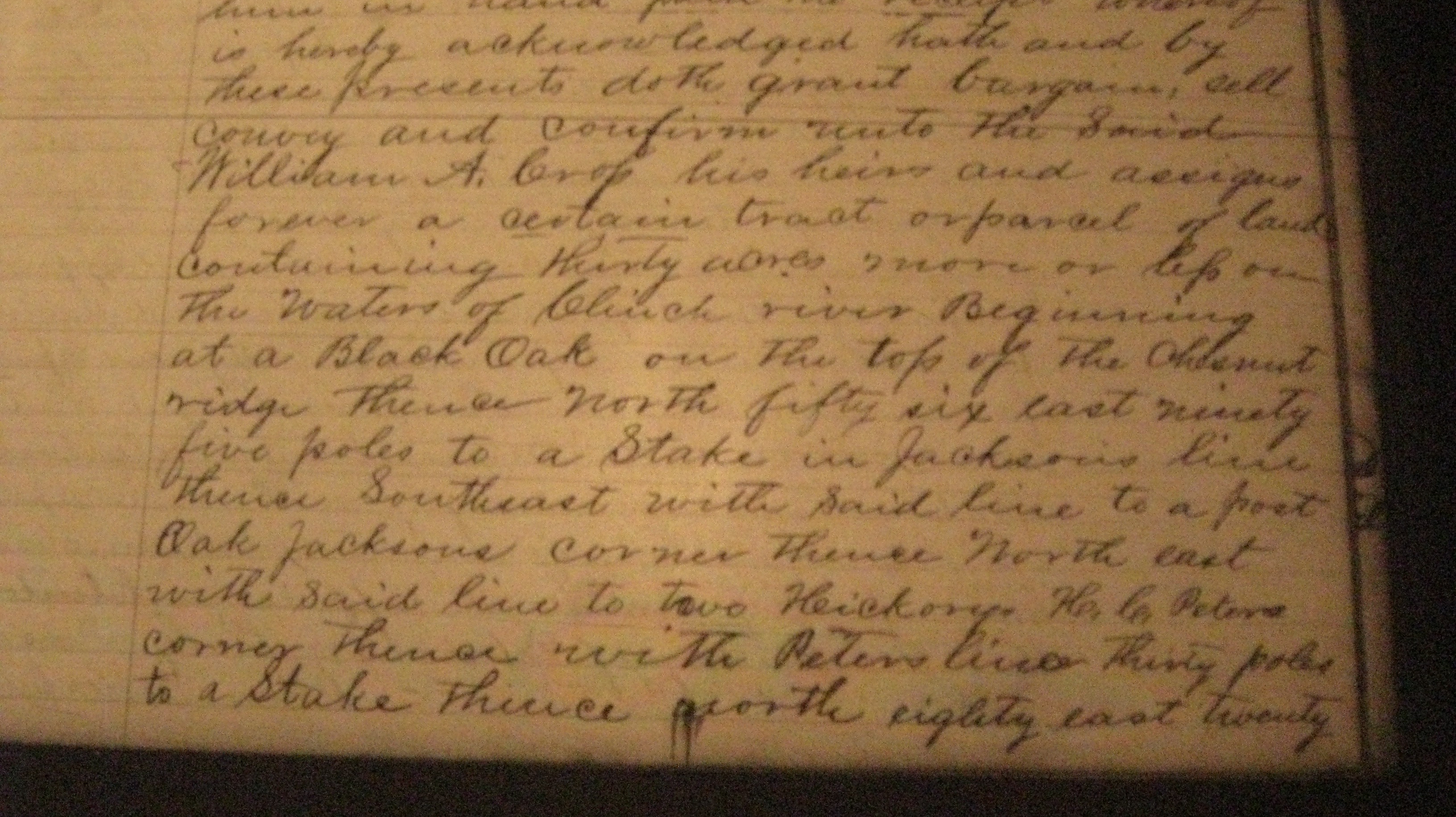 Deed Book X1, p.403 (image of p.403 in three parts: A, B, and C). This Indenture made and entered into this tenth day of January in the year of Our Lord one thousand eight hundred and Seventy three between Alfred C. Cross of the County of Anderson and State of Tennessee of the One part and William A. Cross of the County and State aforesaid of the other part. Witnesseth that the said Alfred C. Cross for and in consideration of the sum of One hundred dollars to him in hand paid the receipt whereof is hereby acknowledged hath and by these presents do grant, bargain, sell convey and confirm unto the Said William A. Cross his heirs and assigns forever a certain tract or parcel of land containing thirty acres more or less on the Waters of Clinch river Beginning at a Black Oak on the top of the Chestnut ridge thence north fifty six east ninety five poles to a Stake in Jacksons line thence Southeast with Said line to a post Oak Jacksons corner thence North east with Said line to two Hickorys H. C. Peters corner thence with Peters line thirty poles to a Stake thence north eighty east twenty |