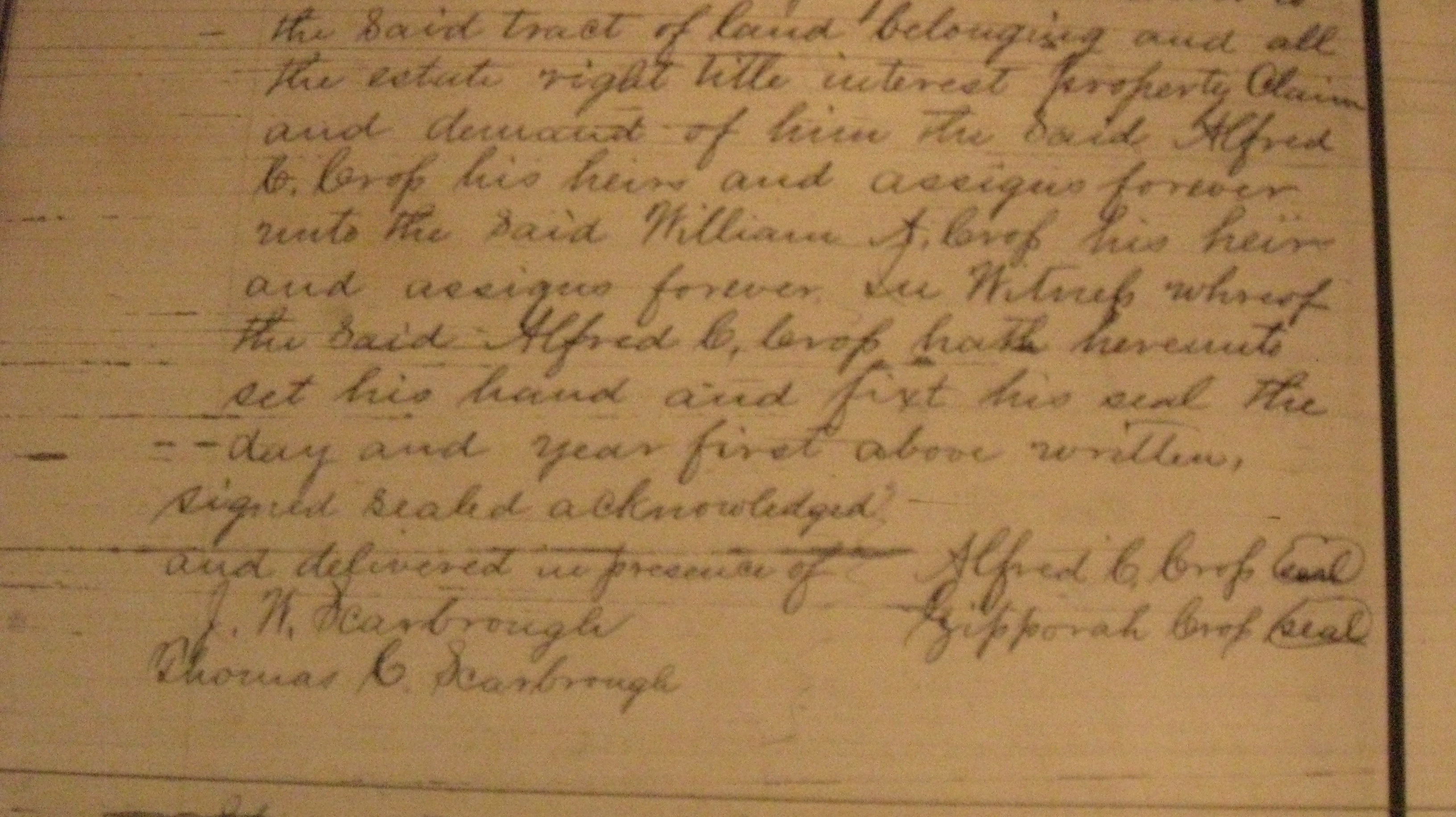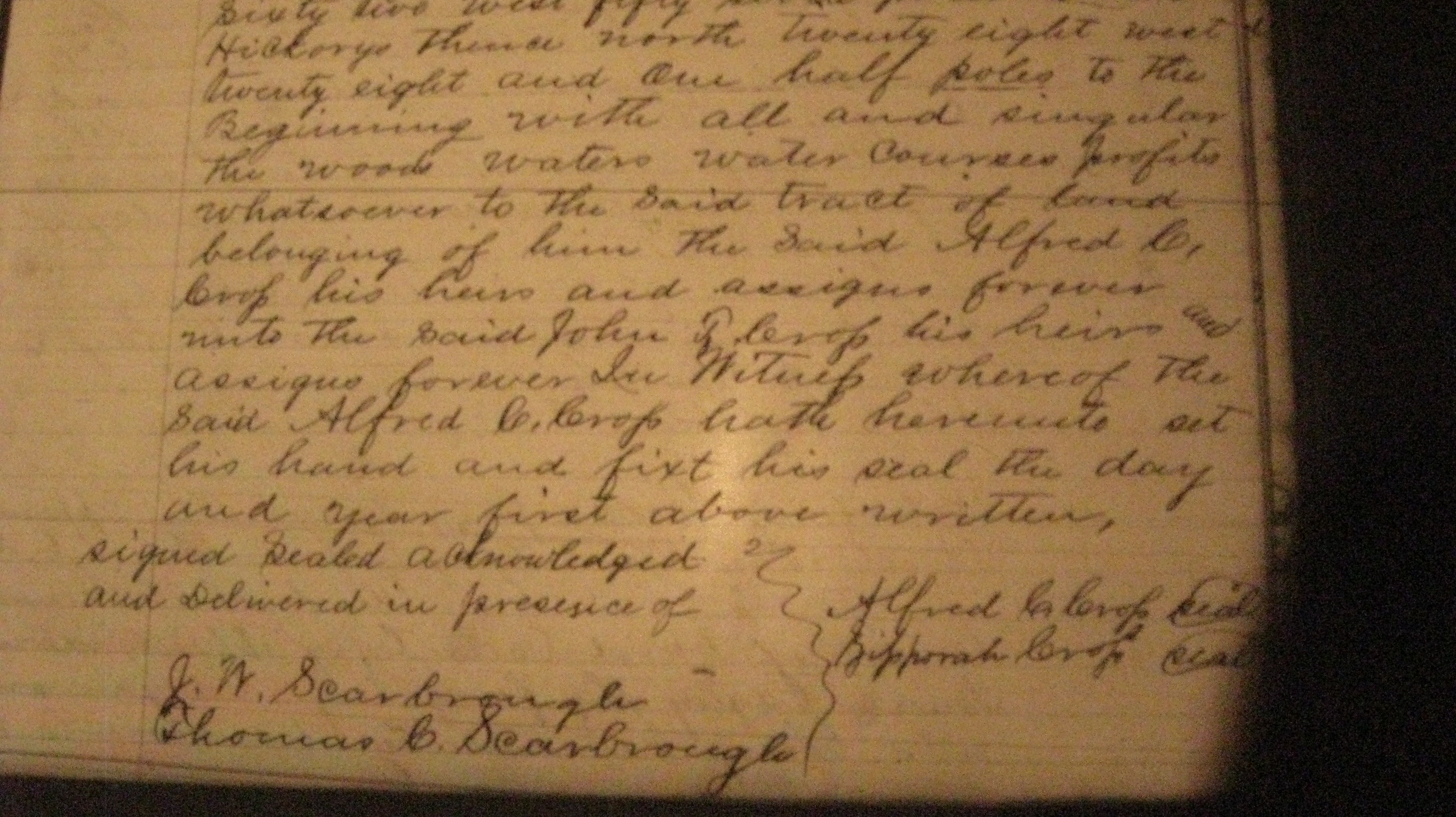 Deed Book X1, p.404 (image of p.404 in three parts: A, B, and C). five poles to a Stake at the road thence with the Said Road thirty-two poles to a Stake and White Oak thence South eighty west thirty two poles to a State and Spanish Oak thence north ten West twelve poles to a Stake thence north forty vie west twenty nine poles to a Stake in a line of a twenty acre Survey thence South fifty six west the said line to a dead Spanish Oak thence North thirty four west forty three poles to the Beginning with all and singular the woods, waters, water courses, and profits whatsoever to the Said tract of land belonging and all the estate right title interest property Claim and document of him the Said Alfred C. Cross his heirs and assigns forever unto the said William A. Cross his heirs and assignes forever. In Witness whereof the Said Alfred C. Cross hath hereunto set his hand and fixed his seal the day and year first above written. Signed Sealed acknowledged | and delive5red in presence of | Alfred C. Cross (seal) J. W. Scarbrough | Zipporah Cross (seal) Thomas C. Scarbrough | State of Tennessee | Personally appeared before Anderson County | me R.C. Dew Clerk of | the County Court for the County and State aforesaid Alford C. Cross and Zipporah the Bargainers with whom I am personally acquainted with and acknowledged that they executed the forgoing deed of conveyance for the purposes therein contained and Zipporah Cross wife of Alfred C. Cross aforesaid having been examined by me privately and apart from her husband acknowledged that she executed the Same freely, voluntarily and understandingly without compulsion or constraint from he Said husband. Witness my hand at Office in Clinton this 26 day of Feby 1873 R.C. Dew Clerk |