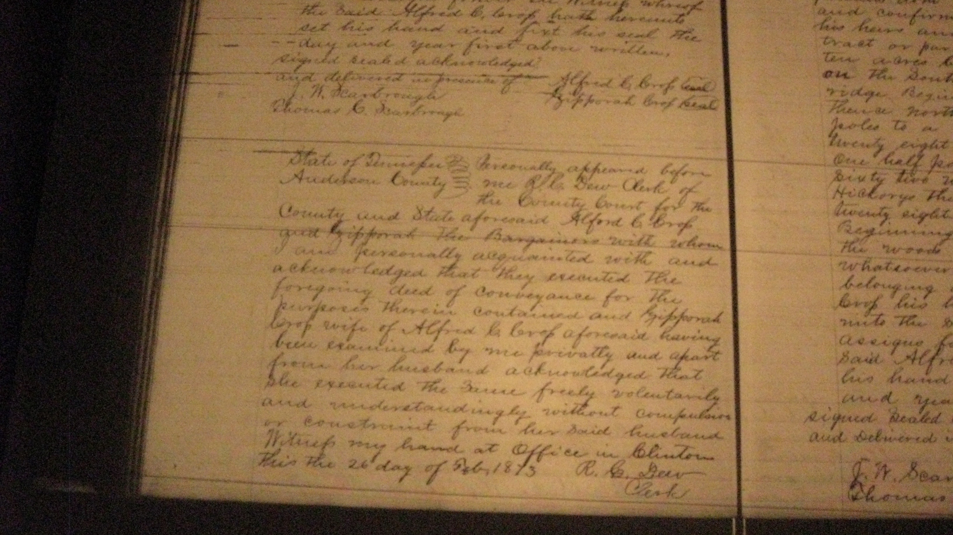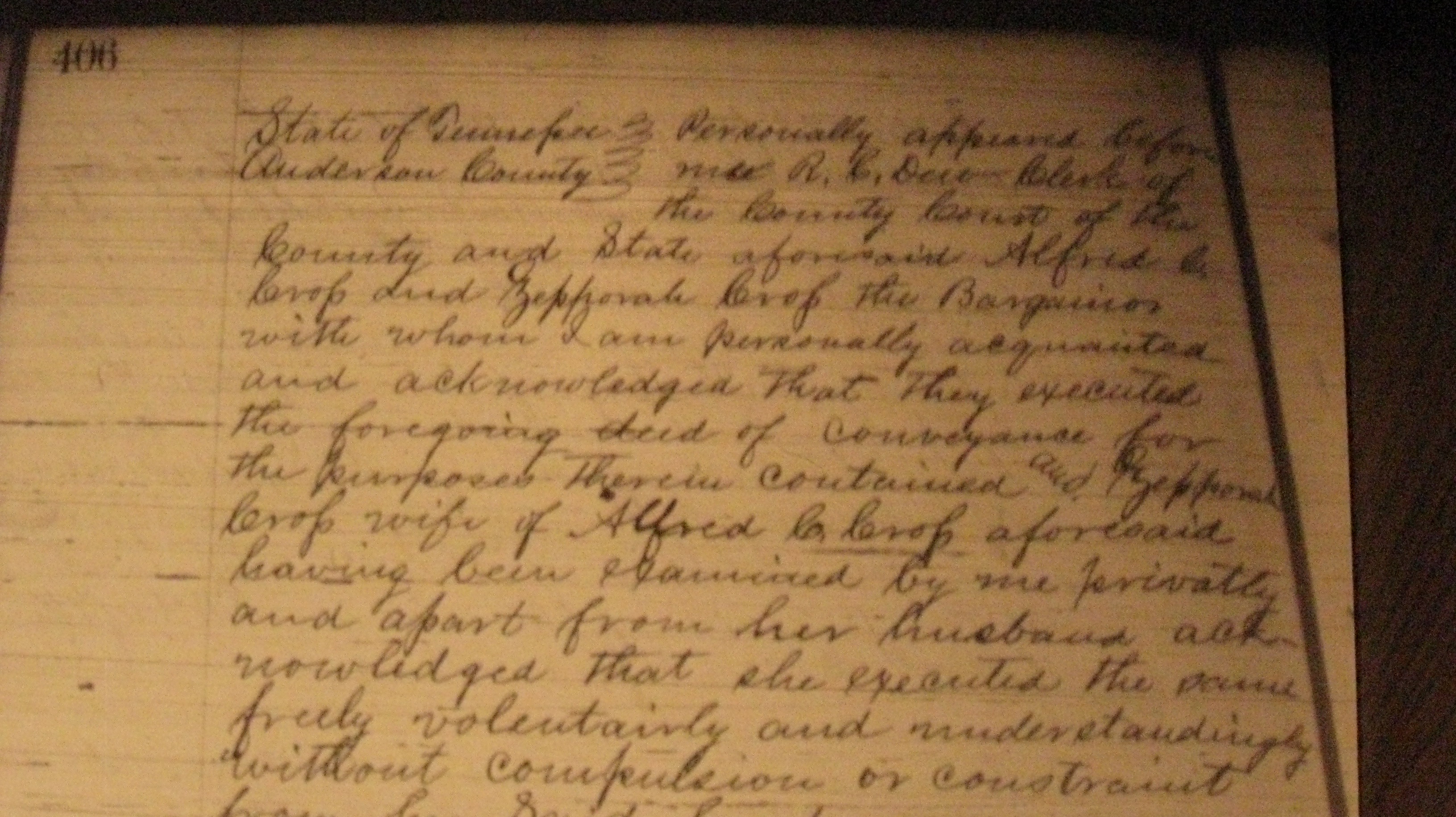 Deed Book X1, p.406 (image of p.406 in two parts: A and B). State of Tennessee | Personally appeared before Anderson County | me R.C. Dew Clerk of | the County Court of the County and State aforesaid Alford C. Cross and Zipporah Cross the Bargainers with whom I am personally acquainted and acknowledged that they executed the forgoing deed of conveyance for the purposes therein contained and Zipporah Cross wife of Alfred C. Cross aforesaid having been examined by me privately and apart from her husband ack nowledged that she executed the Same freely, voluntarily, and understandingly without compulsion or constraint from her Said husband. Witness my hand at office in Clinton this the 26th day of Feb 1873. R.C. Dew Clerk Received for record Feb. 26th A.D. 1873 at 3 Oclock p.M. C.W. Cross Reg. per Jno E. Chapman D.Reg. |