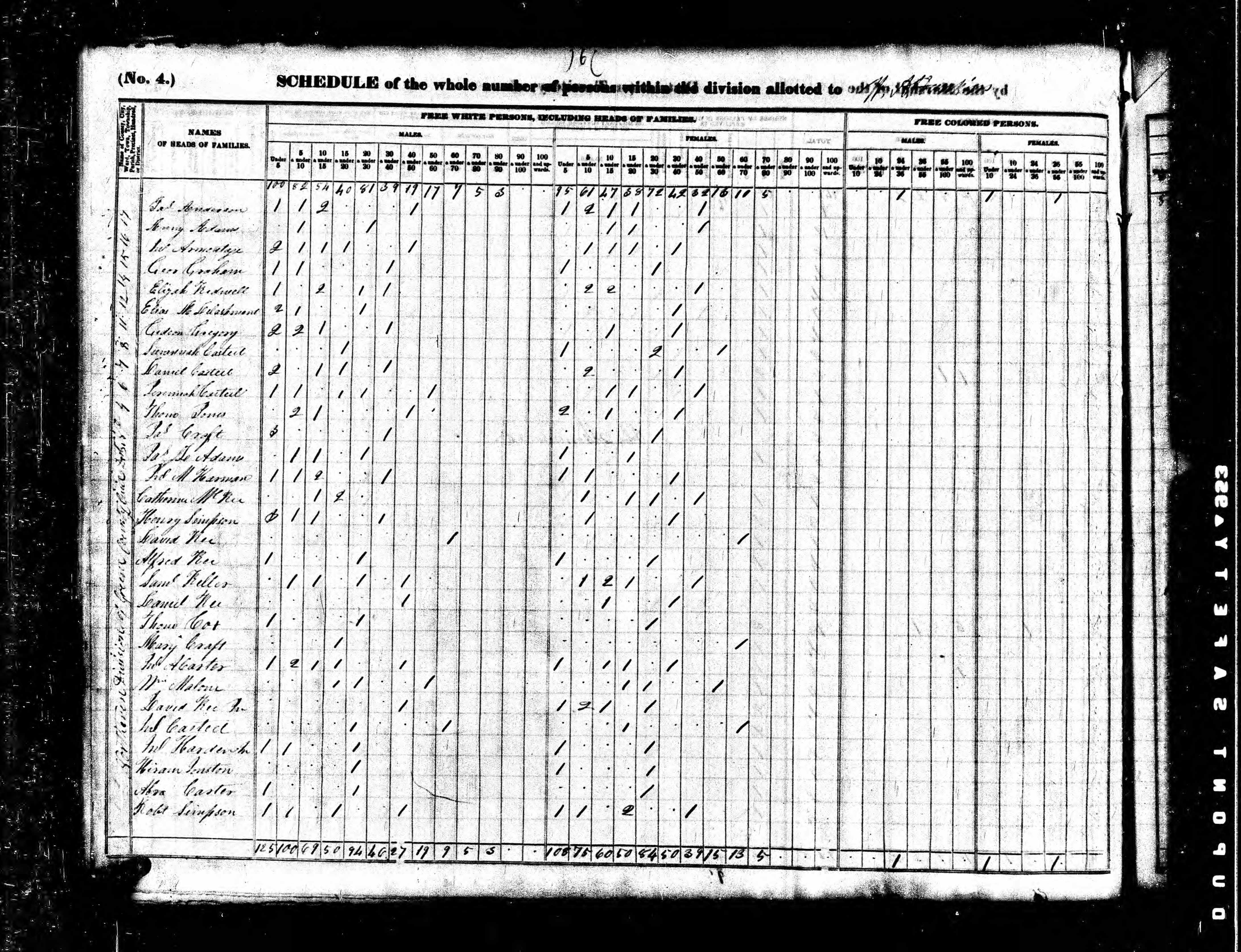 page 7a, line 15, Dist. 7. Greene County, Tennessee, 1840 Izaiah Harrison 0001000001-00000001 00-04 0 0 1836-1840 05-09 0 0 1831-1835 10-14 0 0 1826-1830 15-19 1 0 1821-1825 20-29 0 0 1811-1820 30-39 0 0 1801-1810 40-49 0 0 1791-1800 50-59 0 1 1781-1790 Mary Jones 60-69 0 1771-1780 70-79 1 1761-1770 Isaiah Harrison |