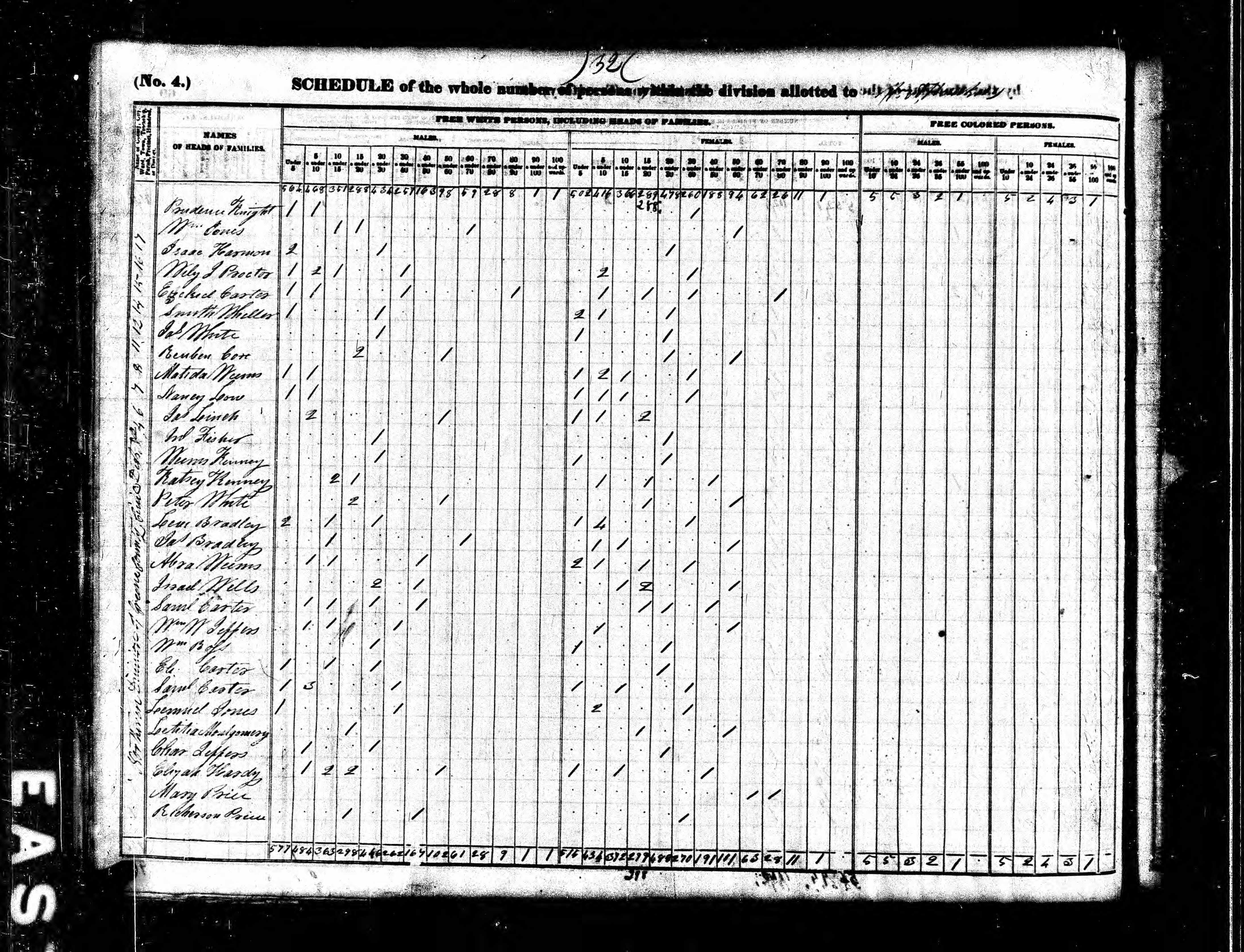 page 8a, line 15, Dist. 7. Greene County, Tennessee, 1840 Josiah Harrison 200001-012001 00-04 2 0 1836-1840 Washington Harrison, Phillip Harrison 05-09 0 1 1831-1835 Charlotte Harrison, 10-14 0 2 1826-1830 Elizabeth A. Harrison, Sarah Boswell Harrison 15-19 0 0 1821-1825 20-29 0 0 1811-1820 30-39 1 1 1801-1810 Josiah Harrison, Nancy Henshaw |