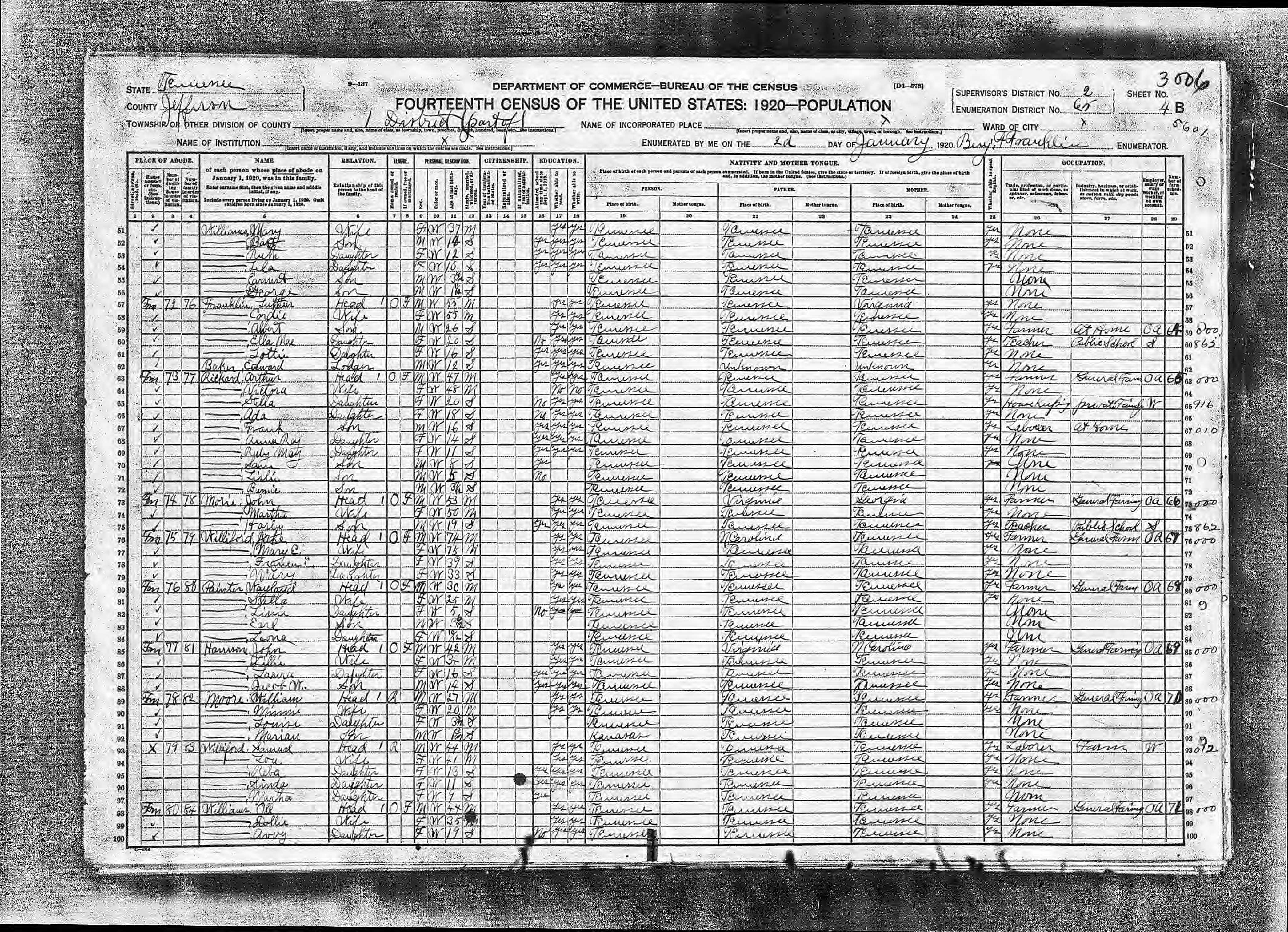Enumeration District 65, Dist. 1, Jefferson County, Tennessee, 2 Jan 1920, Benj. F. Franklin, enumerator