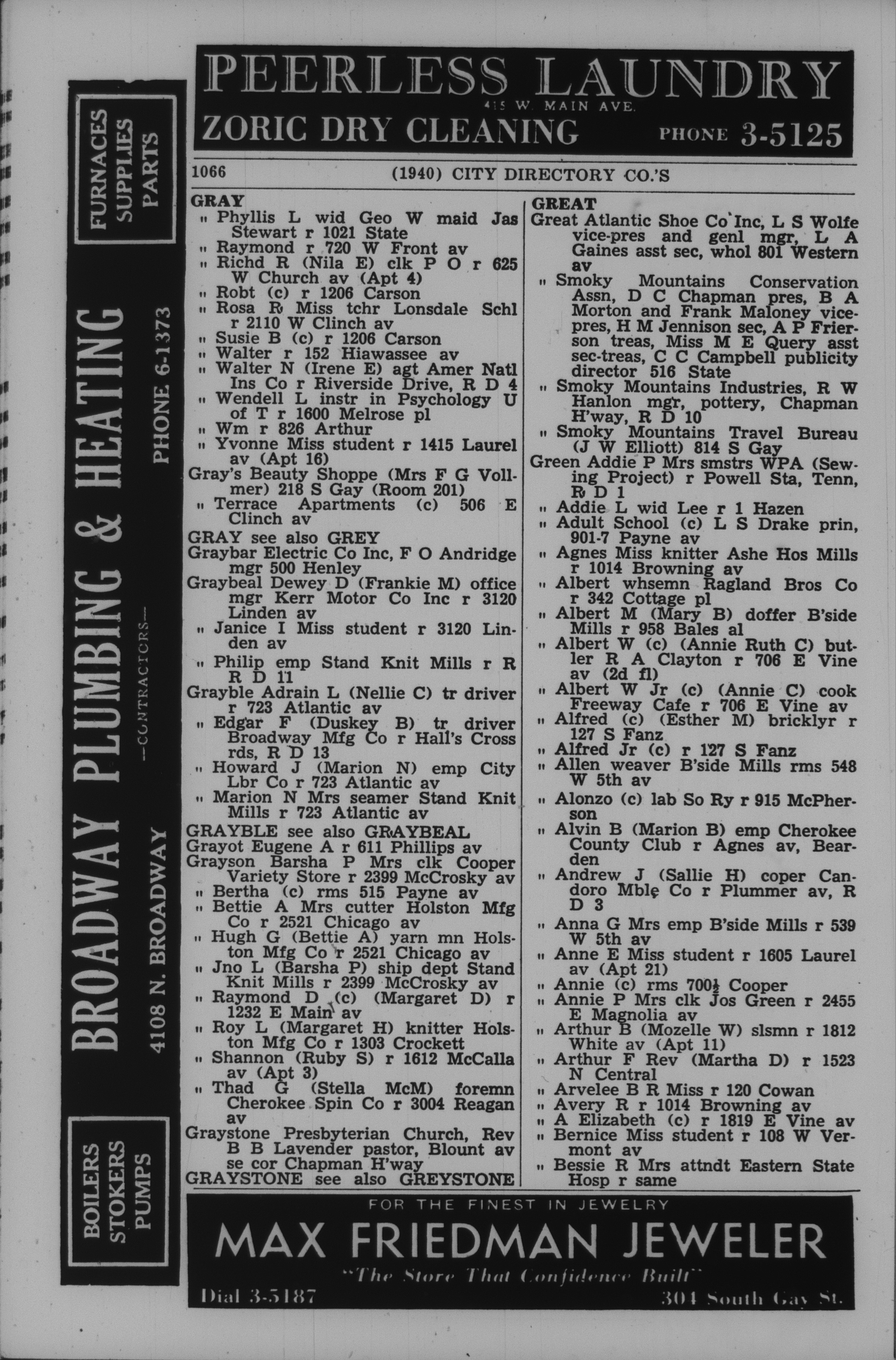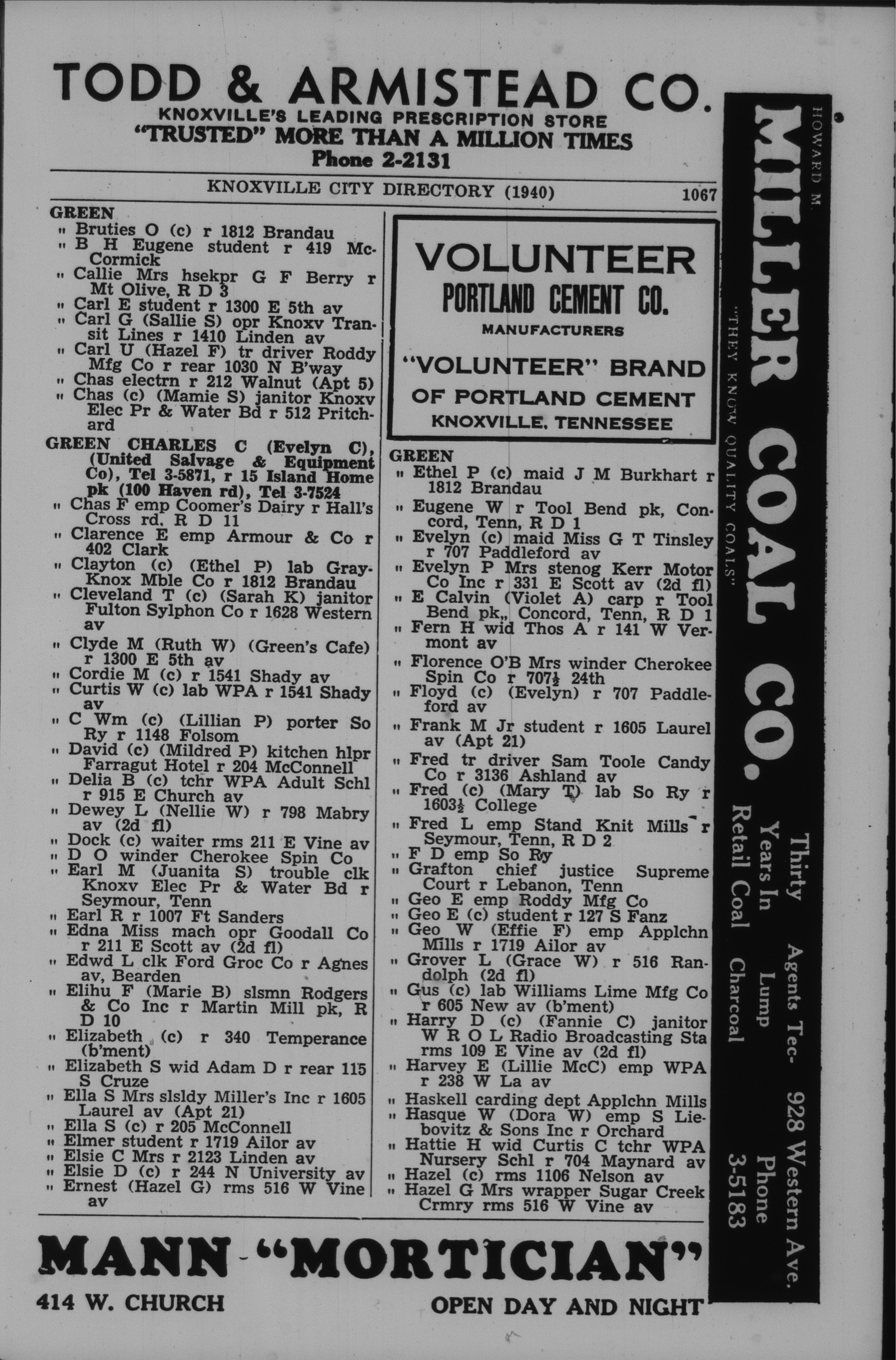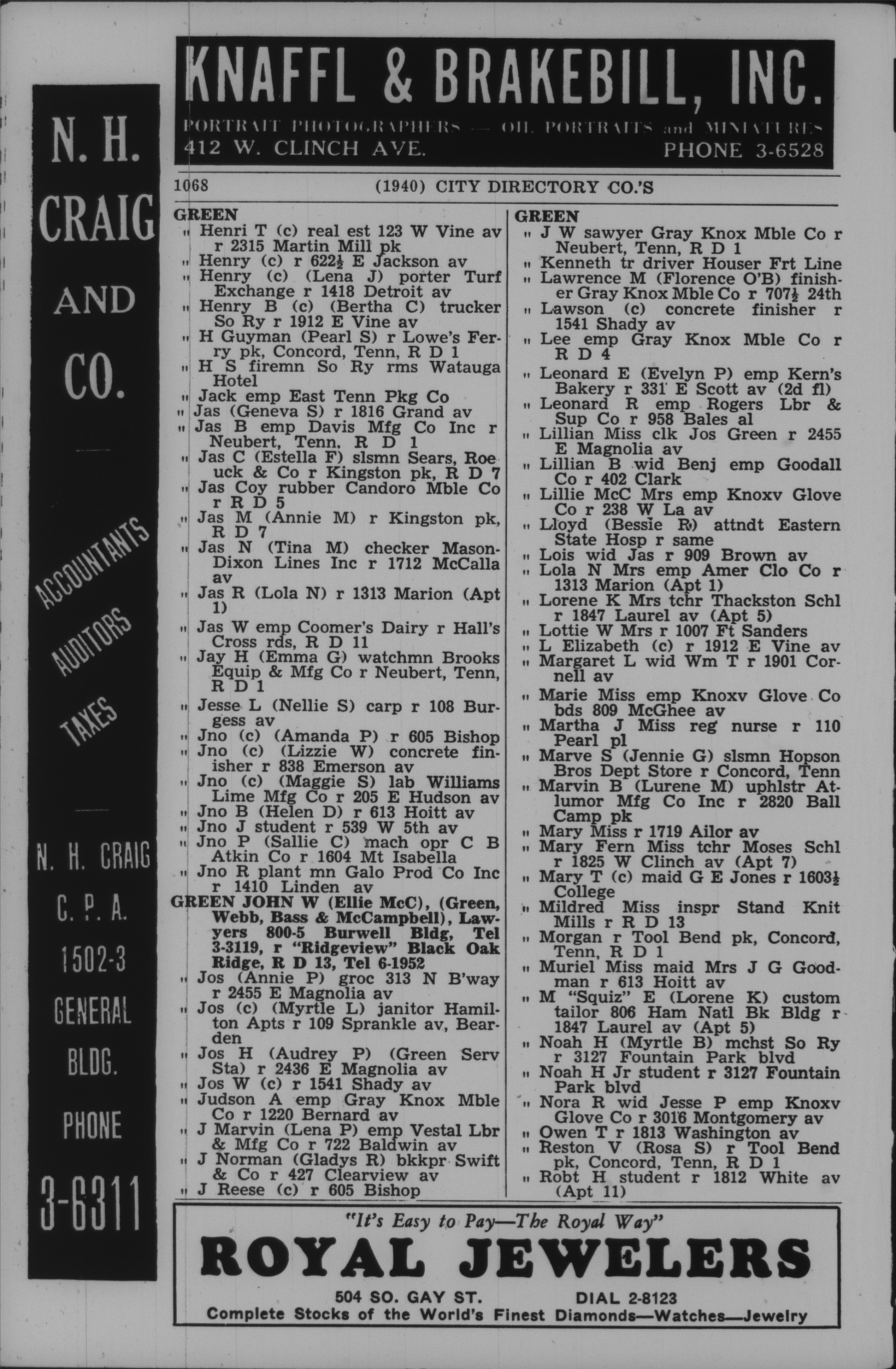 1940, City Directory, Knoxville, Tennessee, page 1067Green surname |