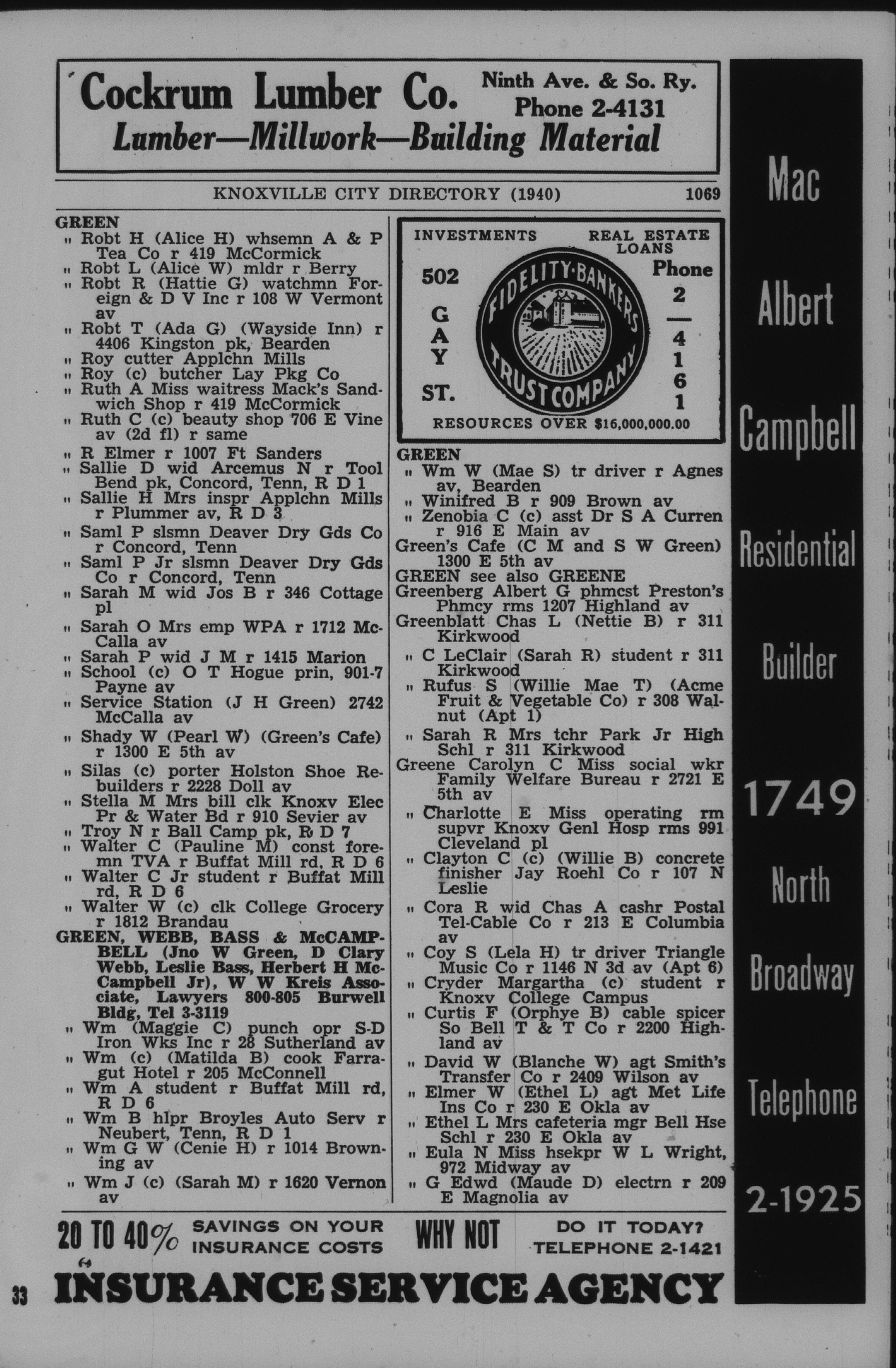 1940, City Directory, Knoxville, Tennessee, page 1069Green surname |