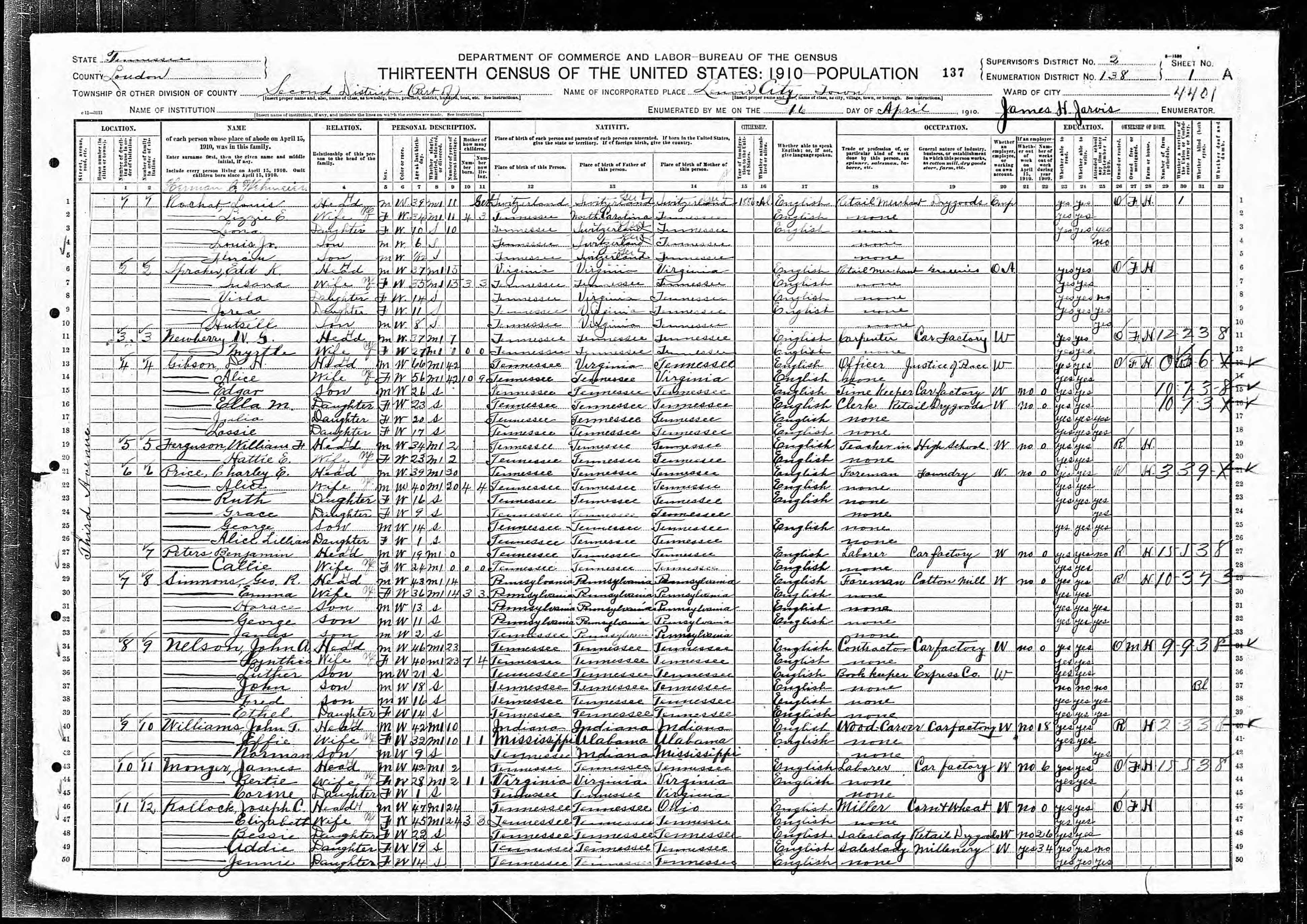 Enumeration District 138, Dist. 2, Lenoir City, Loudon County, Tennessee, 29 Apr 1910