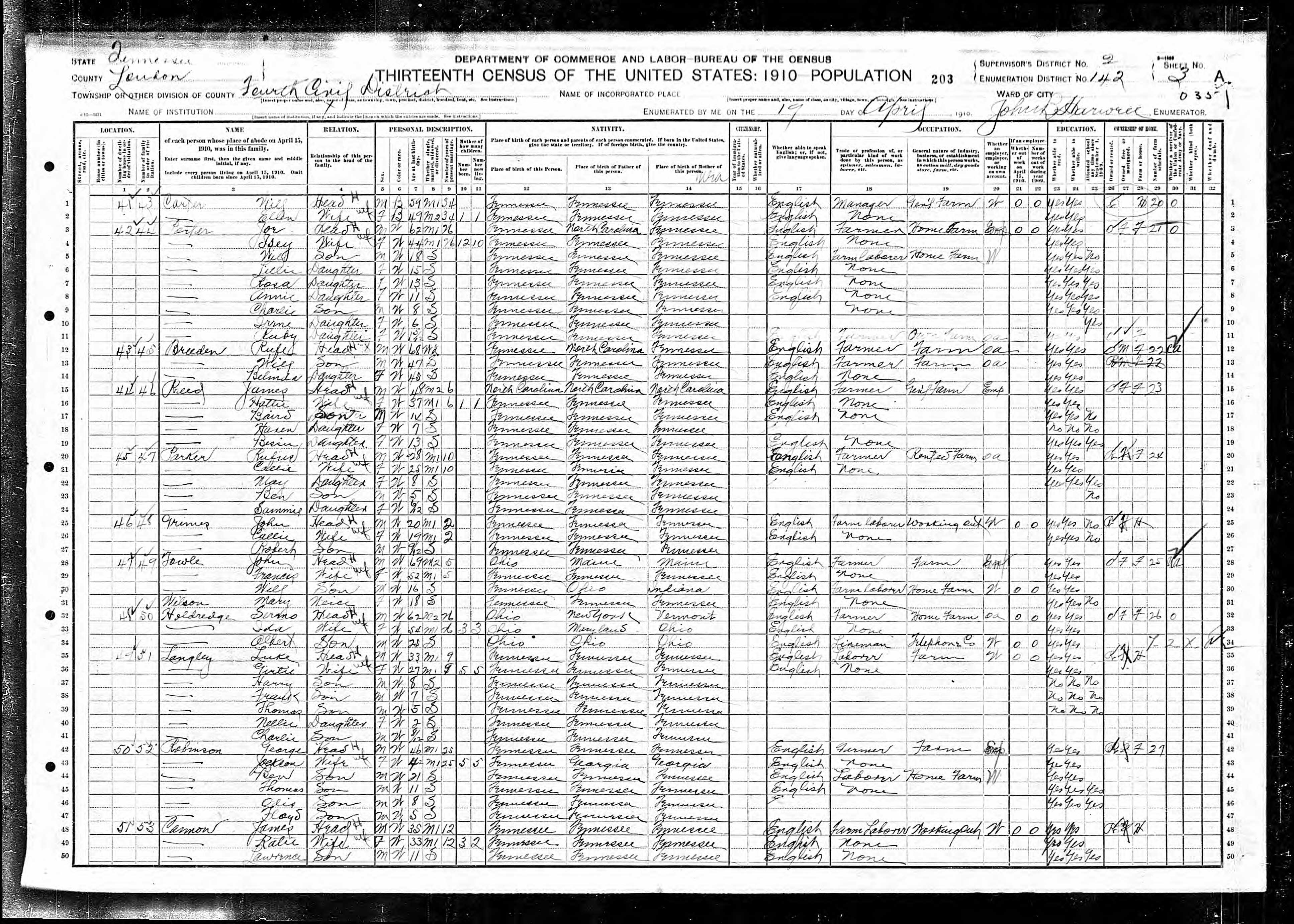 1910, Enumeration District 142, Dist. 4, Loudon County, Tennessee, page 203a |