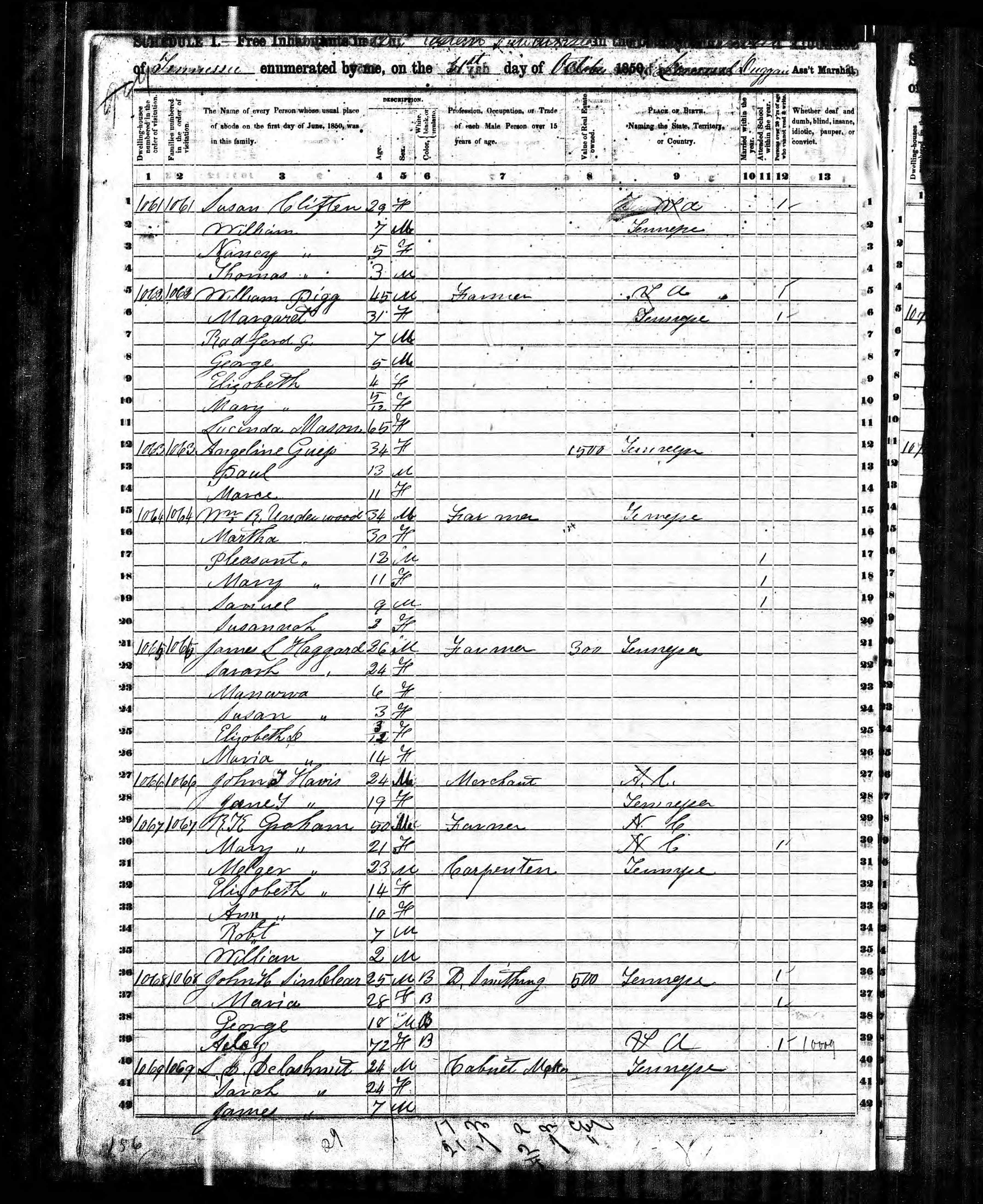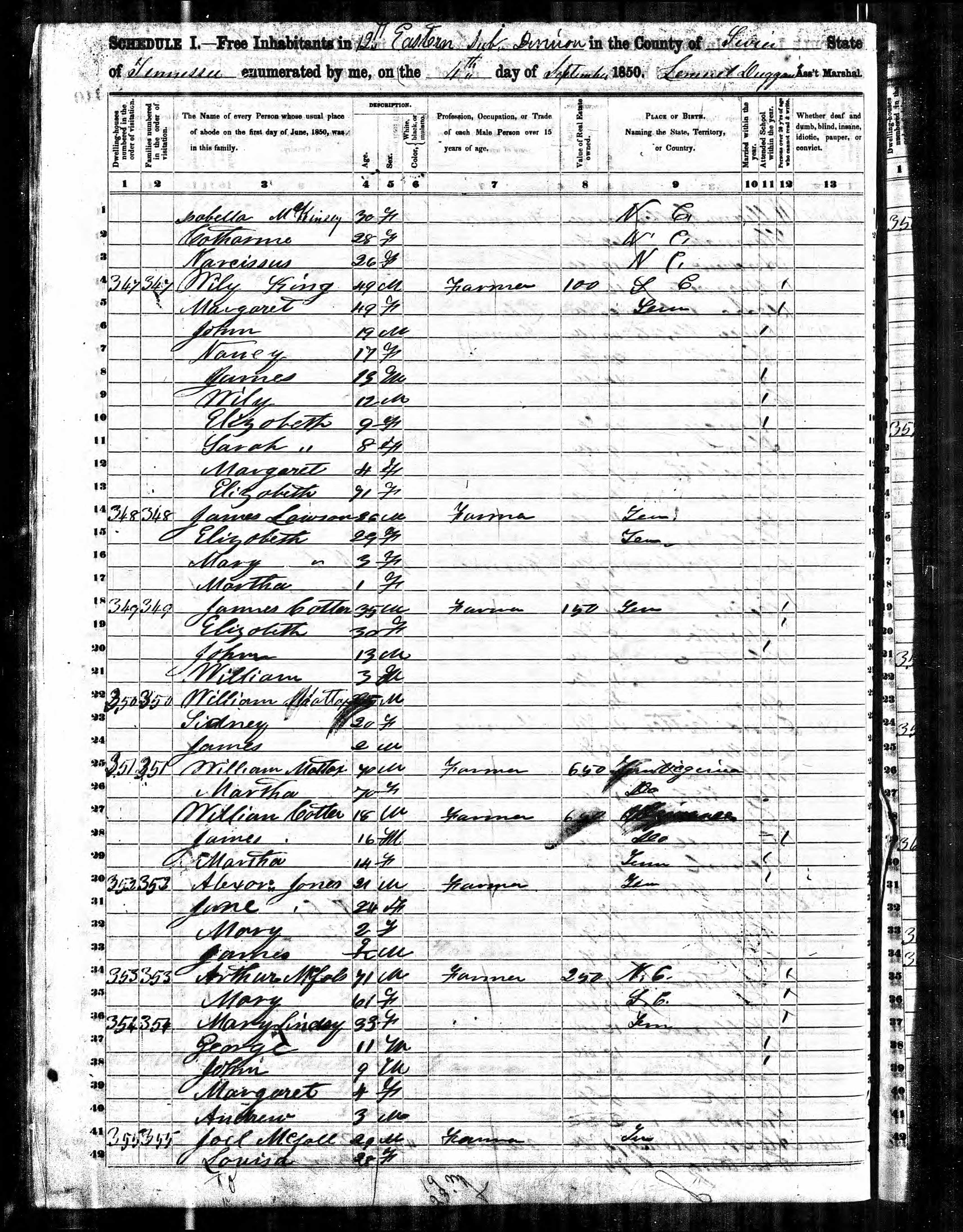 12th Eastern Subdivision, Sevier County, Tennessee, 30 Oct 1850 page 459b, dwelling number 1039, family number 1039 Henry Lea 24 m w farmer $1400 TN Sarah 22 f w TN cannot R/W Isaac 2 m w TN Juleyan 1 f w TN Samuel H. 13 m w TN |