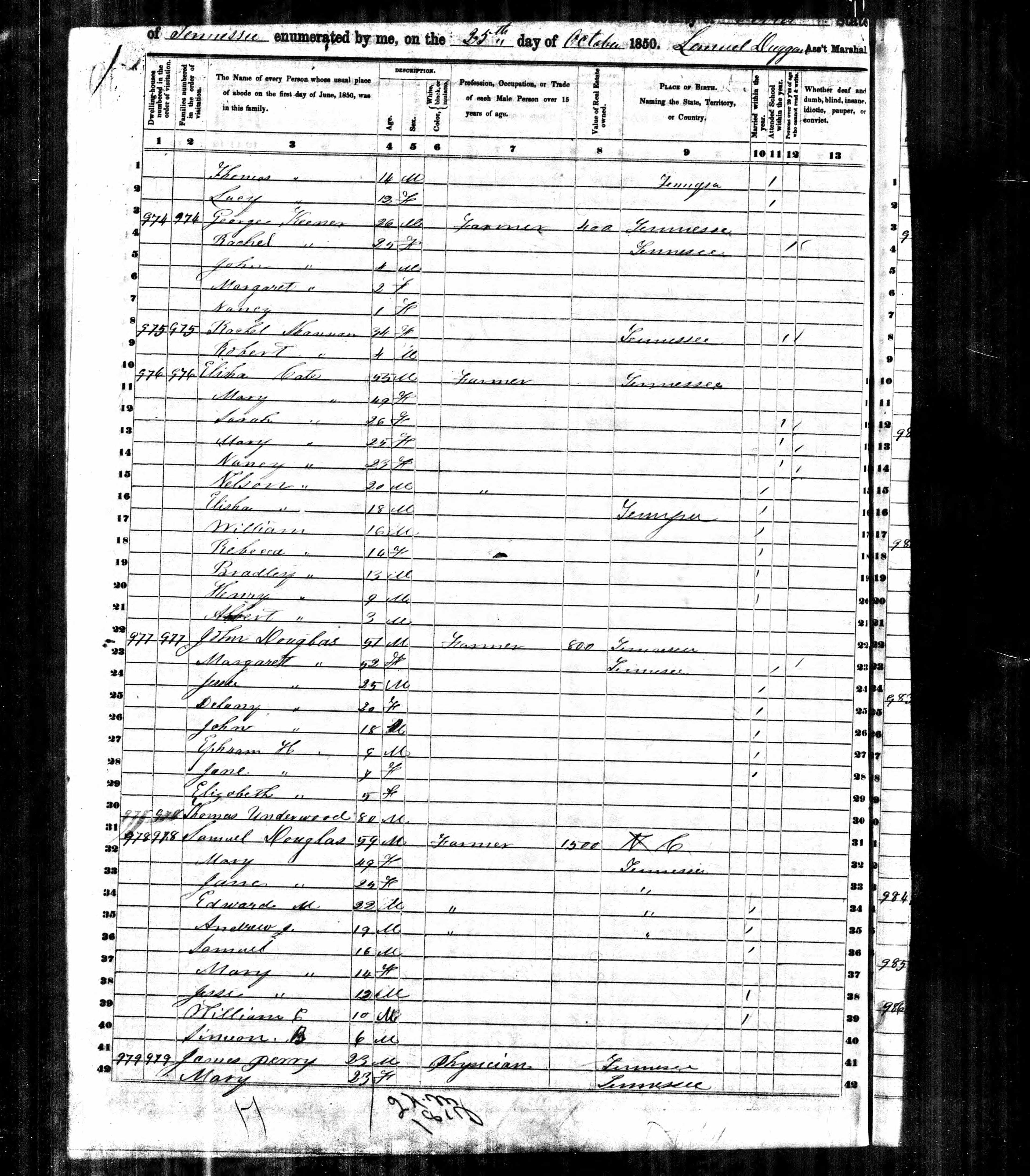 Thomas Underwood age 80 and Mary Ramey were my fifth great grandparents. Mary died in 1835. In 1850, Thomas was living with his daughter Margaret and his son-in-law John Douglas. Thomas and Mary's son Enoch Underwood was my fourth great grandfather. Enoch married his first cousin Nancy Underwood. Thomas Underwood was born in Surry County, North Carolina rather than in Tennessee. The census enumerator for Sevier County in 1850 often left the place of birth blank if it was the same as for the previous person. The enumerator left blank the birth place for all the Douglas children, allowing the birth place to default correctly to Tennessee. The enumerator then left the birth place blank for Thomas Underwood, failing to note that Thomas was born in North Carolina. |