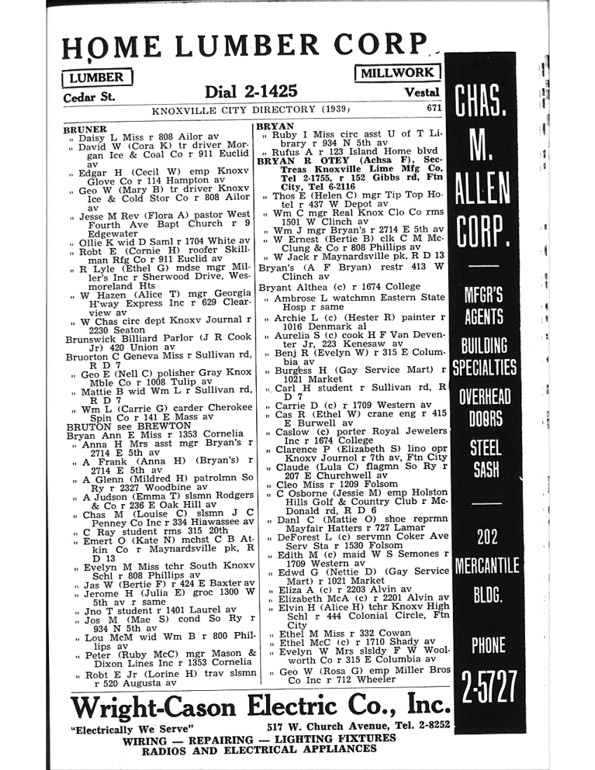 | 1936 City Directory | 1936; Knoxville, Knox County, Tennessee. Bryan E O emp C B Atkin Co.30 |