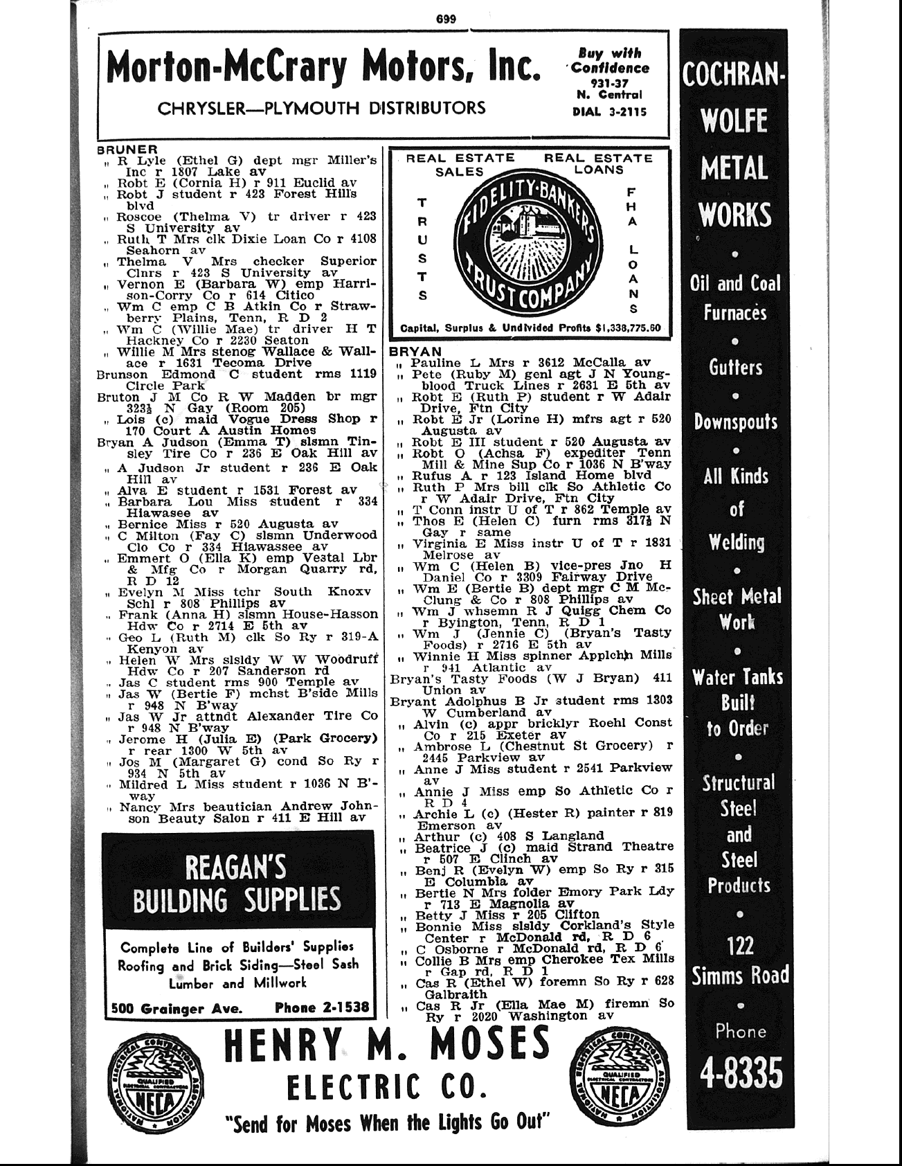 | 1953 City Directory | 1953; Knoxville, Tennessee. Bryan, Emmert O (Ella N) supt Vestal Lbr & Mfg Co r 3209 Buffat Mill rd N E.39 |