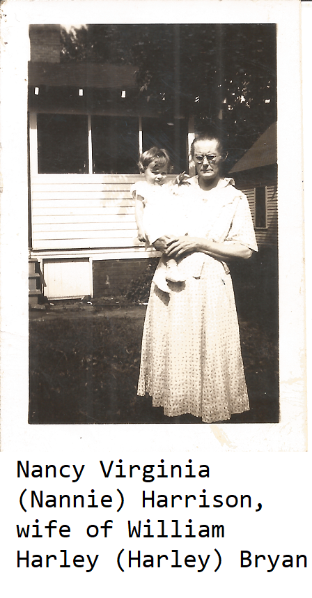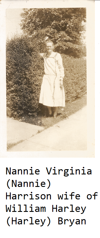 | Marriage | 24 October 1897; Nancy Virginia (Nannie) Harrison age 21 and William Harley (Harley) Bryan age 21; Shady Grove, Jefferson County, Tennessee.7,8 |