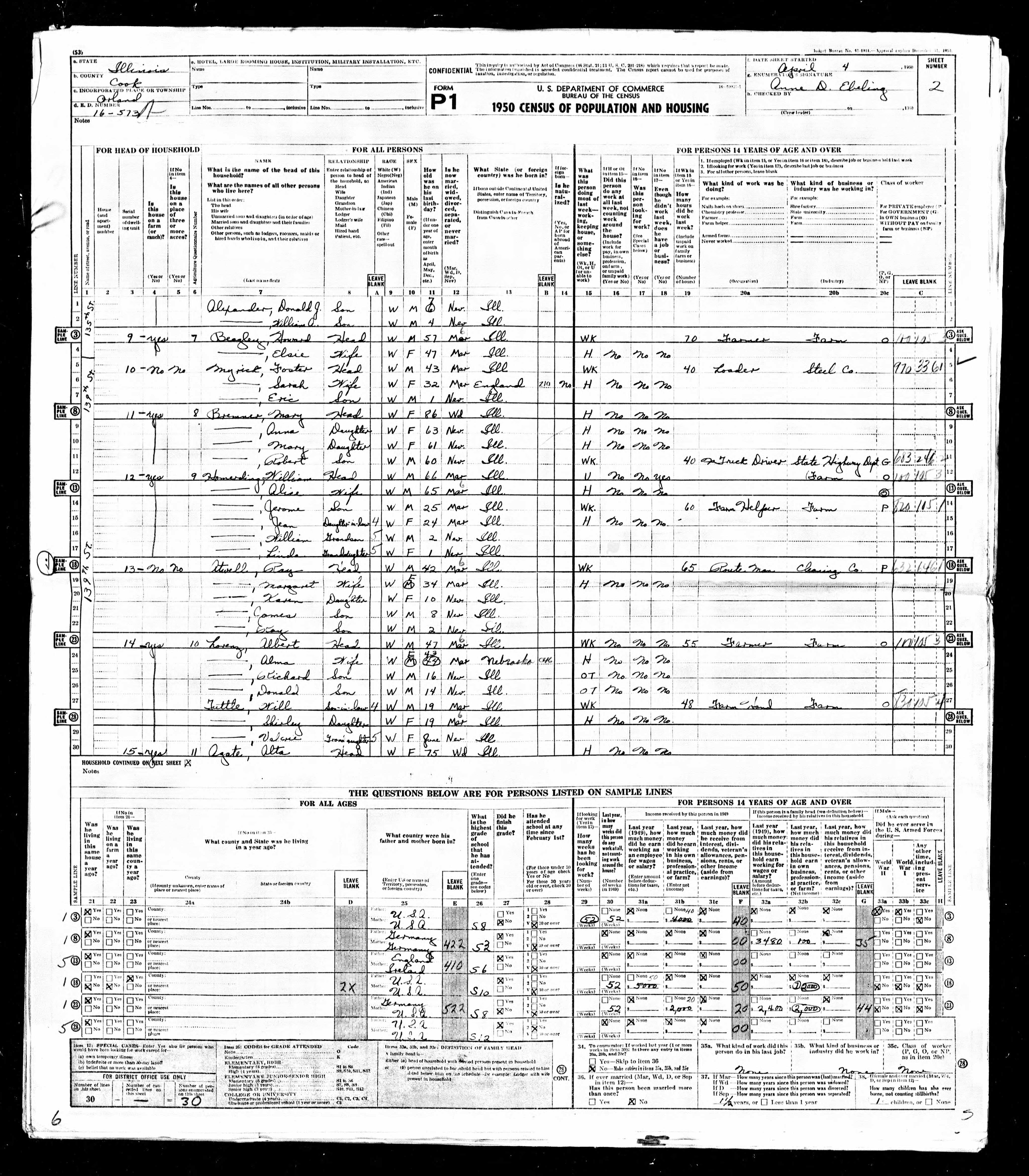 Enumeration District 16-573A, Orland, Cook County, Illinois, 4 Apr 1950, sheet 002