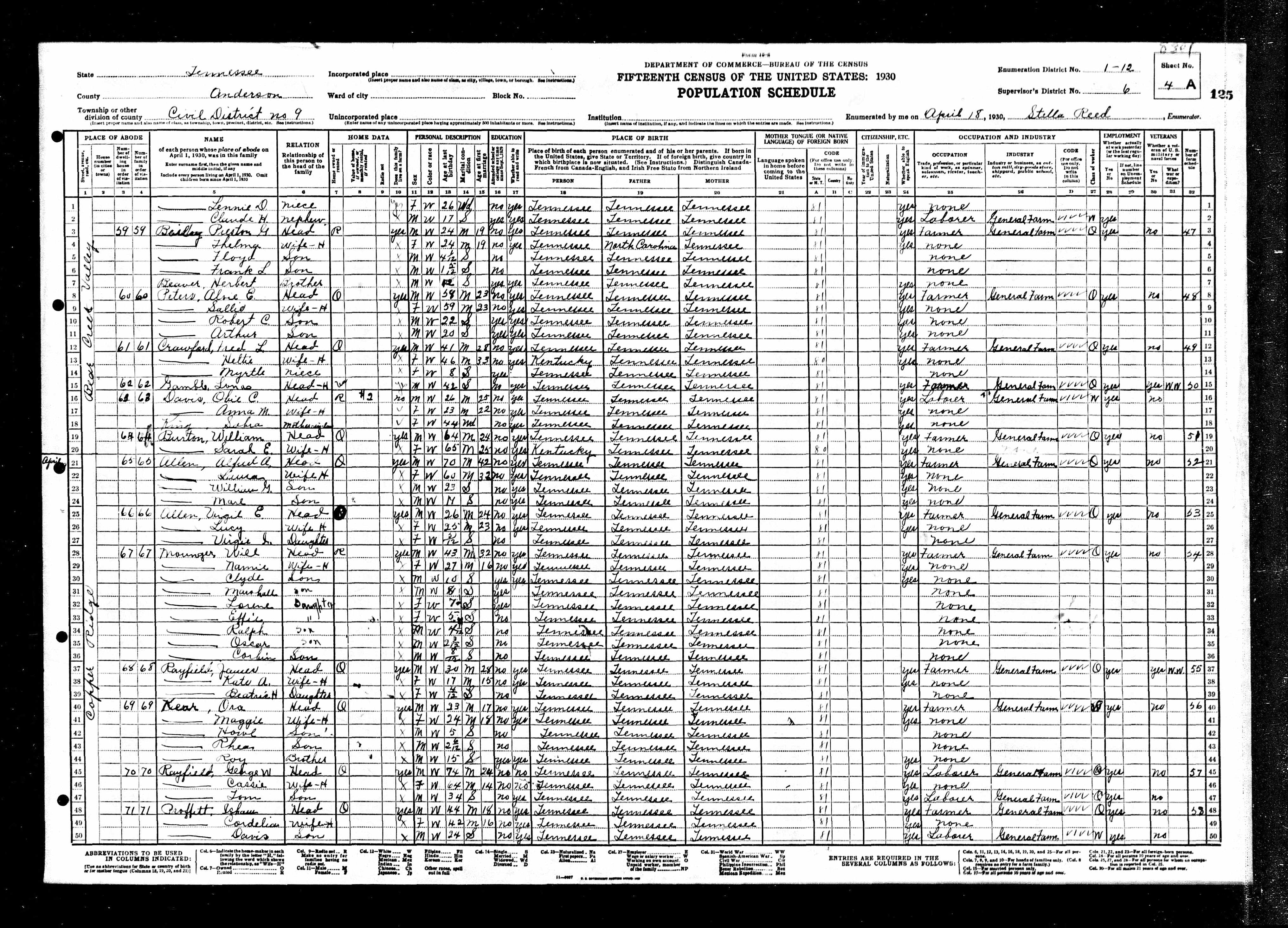 Enumeration District 1-12, Dist. 9, Anderson County, Tennessee, 22 Apr 1930