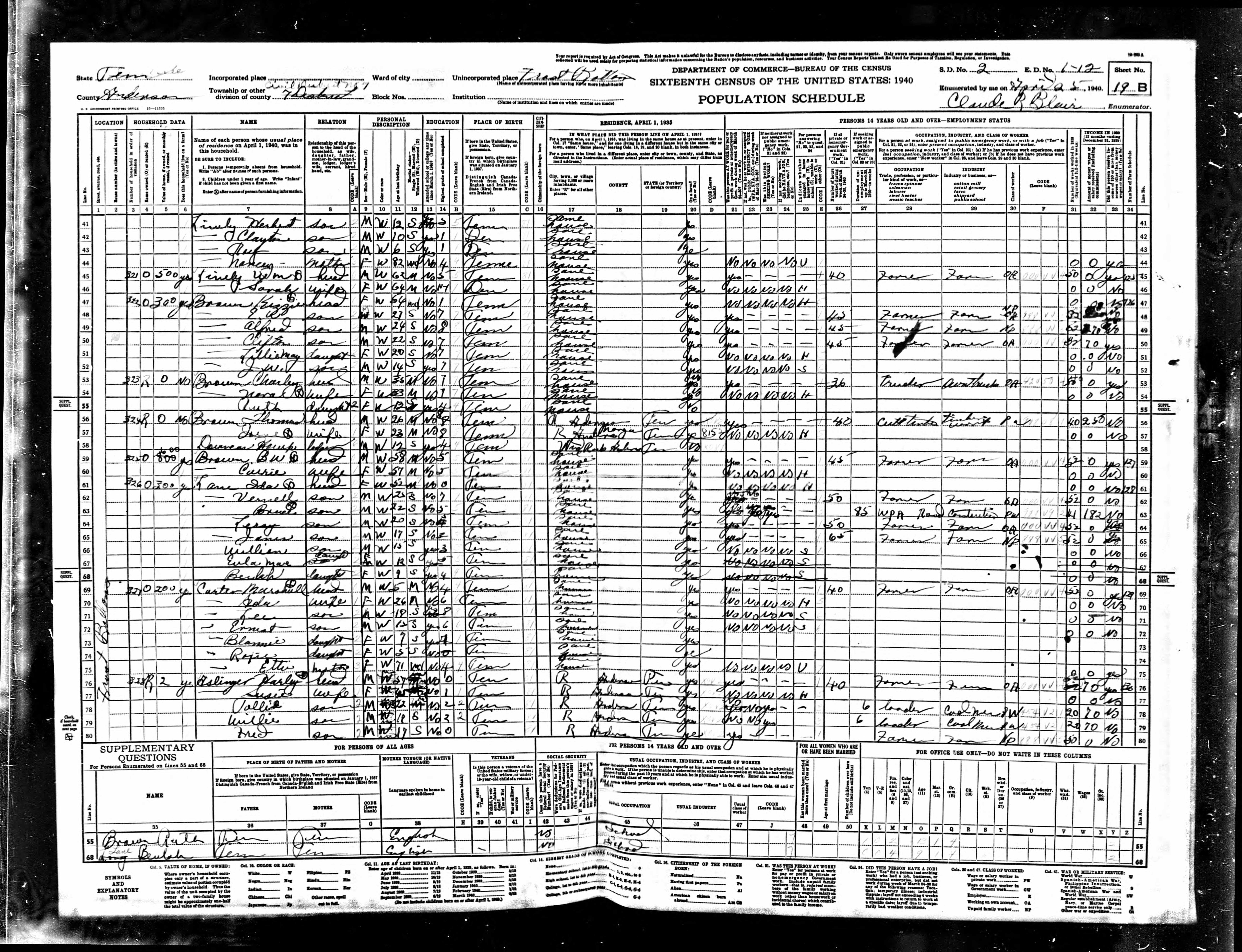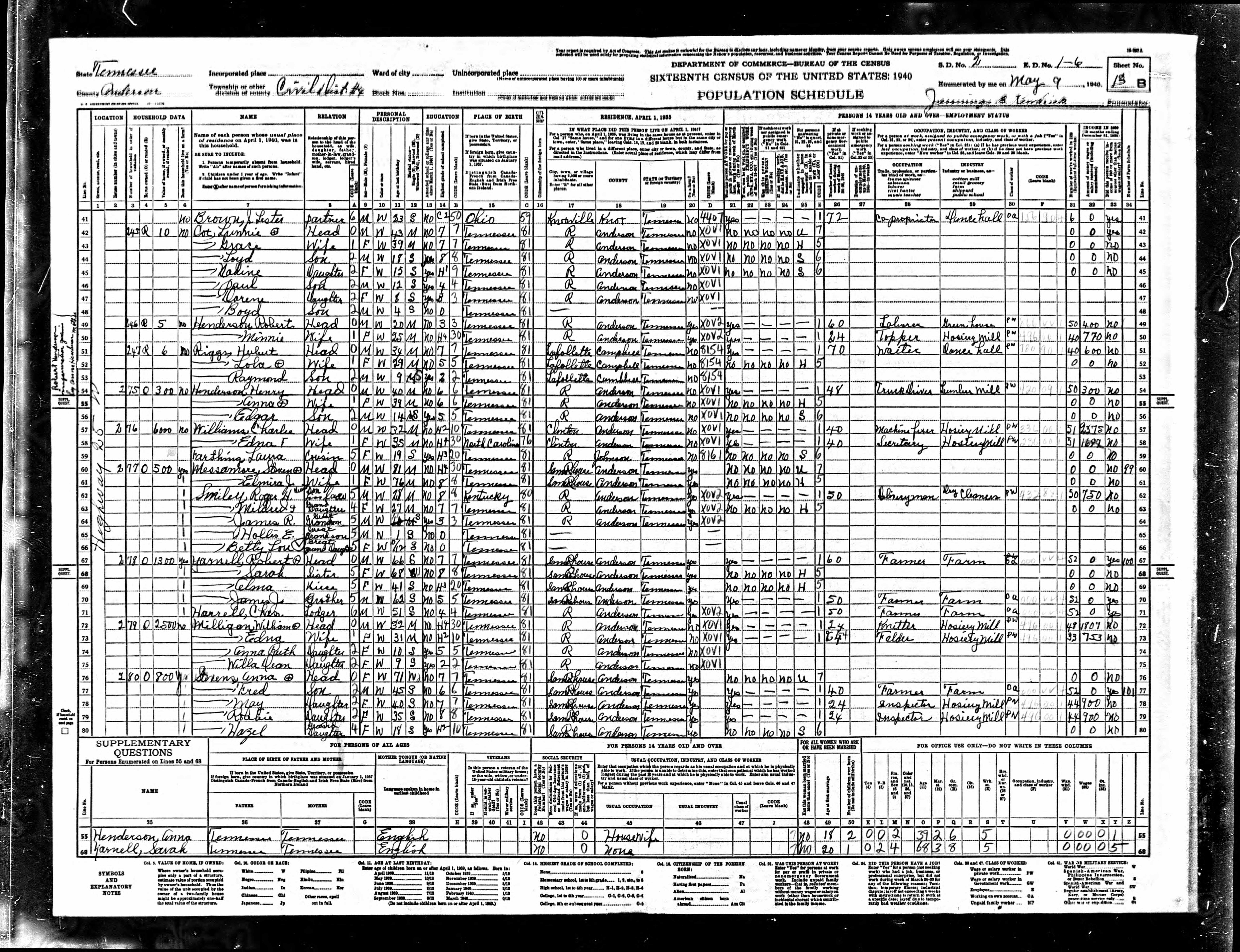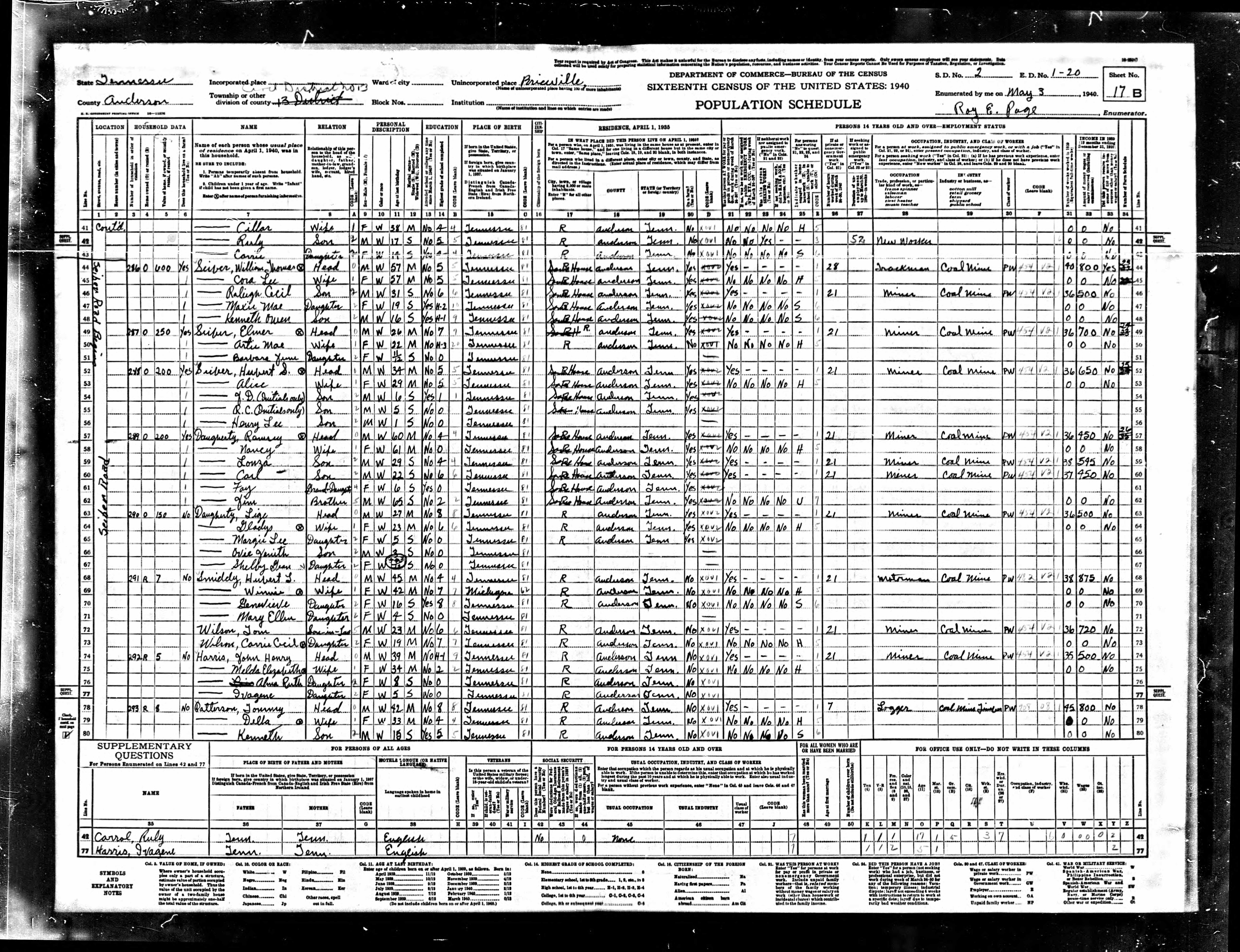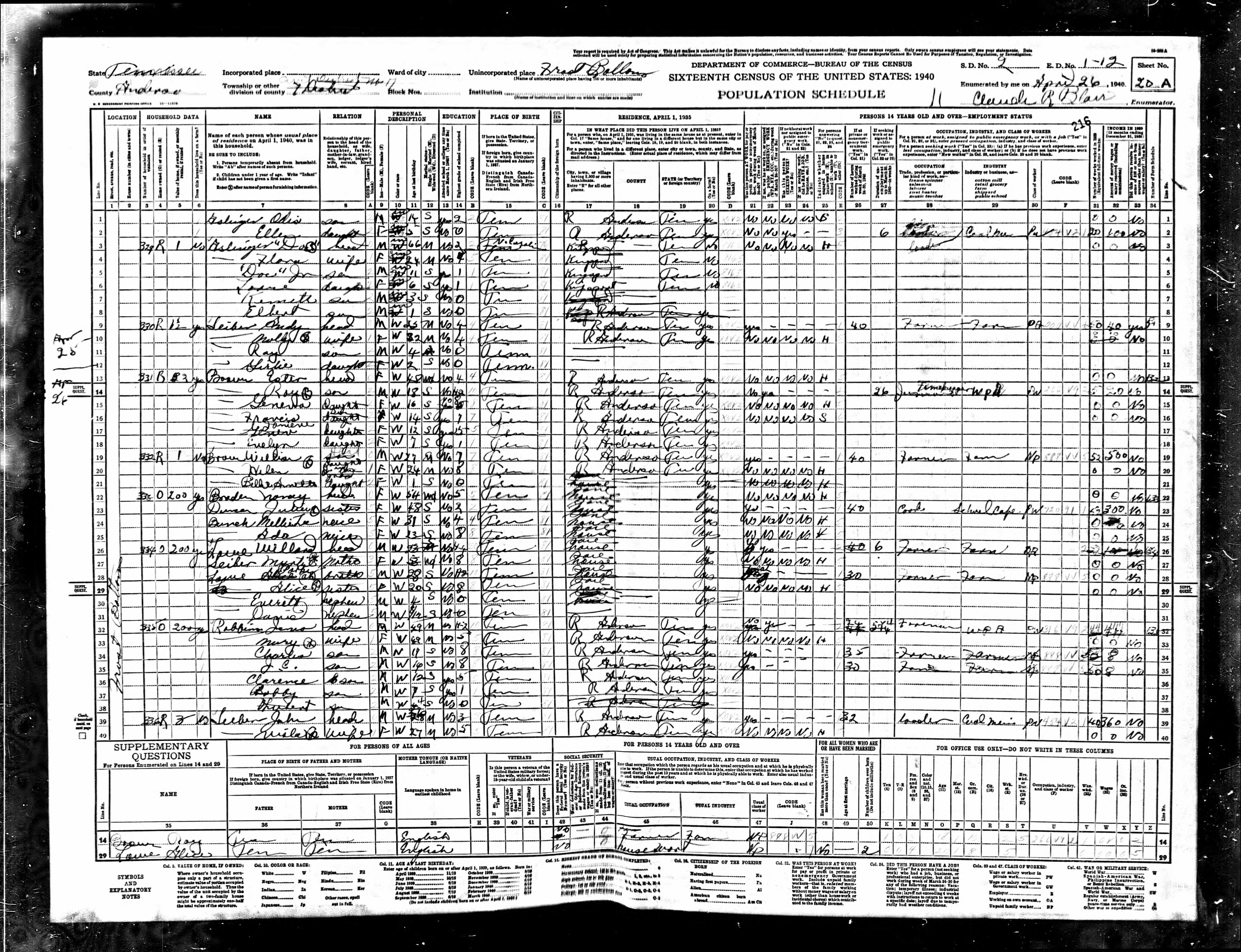 Dist. 13, Enumeration District 1-20, Briceville, Anderson County, Tennessee, 3 May 1940