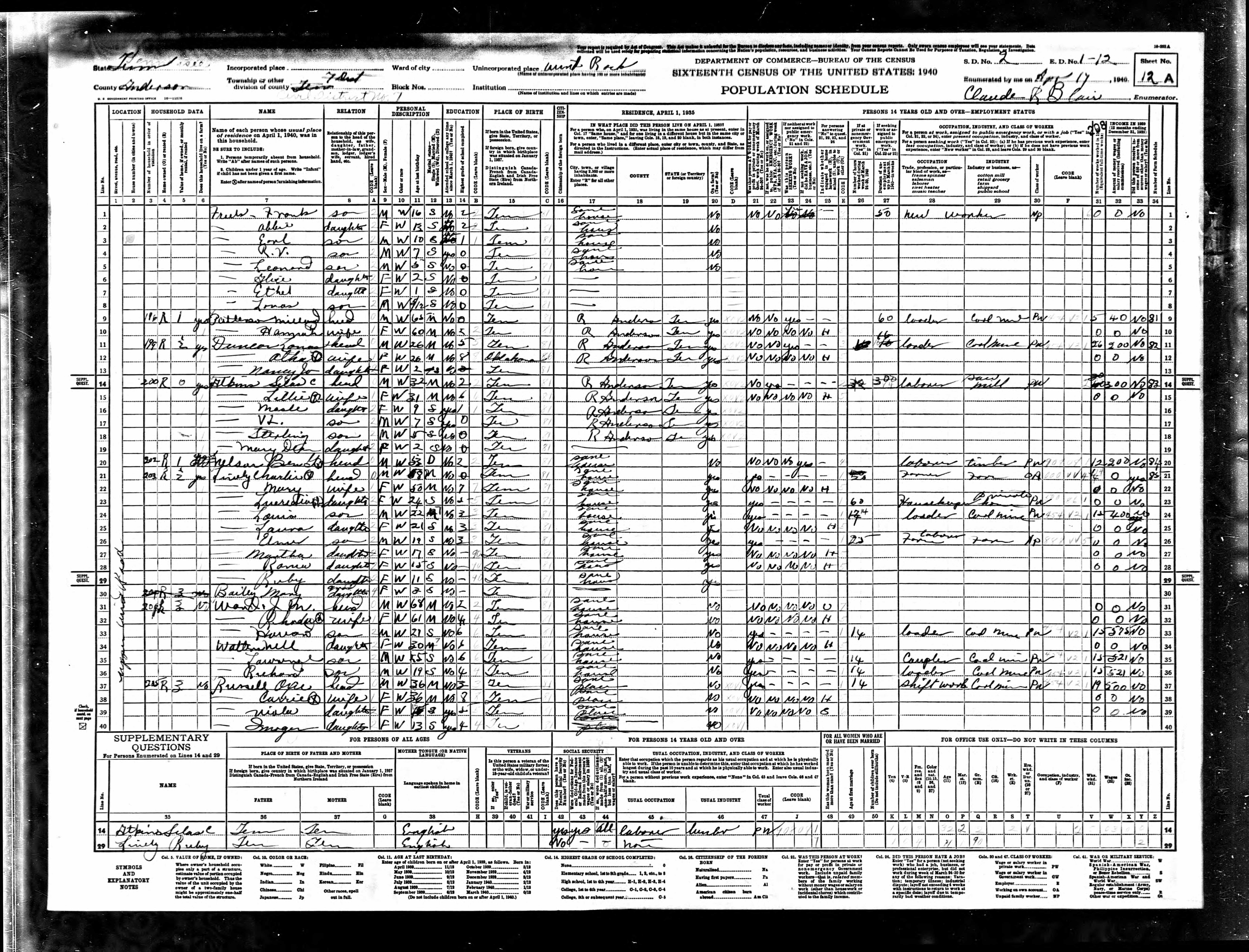 Wind Rock, Dist. 7, Enumeration District 1-12, Anderson County, Tennessee, 17 Apr 1940