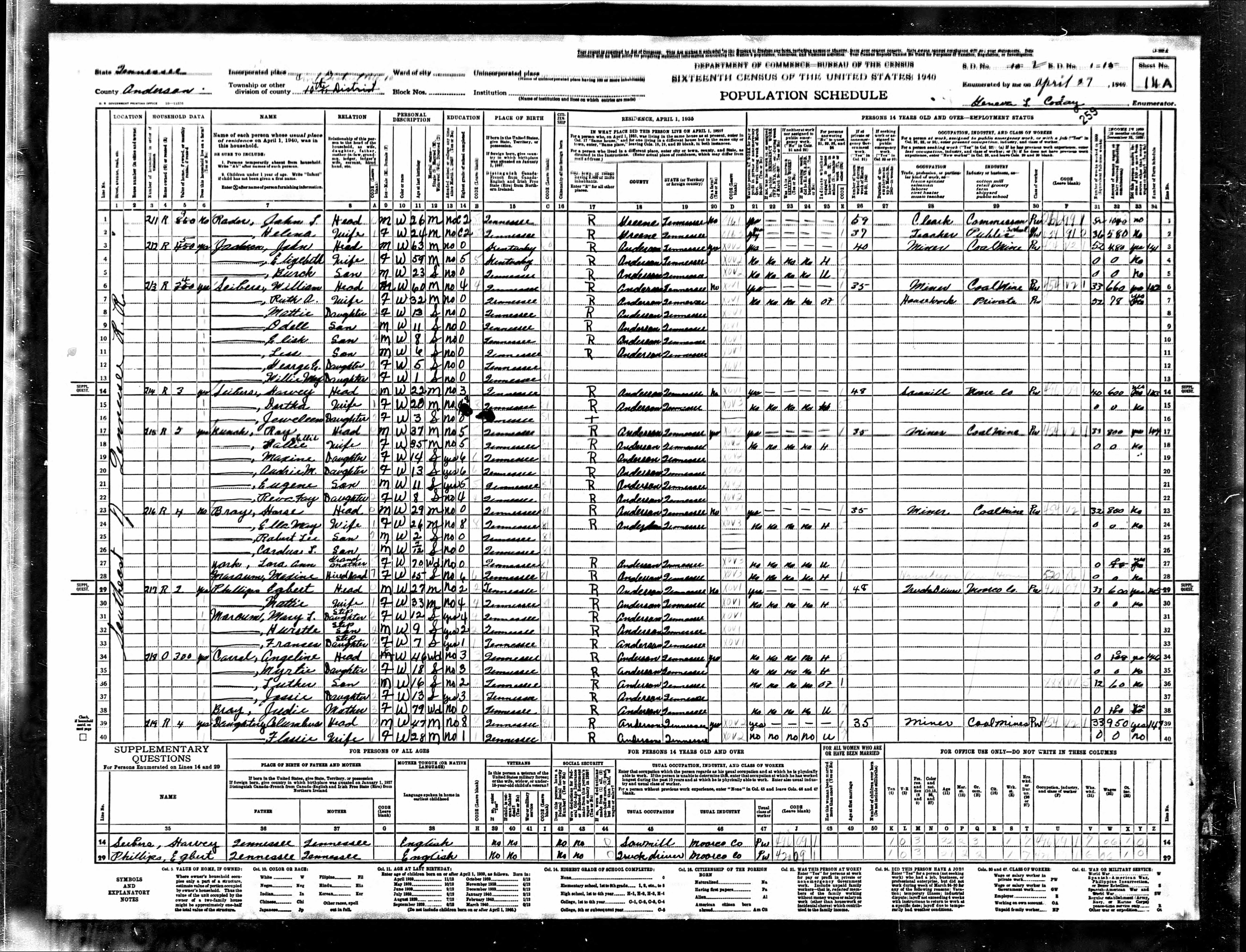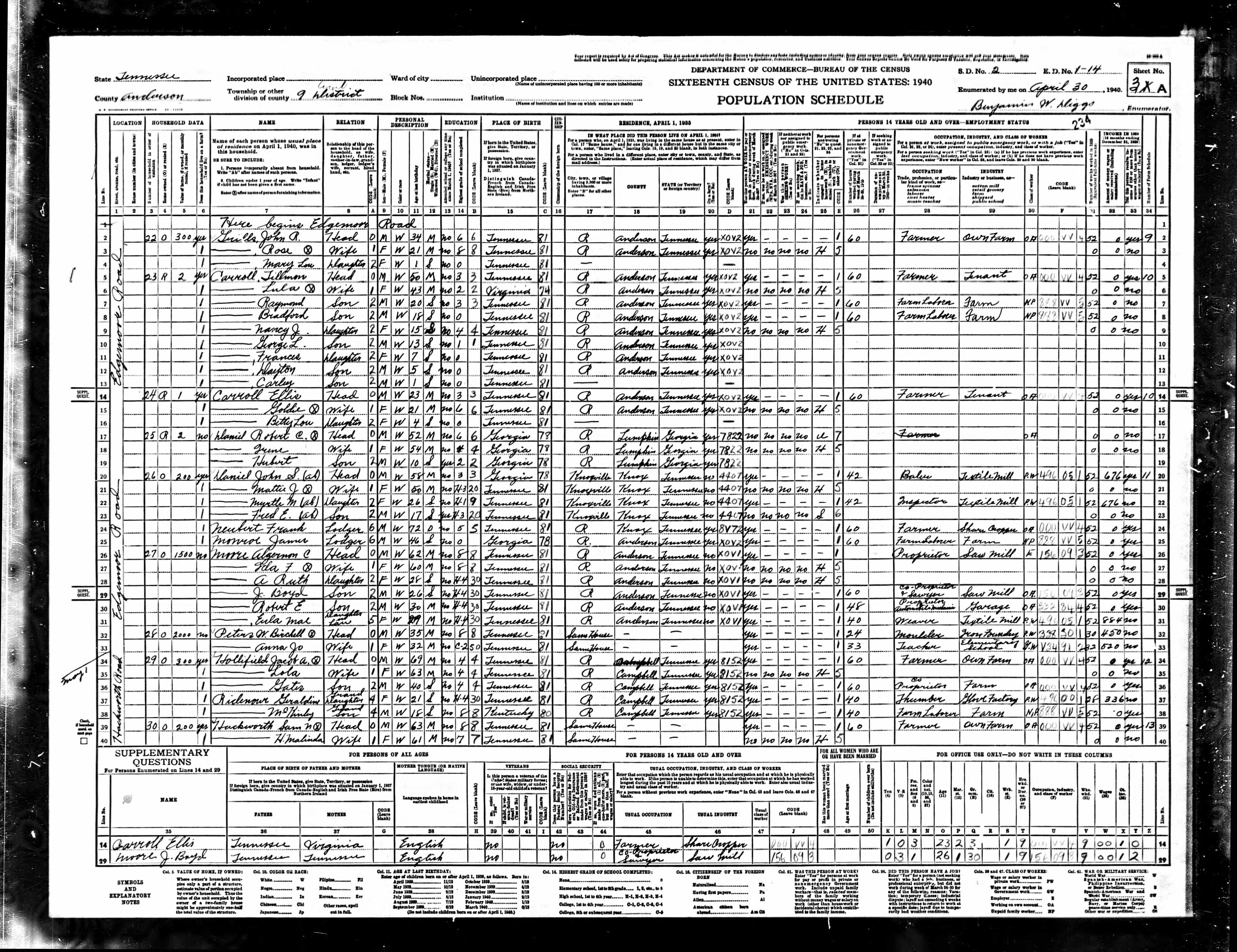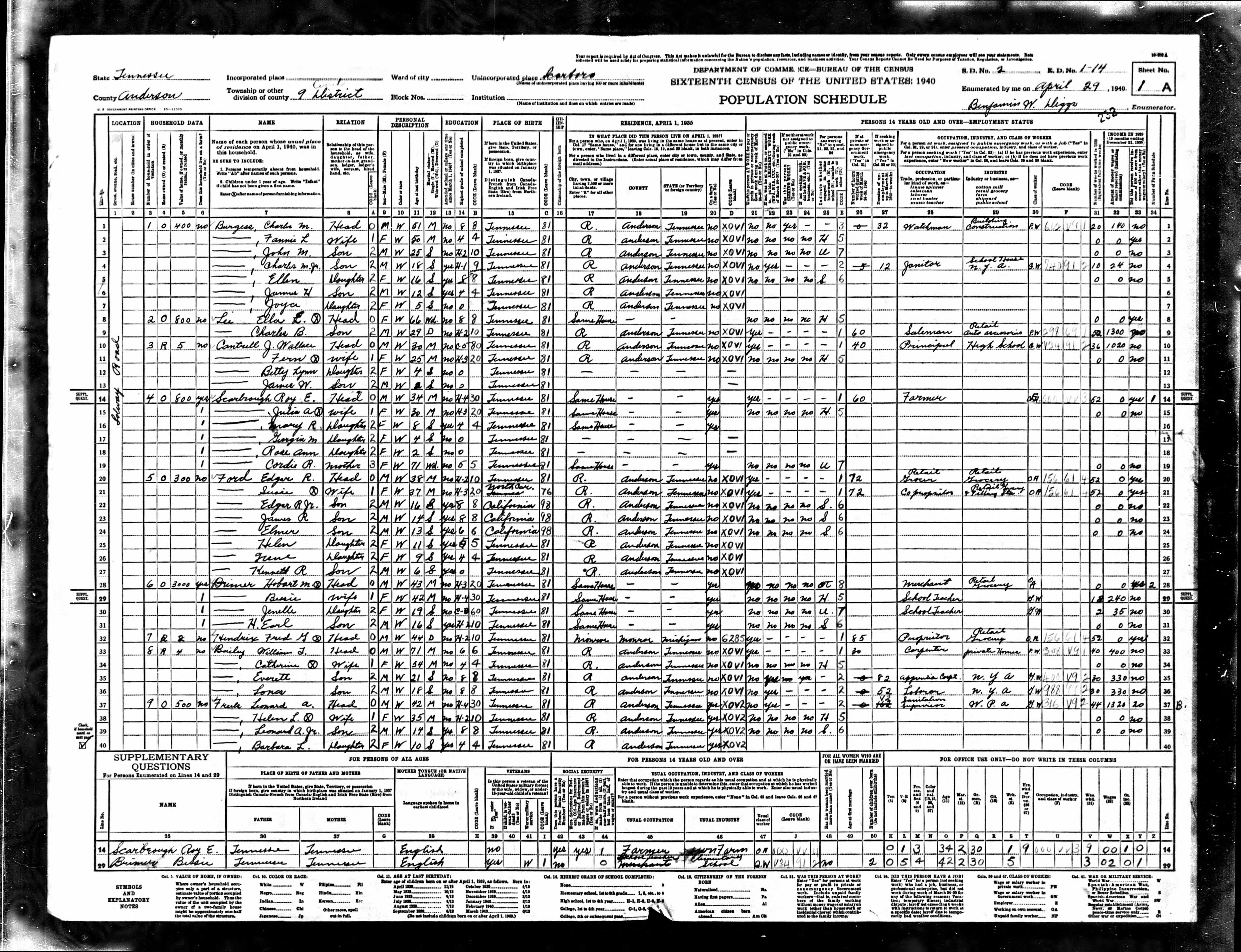 Dist. 9, Enumeration District 1-14, Scarboro, Anderson County, Tennessee, 29 Apr 1940
