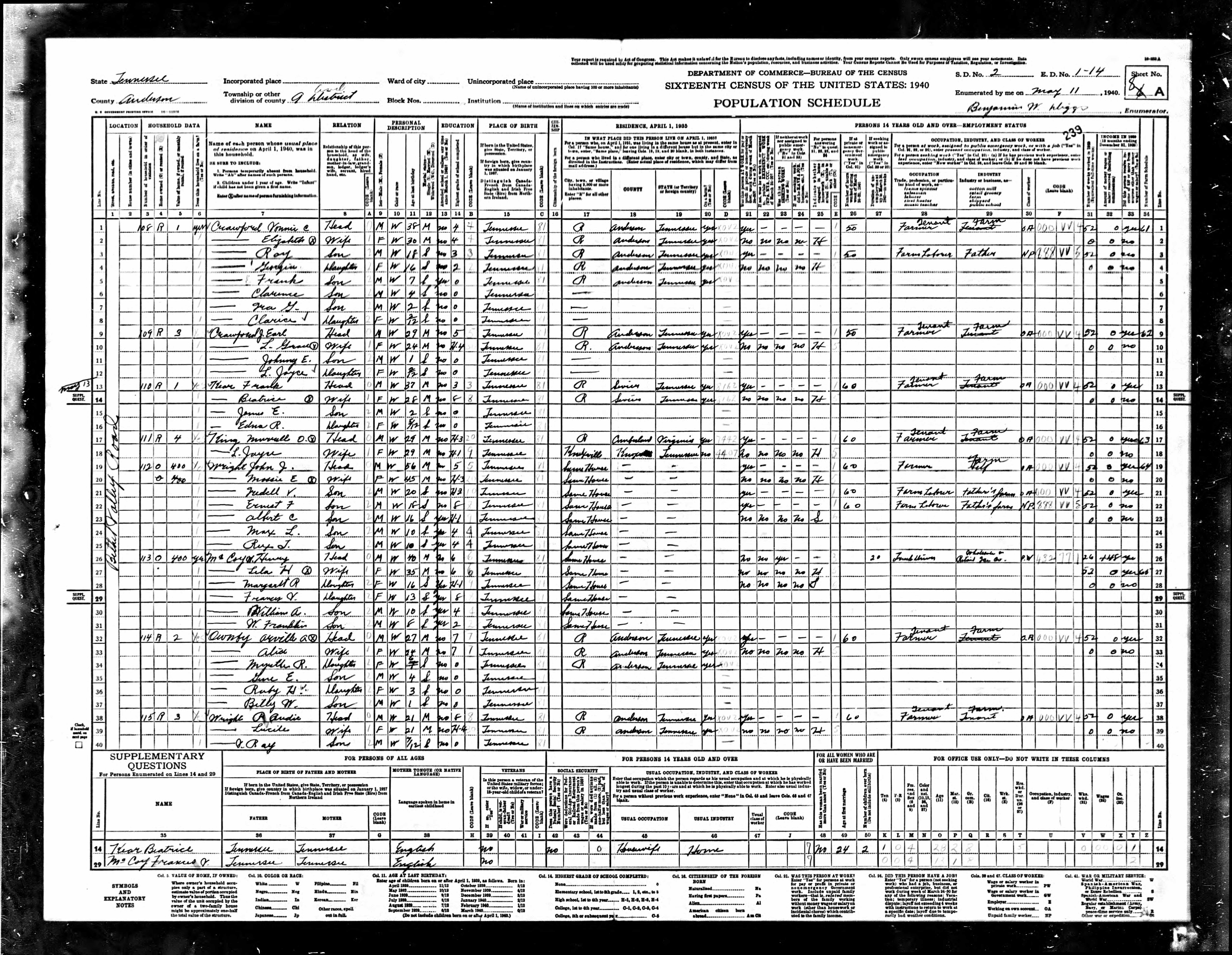 1940, Dist. 9, Enumeration District 1-14, Anderson County, Tennessee, page 239a |