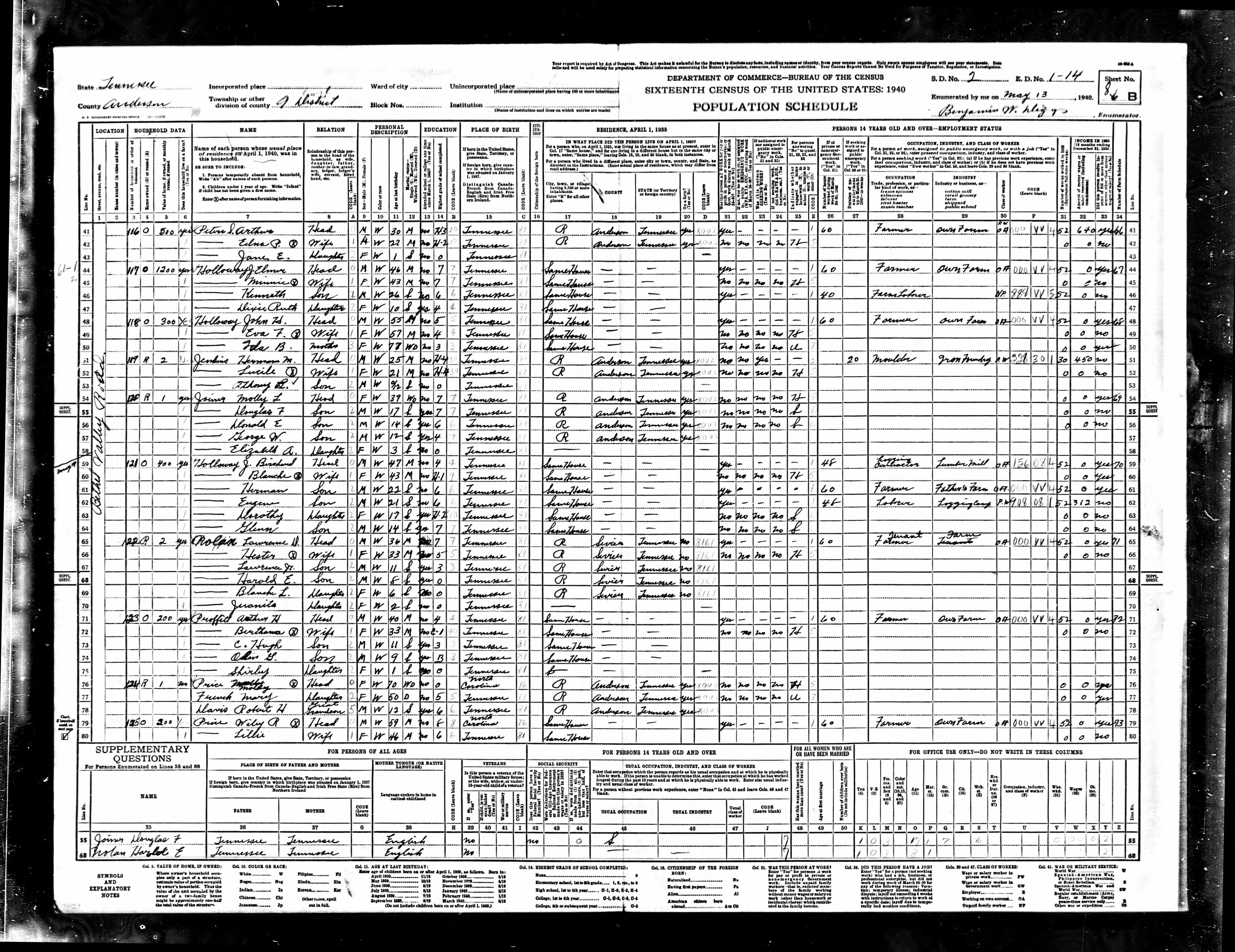 Dist. 9, Enumeration District 1-14, Anderson County, Tennessee, 20 May 1940