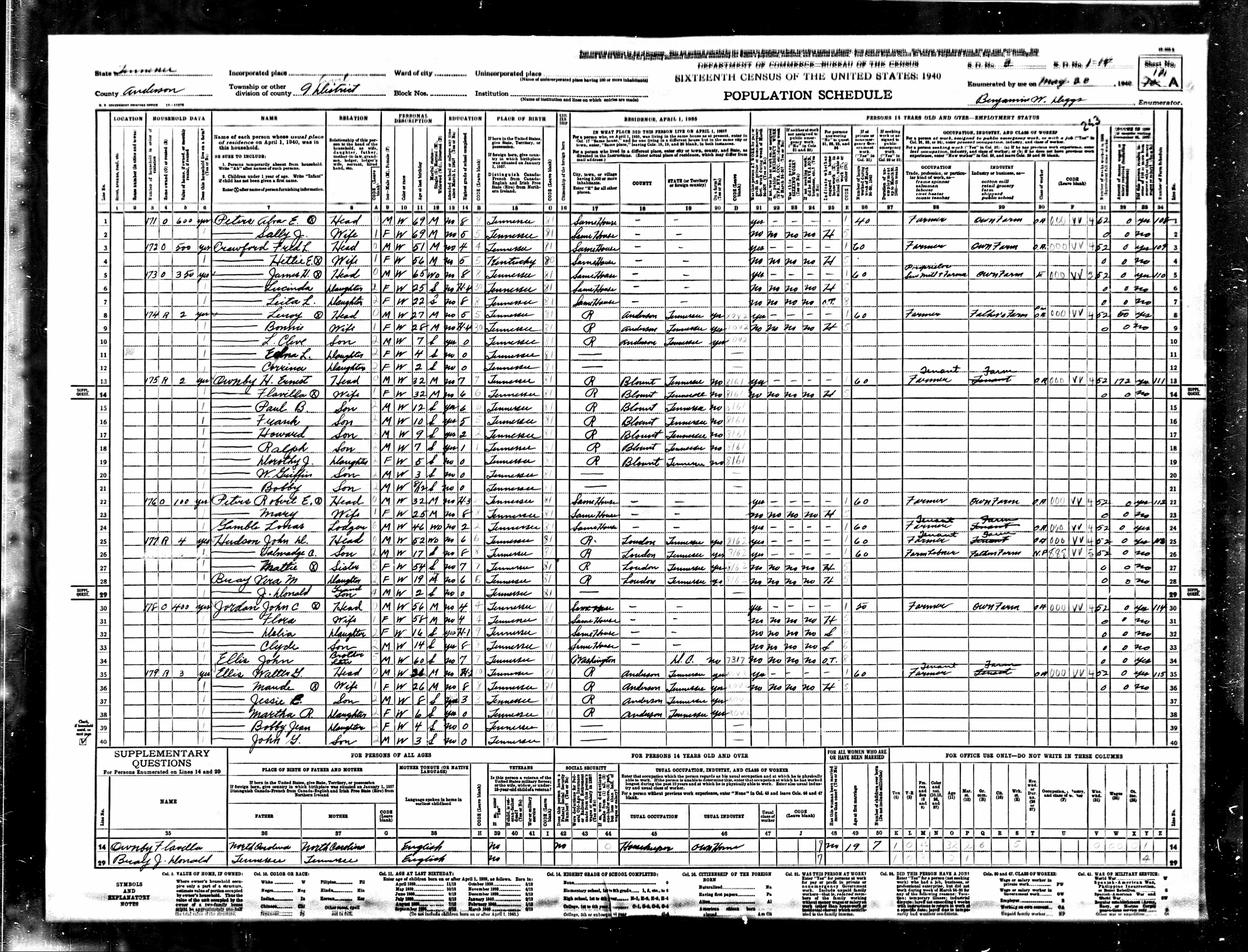 Dist. 9, Enumeration District 1-14, Anderson County, Tennessee, 20 May 1940 page 243a, sheet 12a, dwelling number 171, owns property worth $600 Peters Alva 69 head m m w farmer 8 years school, born TN, lived 1935 same house, no salary income Sally J. 69 wife f m w 5 years school, born TN, lived 1935 same house |