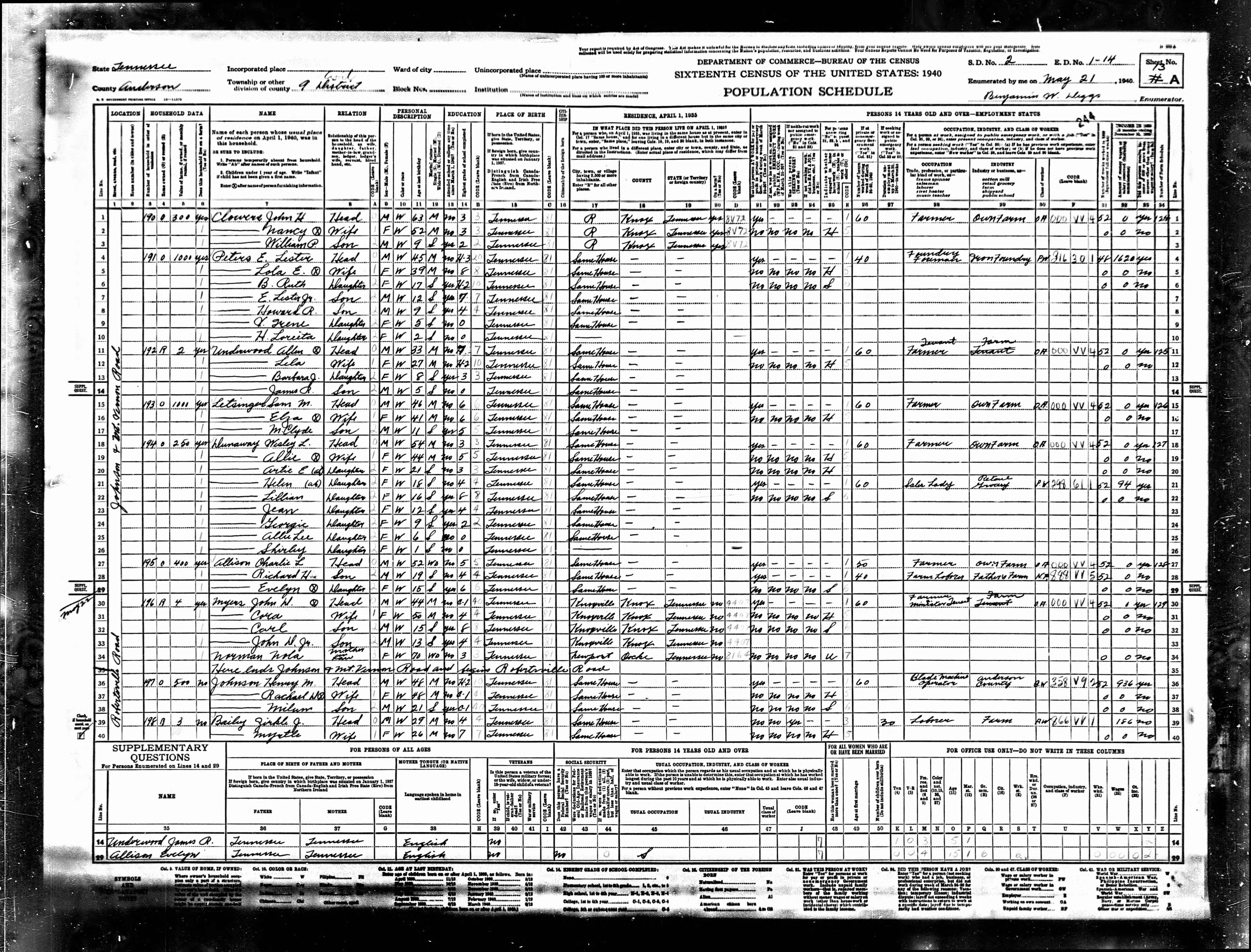 Enumeration District 1-14, Dist. 9, Anderson County, Tennessee, 21 May 1940, page 244a, sheet 13a dwelling number 191, Johnson and Mt. Vernon Road, owns property worth $1000 Peters E. Lester 45 head m m w foundry foreman iron foundry 3 years high school, born TN, lived 1935 same house, $1620 salary Lola E. 39 wife f m w 8 years school, born TN, lived 1935 same house B. Ruth 17 dau f s w 2 years high school, born TN, lived 1935 same house E. Lester Jr. 12 son m s w 7 years school, born TN, lived 1935 same house Howard R. 9 son f s w 4 years school, born TN, lived 1935 same house V. Irene 5 dau f s w born TN, lived 1935 same house H. Lorieta 2 dau f s w born TN |