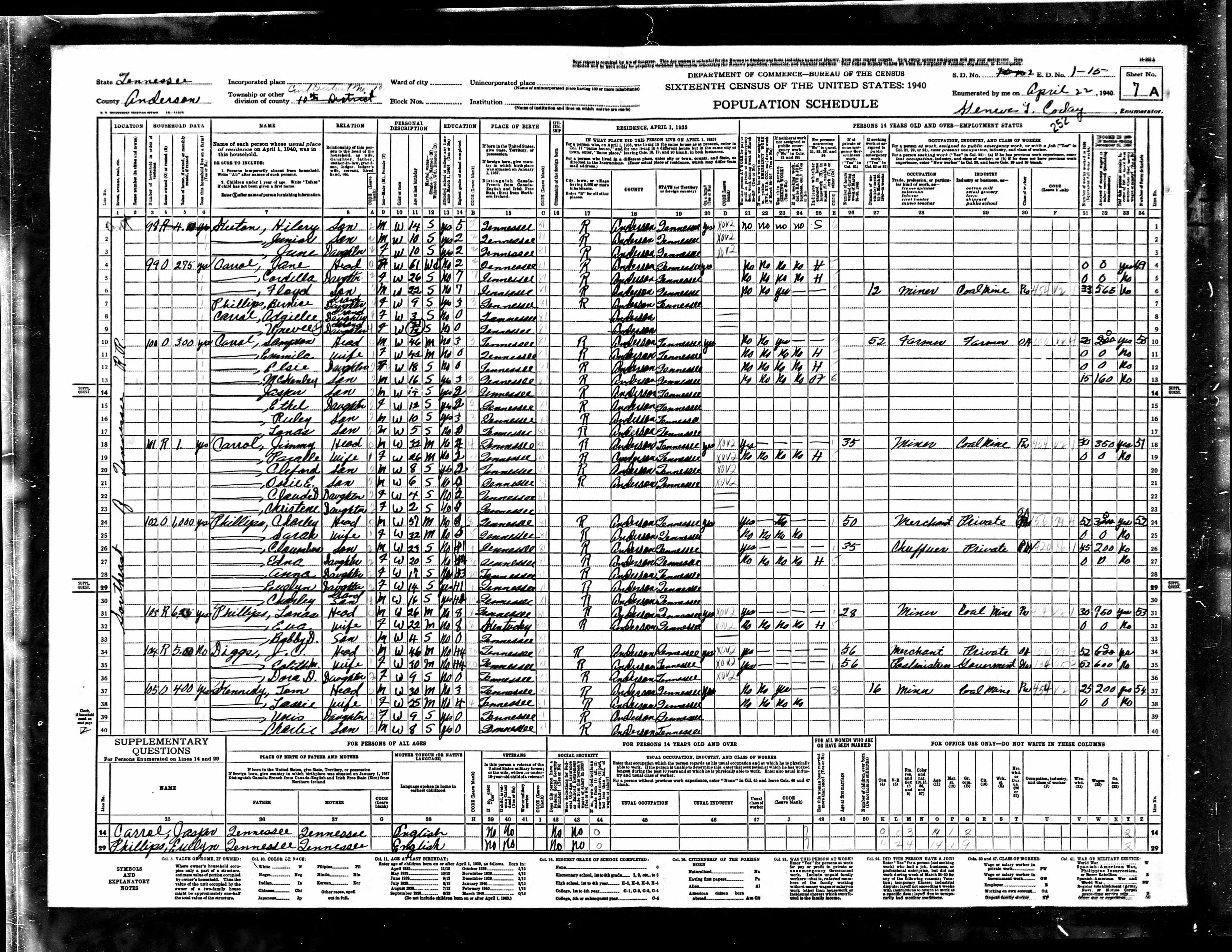 Dist. 10, Enumeration District 1-15, Anderson County, Tennessee, 22 Apr 1940