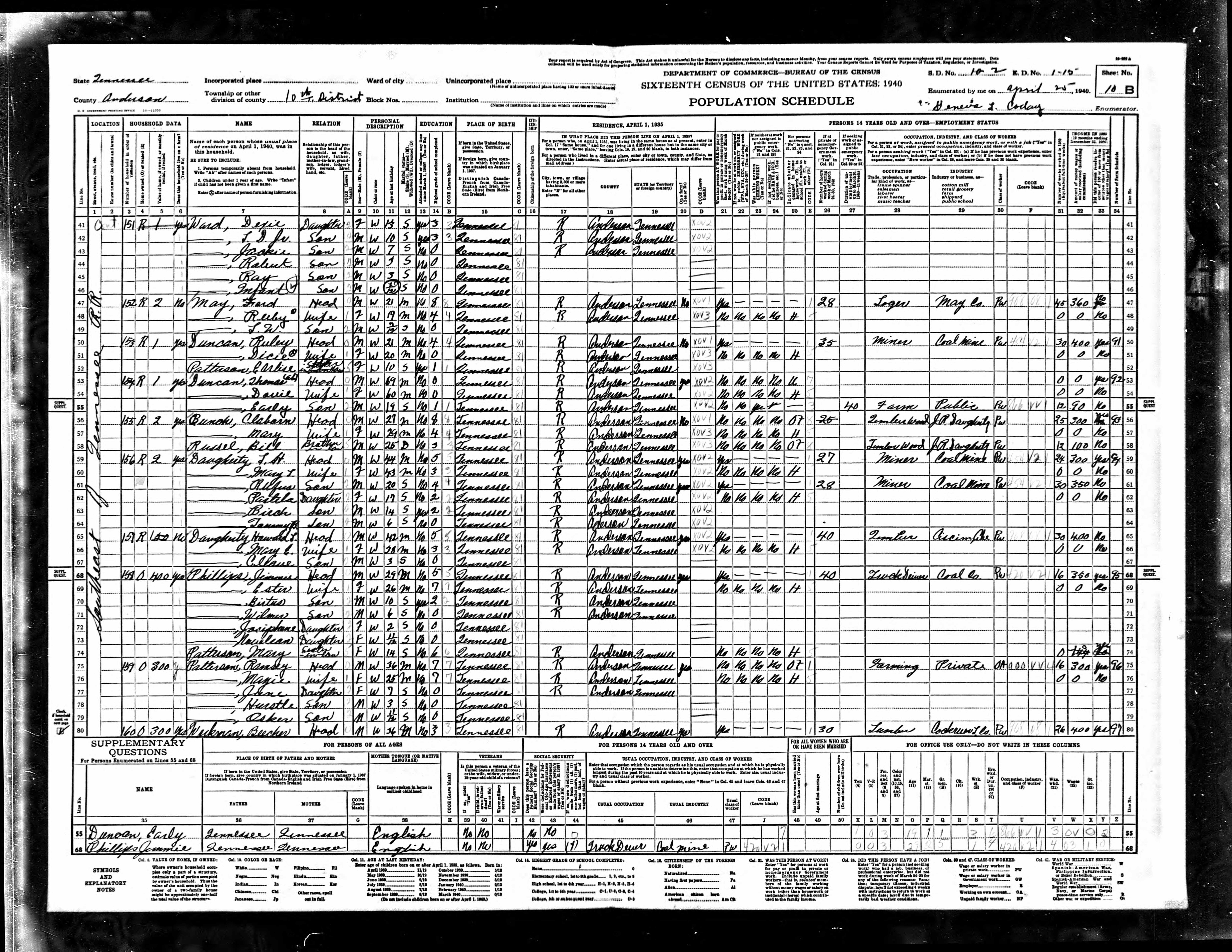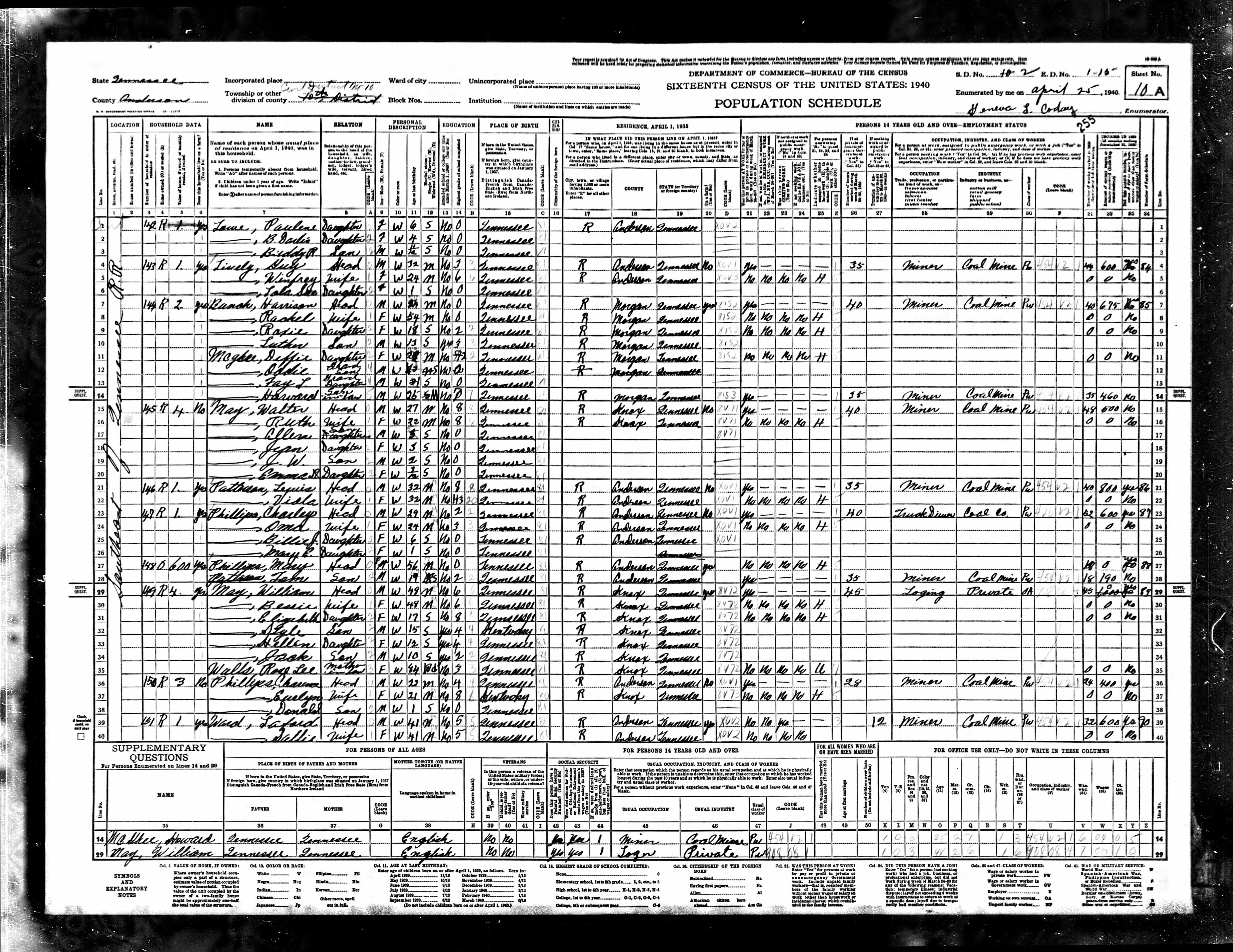 Dist. 10, Enumeration District 1-15, Anderson County, Tennessee, 25 Apr 1940