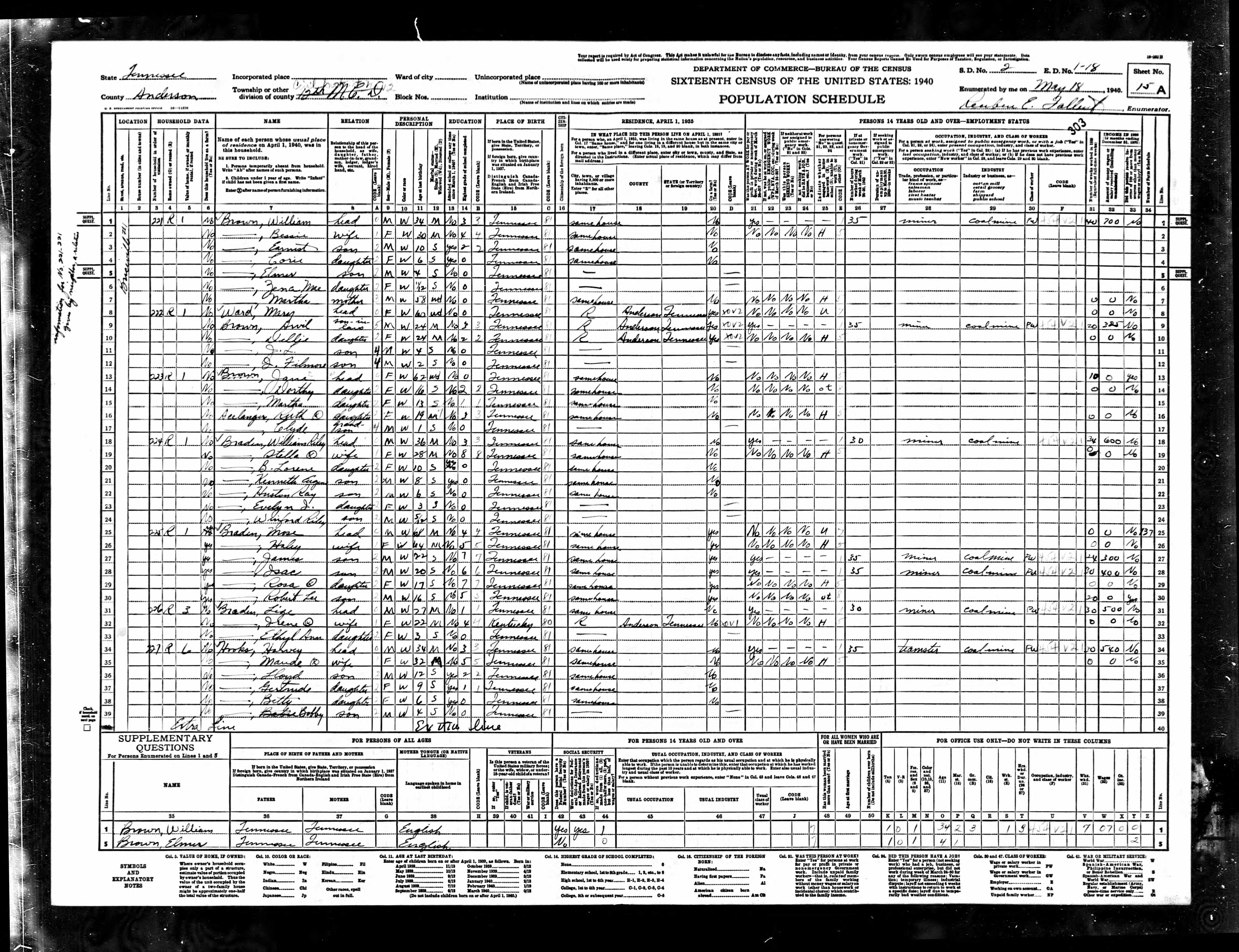Dist. 12, Enumeration District 1-18, Anderson County, Tennessee, 18 May 1940