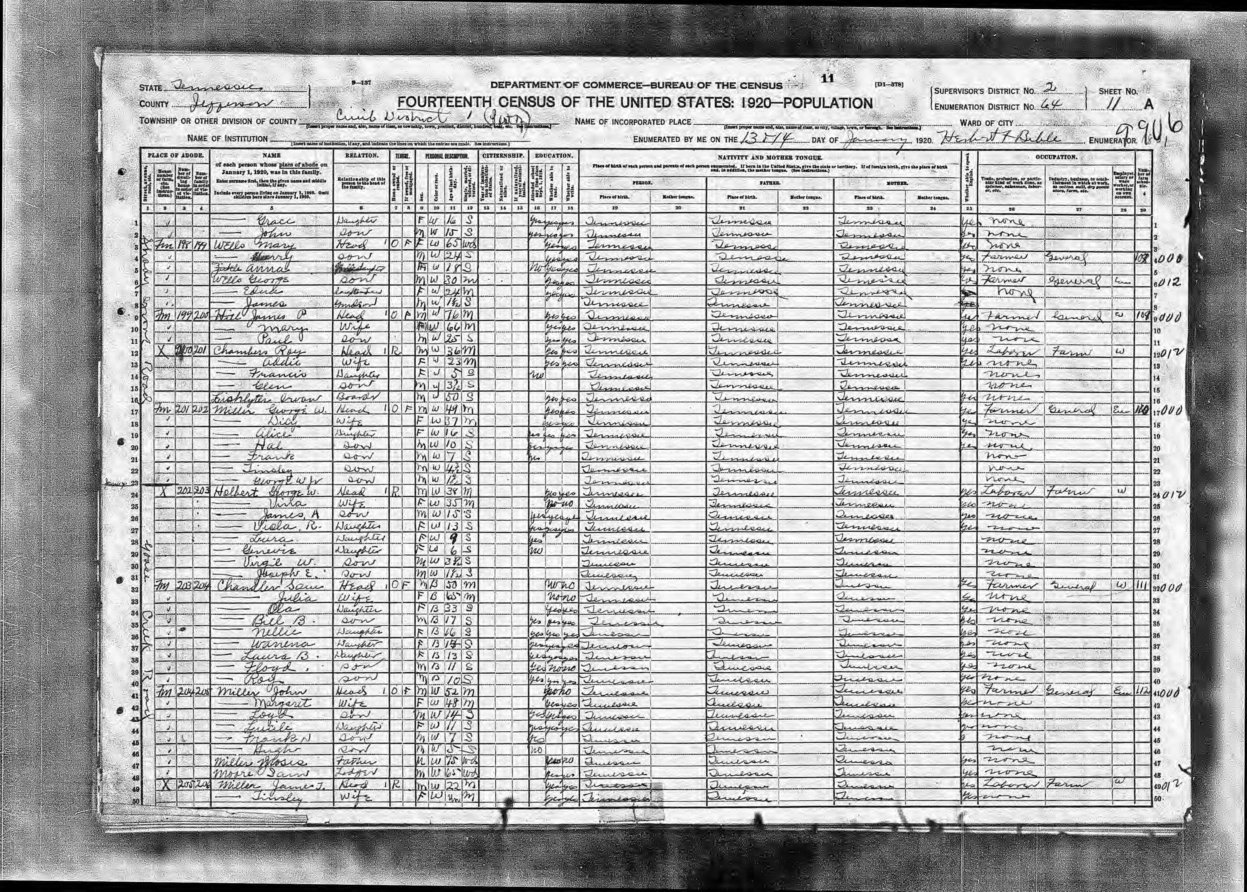 Enumeration District 64, Dist. 1, Jefferson County, Tennessee, 14 Jan 1920, enumerated by Herbert F. Bible