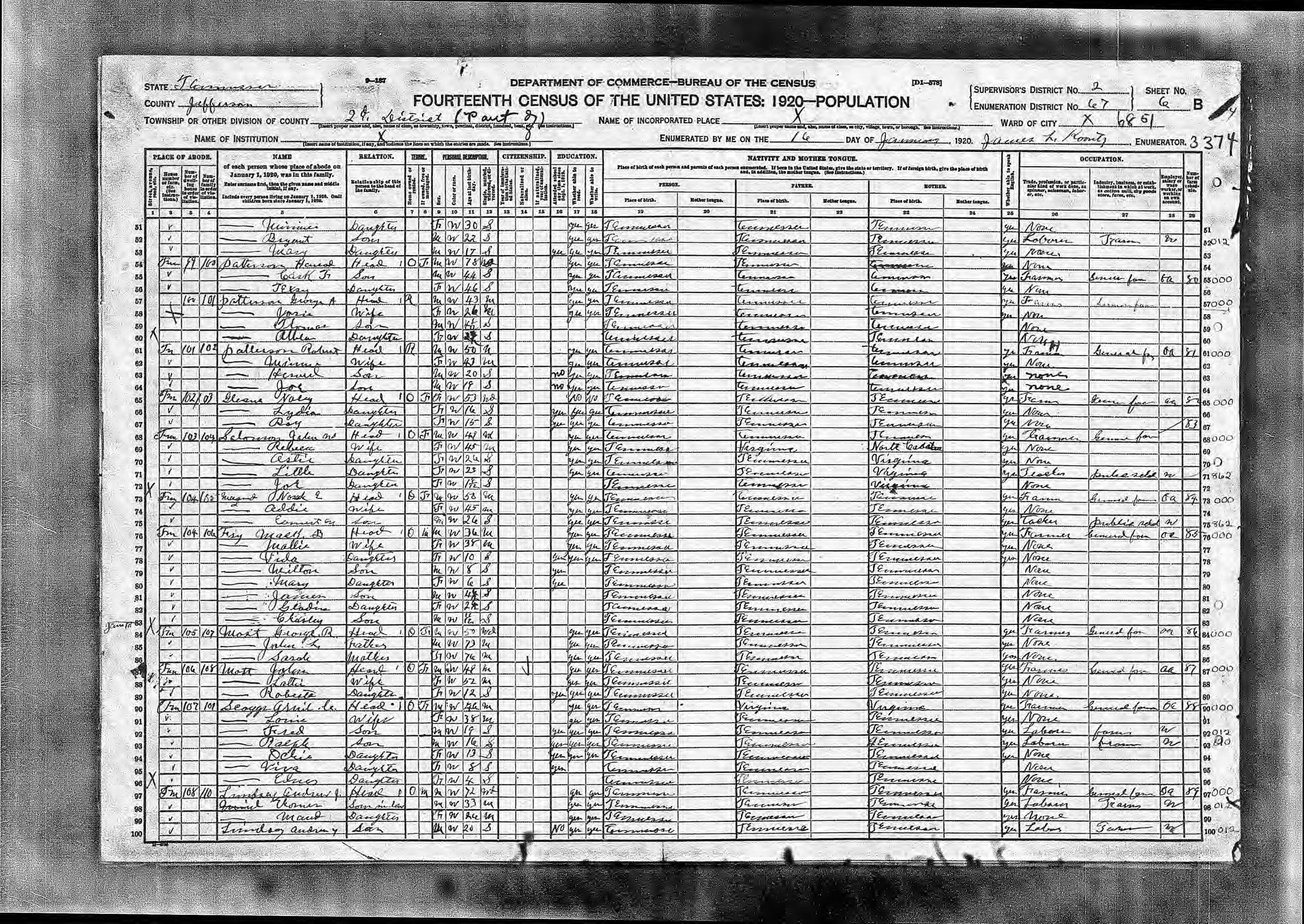 Enumeration District 64, Dist. 1, Jefferson County, Tennessee, 14-15 Jan 1920