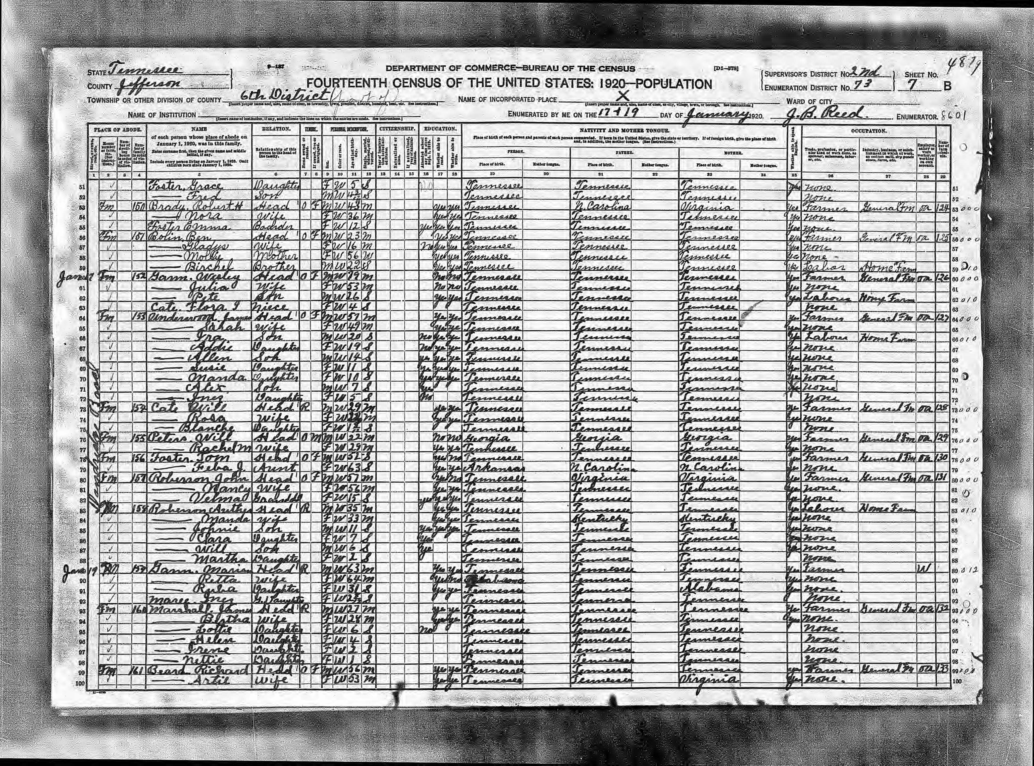 Enumeration District 73, Dist. 6, Jefferson County, Tennessee, 17 & 19 Jan 1920