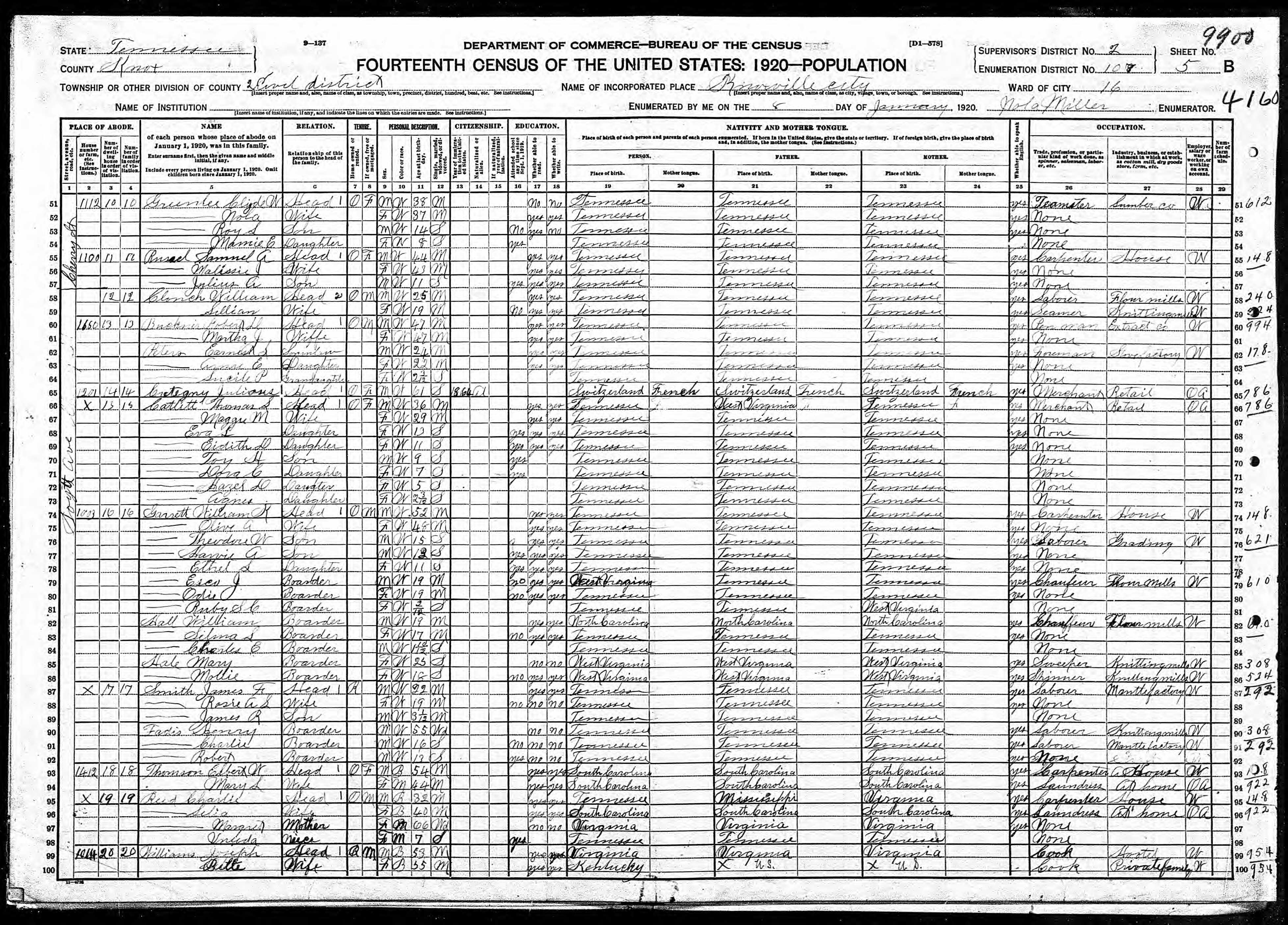 Dist. 2, Enumeration District 109, Knoxville City, Knox County, 7 Jan 1920