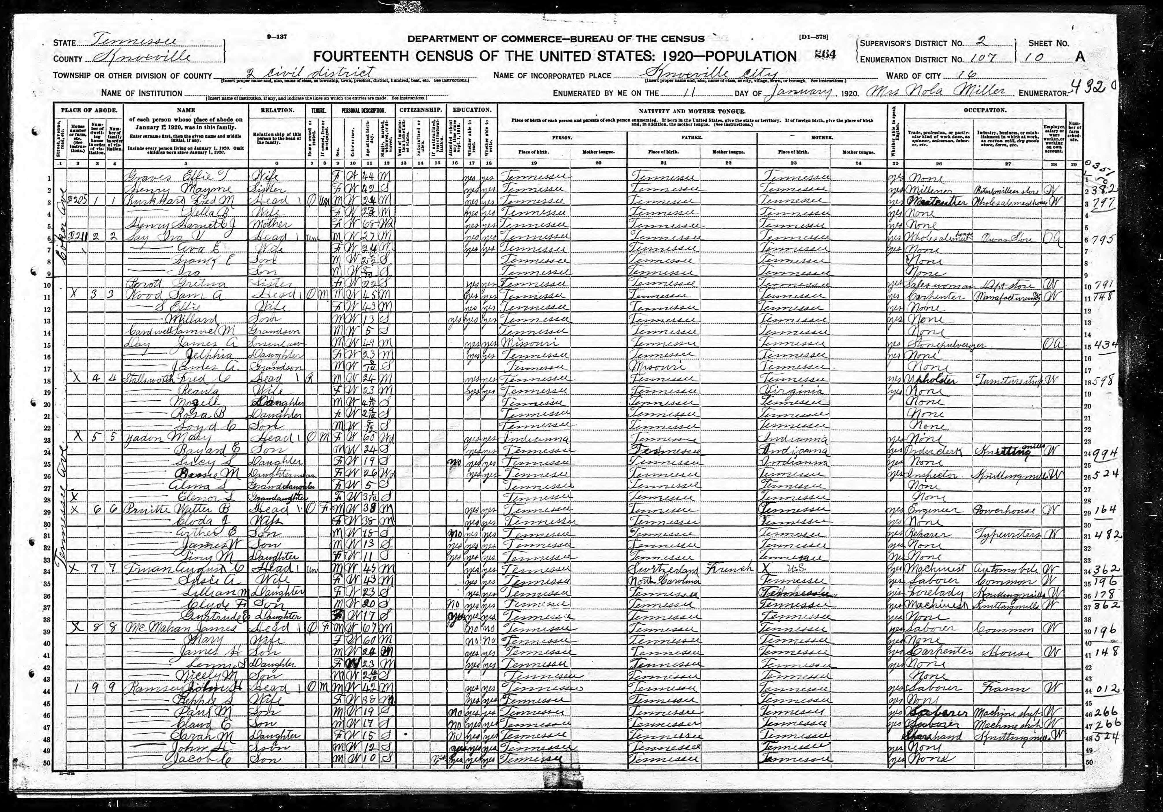 Enumeration District 107, Dist. 2, Knoxville City, Knox County, 11 Jan 1920