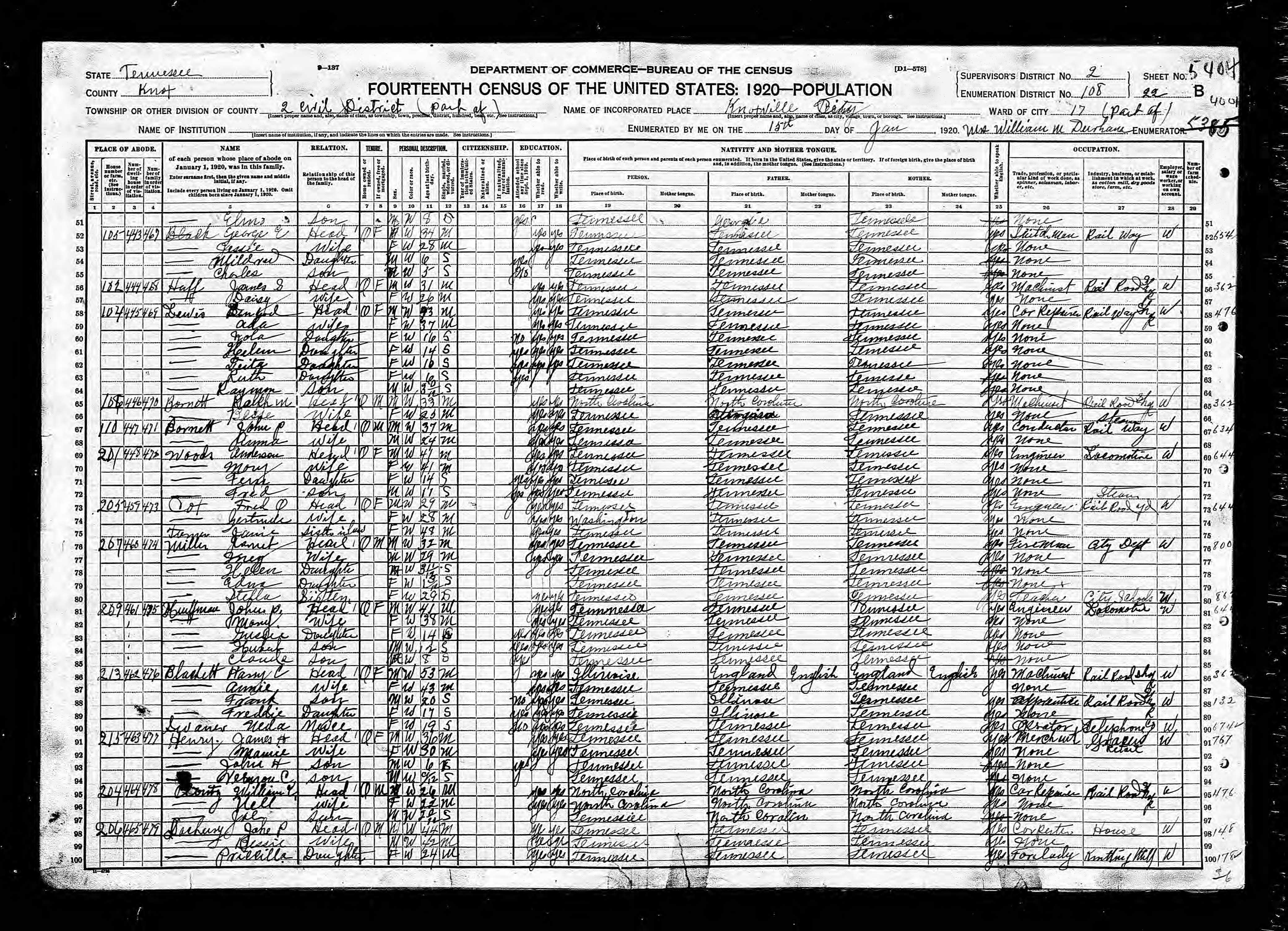 Dist. 2, Enumeration District 108, Knoxville City, Knox County, 15 Jan 1920