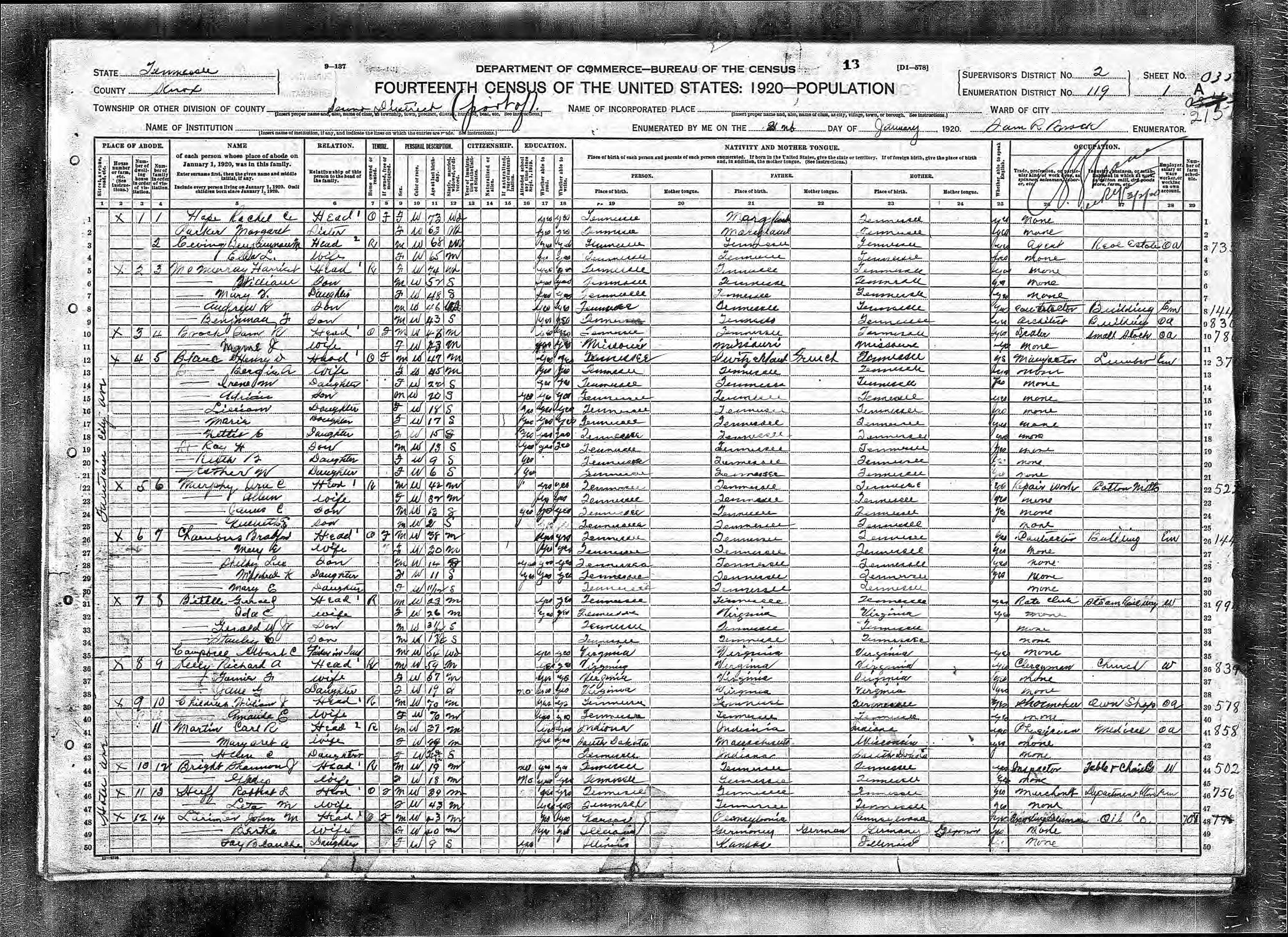 1920, Knox County, Tennessee, Dist. 2, Enumeration District 119, page 13a |