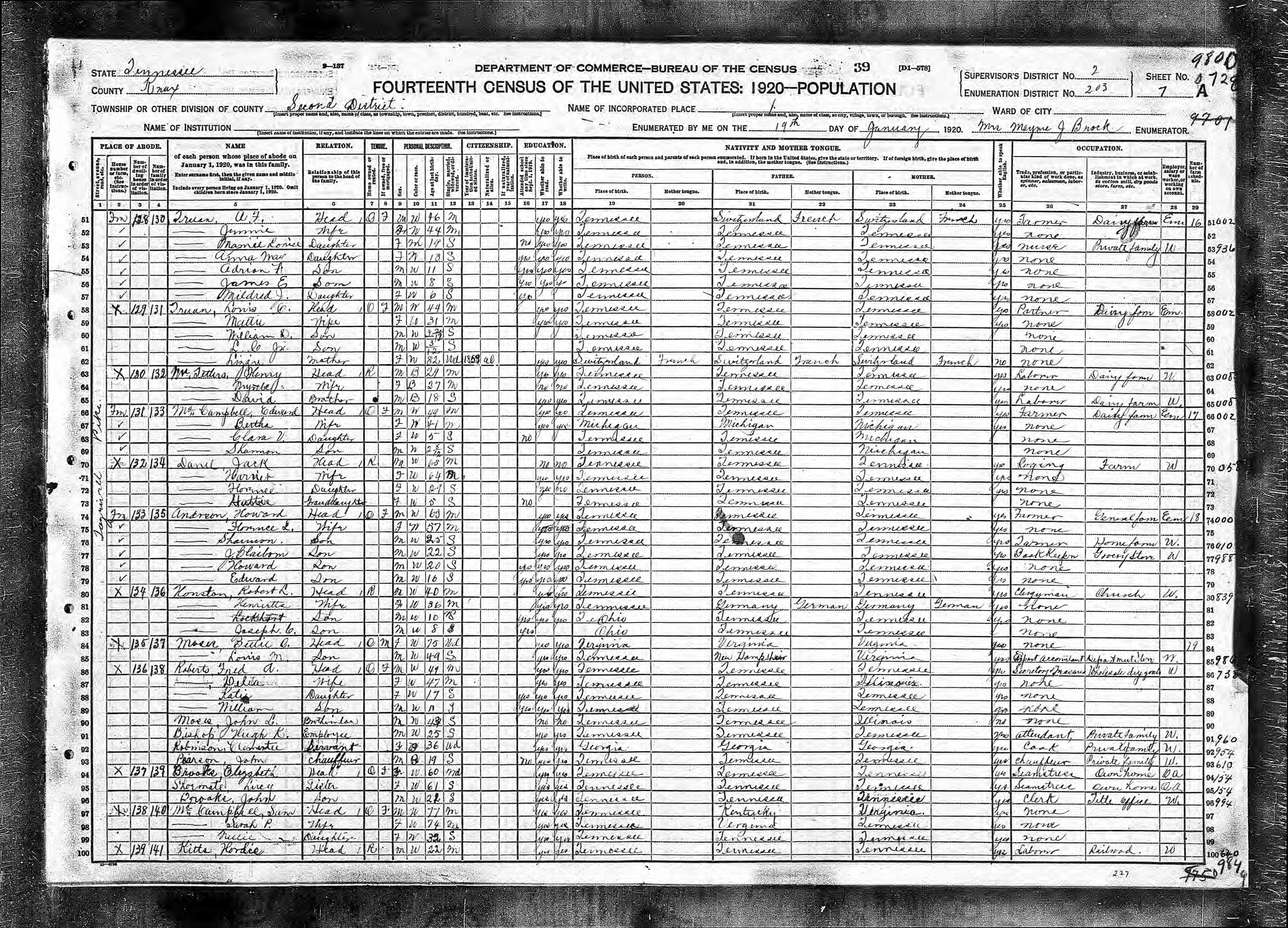 Dist. 10, Enumeration District 133, Knox County, Tennessee, 12, 13, & 14 Jan 1920