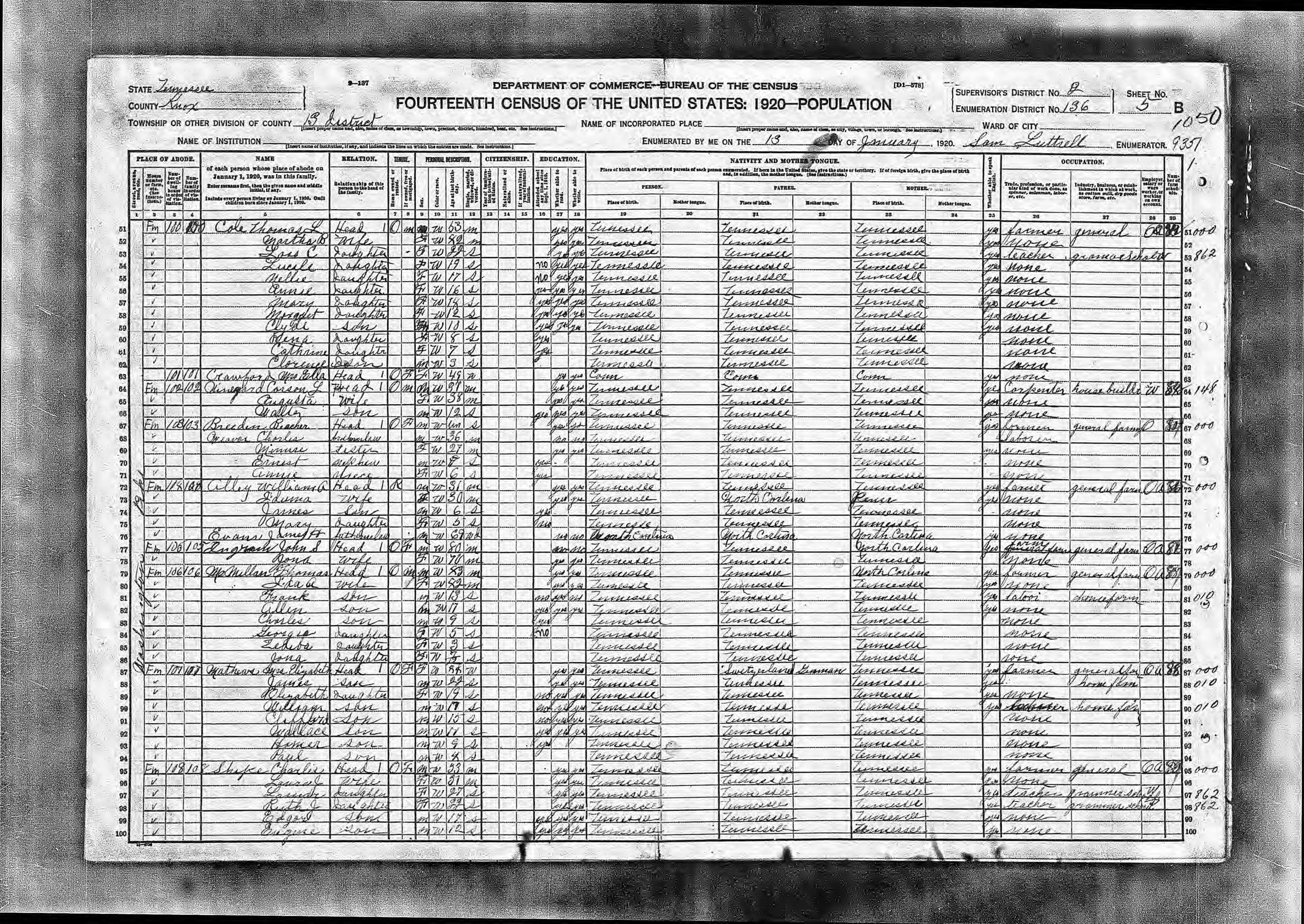 Enumeration District 136, Dist. 13, Knox County, Tennessee, 13 Jan 1920 page 189b, Washington Pike, dwelling number 100, family number 100 Cole Thomas L. 53 head m m w farmer TN TN TN Martha B. 40 wife f m w TN TN TN Loss C. 22 dau f s w teacher TN TN TN Lucile 19 dau f s w TN TN TN Nellie 17 dau f s w TN TN TN Annie 16 dau f s w TN TN TN Mary 14 dau f s w TN TN TN Margaret 12 dau f s w TN TN TN Clyde 10 son m s w TN TN TN Rena 8 dau f s w TN TN TN Catherine 7 dau f s w TN TN TN Clarence 3 son m s w TN TN TN |