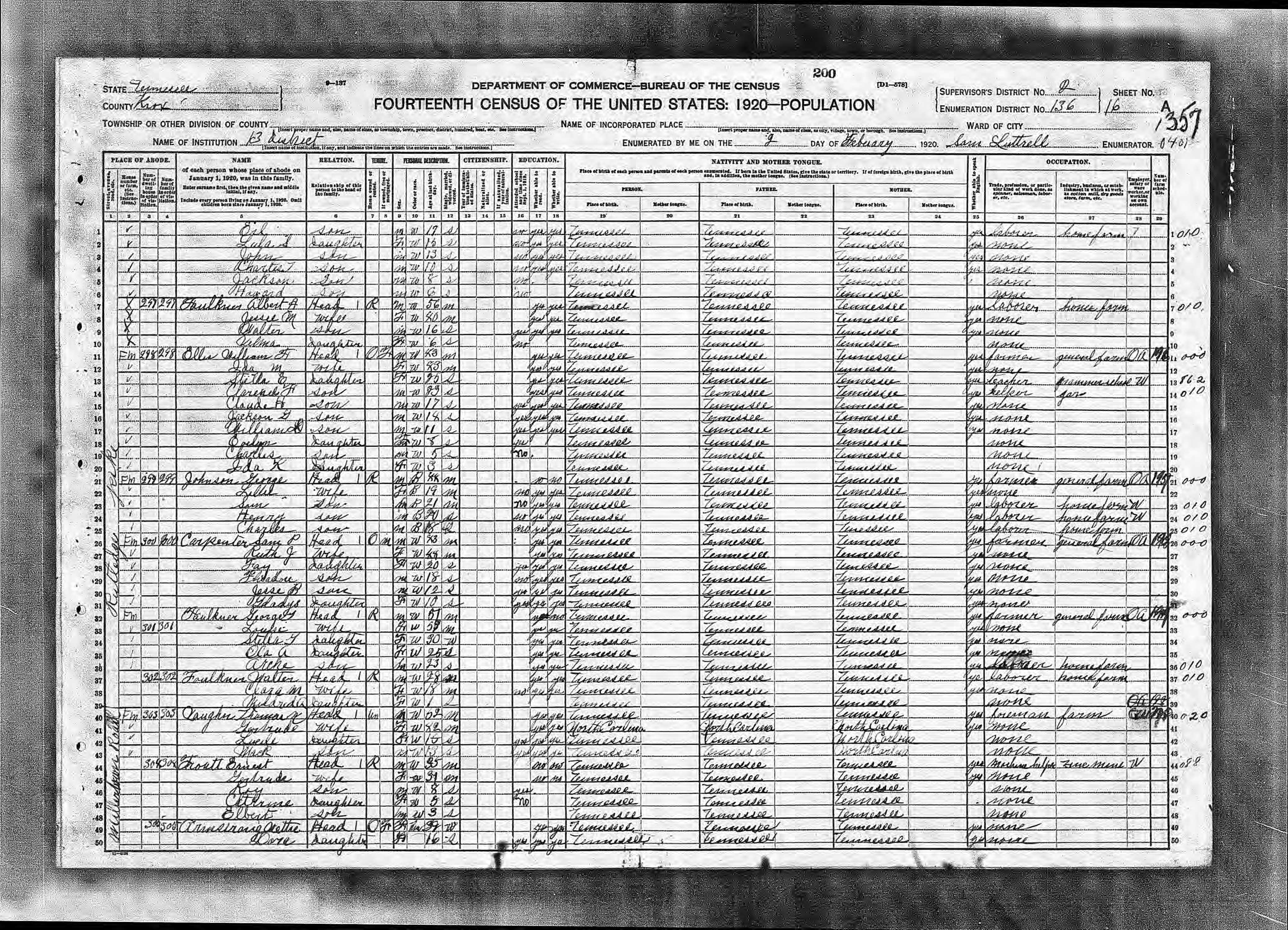 1920, Knox County, Tennessee, Enumeration District 136, Dist. 13, page 200a |
