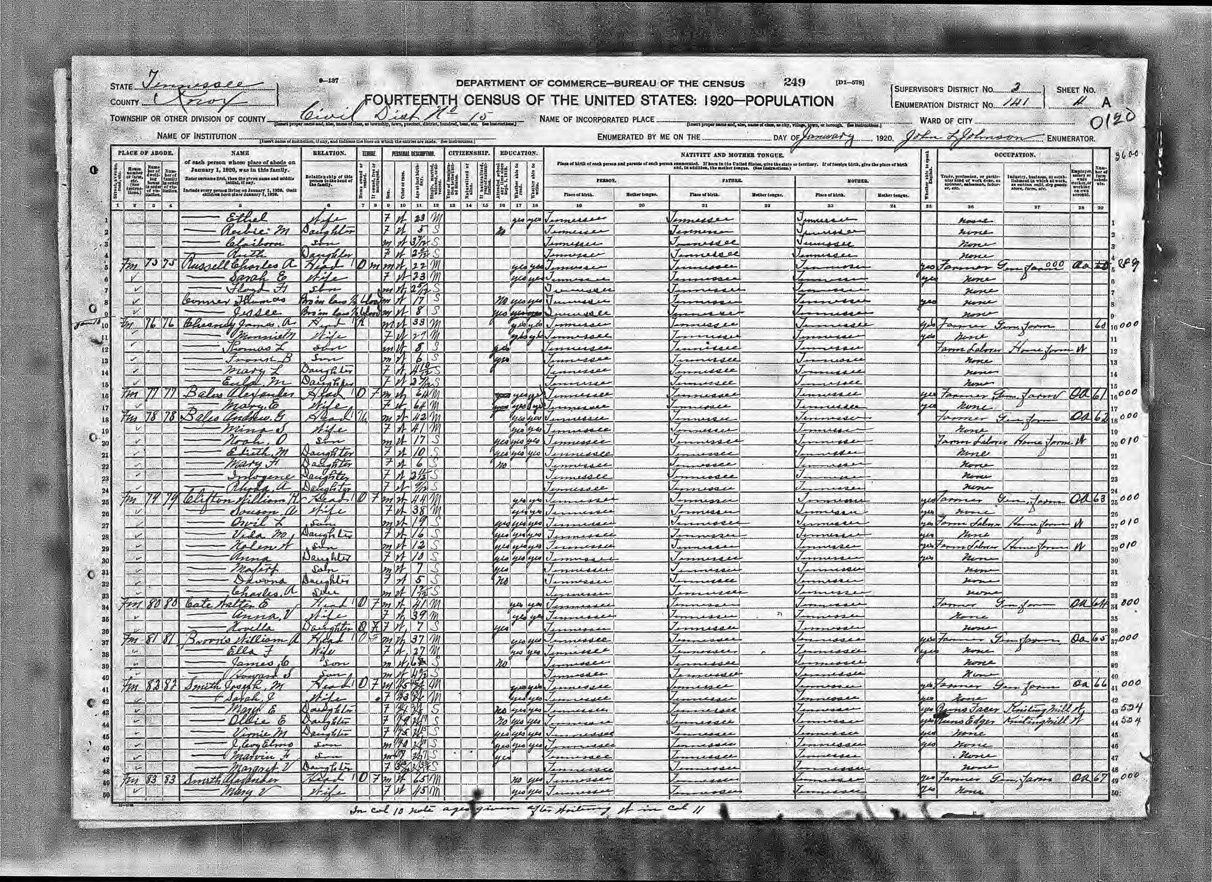 1920, Knox County, Tennessee, Dist. 15, Enumeration District 141, page 249a |